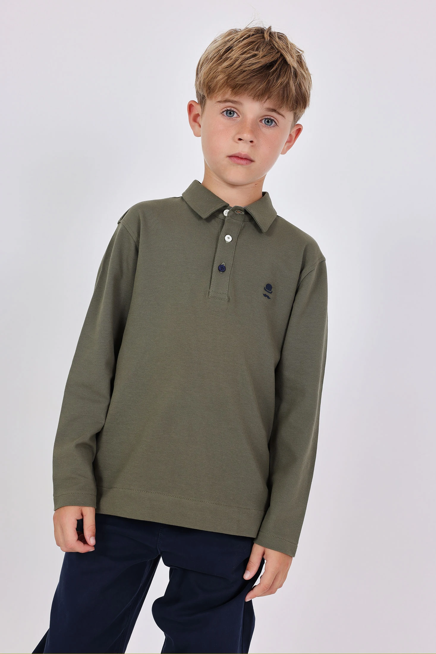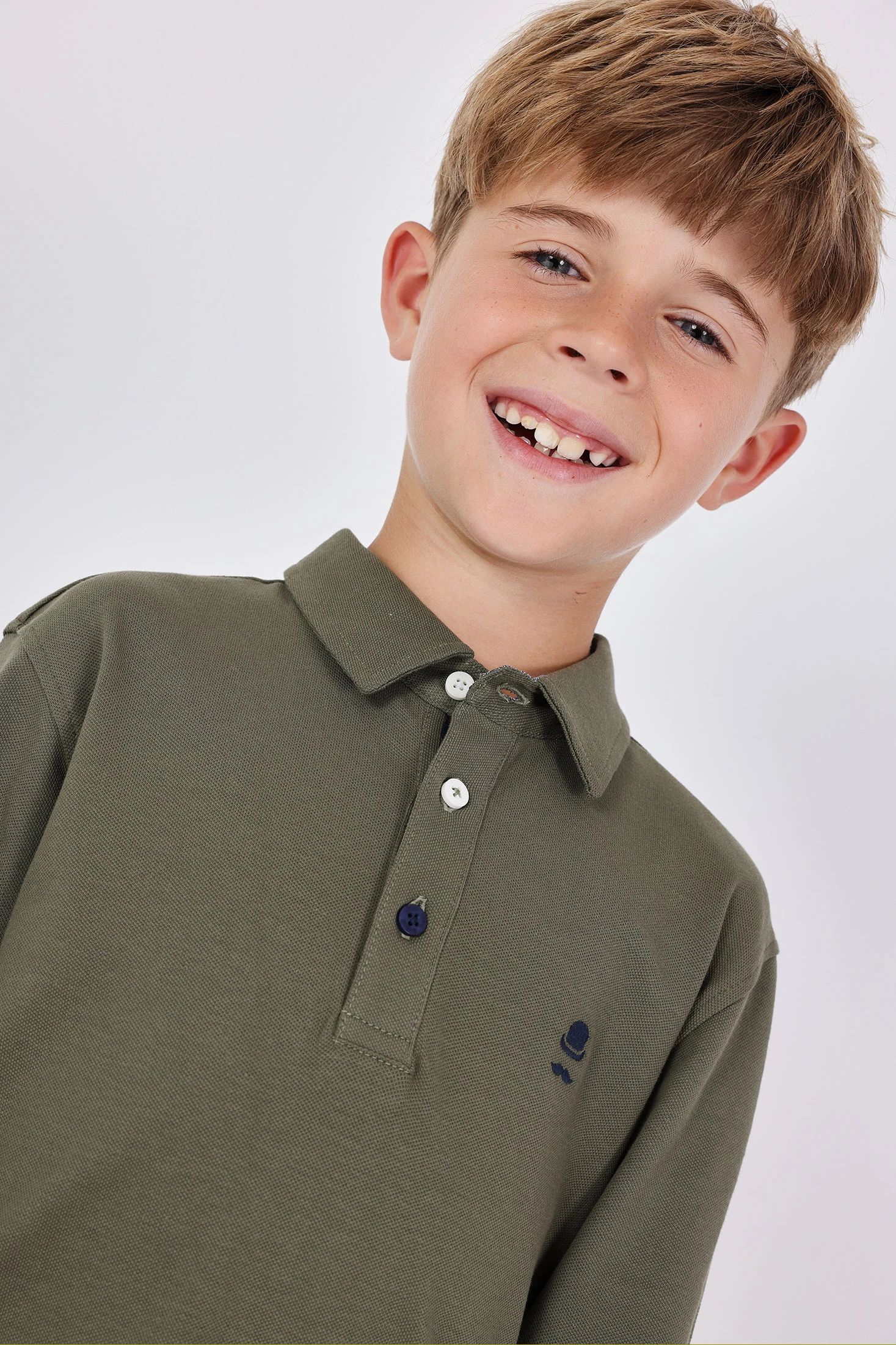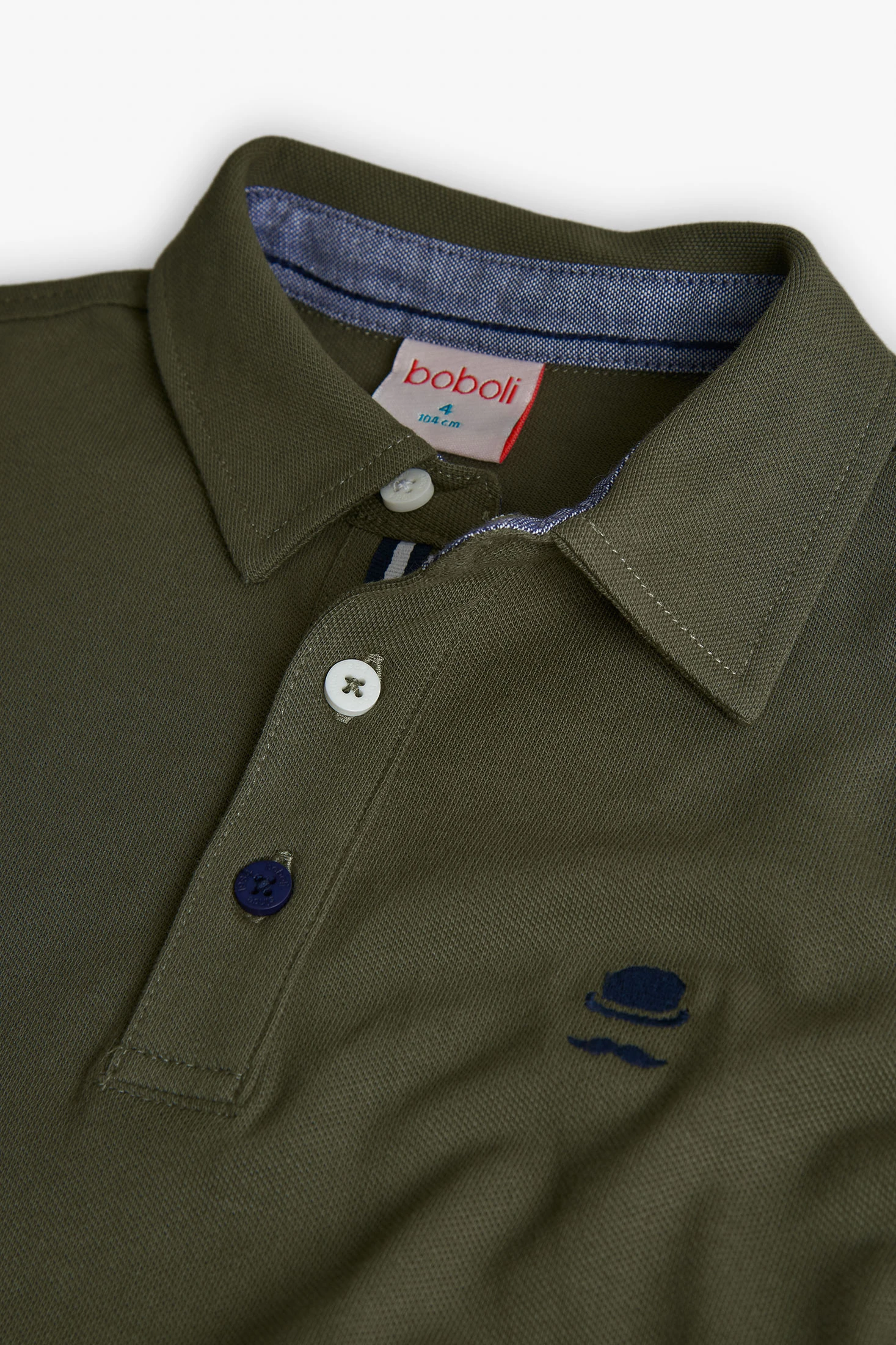 Polo per bambino in piqué color verde oliva, ideale per ogni stagione grazie al suo tessuto leggero e traspirante. Si distingue per la sua morbidezza e durata, perfetto per l'uso quotidiano dei più piccoli. Disponibile nelle taglie da 2 a 14 anni, si abbina facilmente con pantaloncini o jeans per un look casual, o con pantaloni più formali per eventi speciali. Il dettaglio di un piccolo logo ricamato sul petto aggiunge un tocco distintivo e moderno.