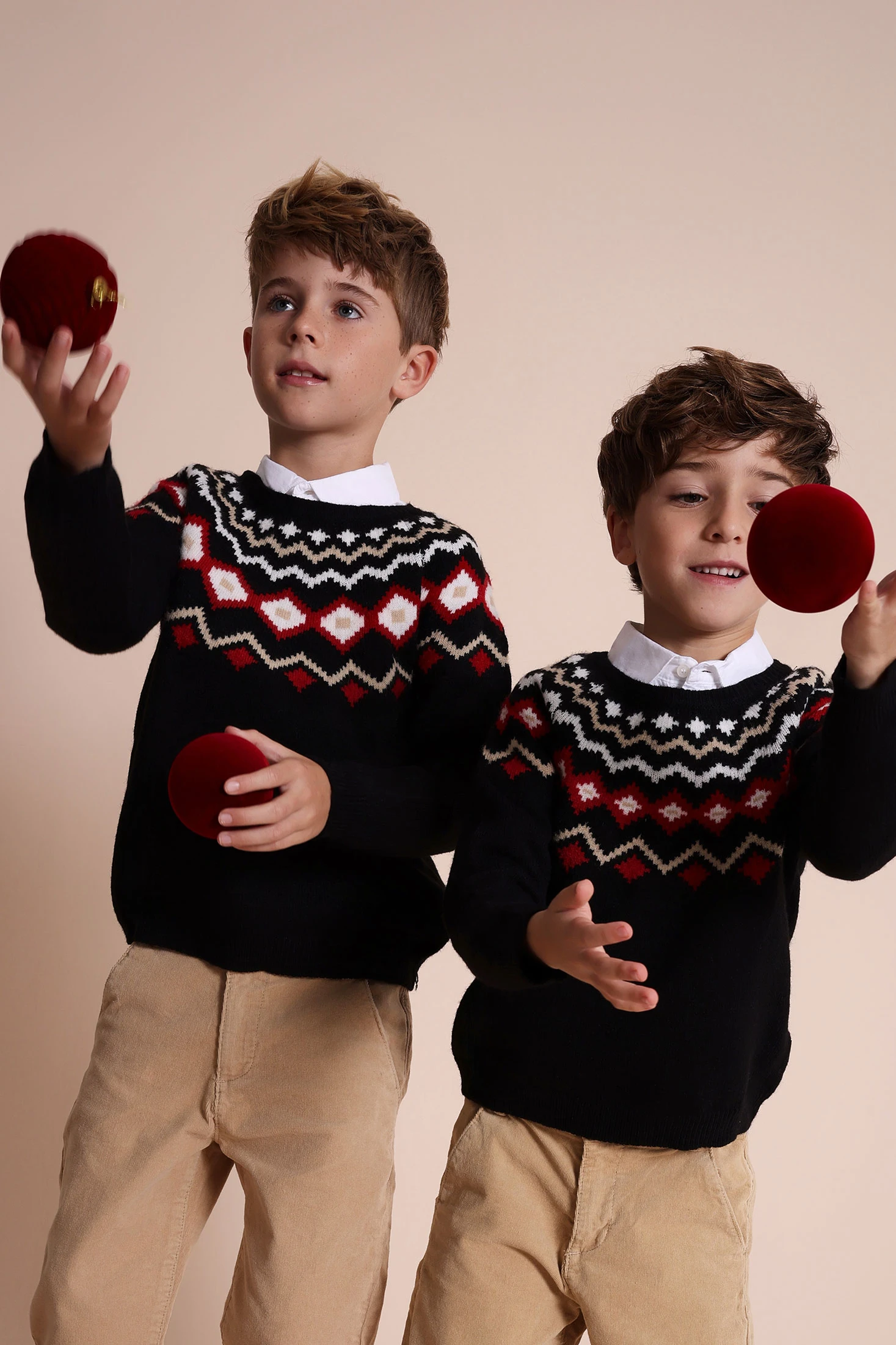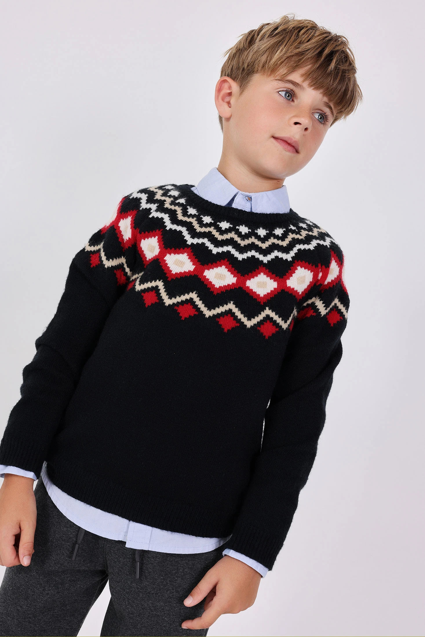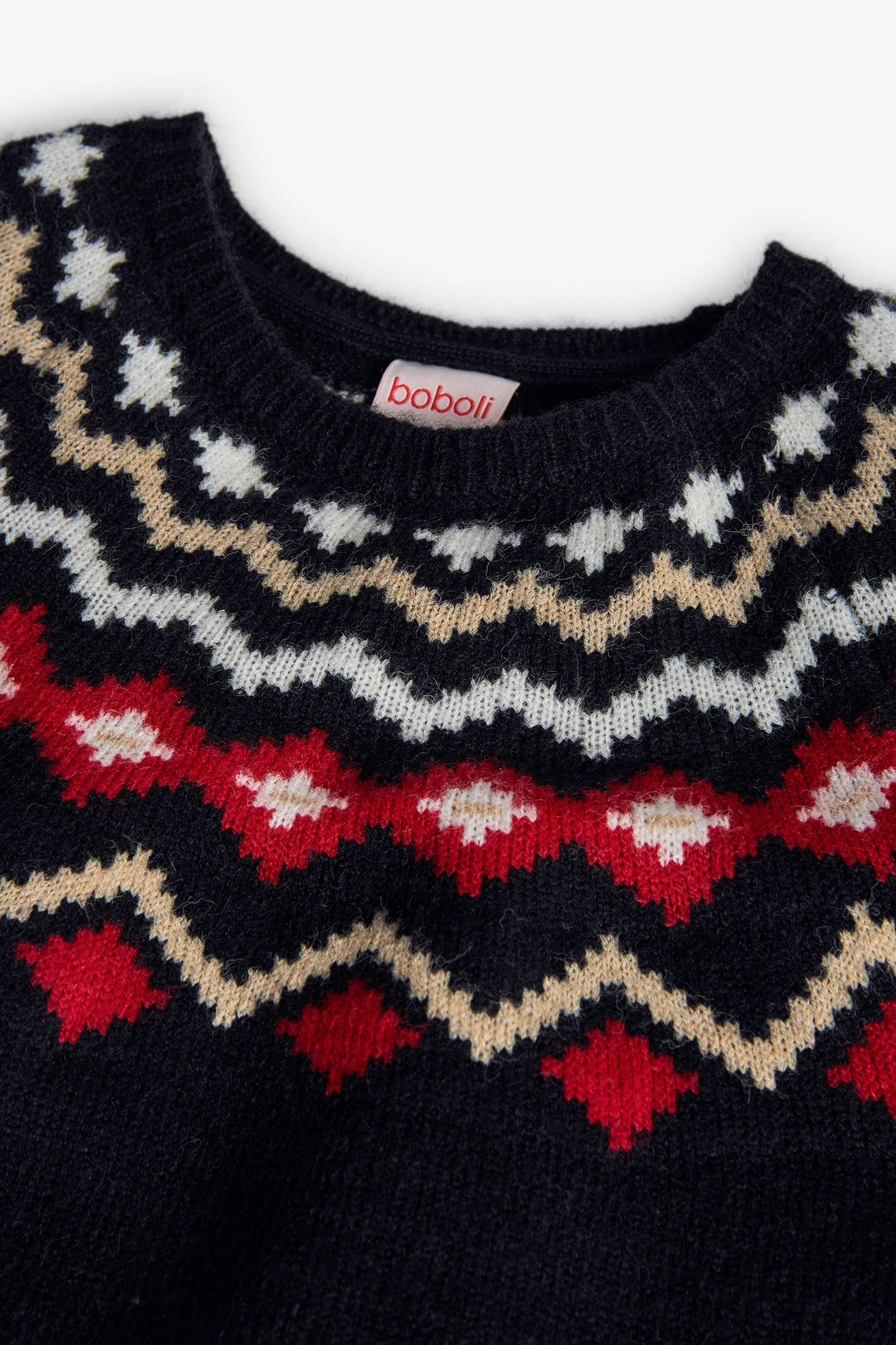 Maglione a maglia per bambino di colore nero con stampa geometrica, ideale per le stagioni autunnali e invernali. Un motivo di forme geometriche in tonalità rosse, bianche e crema risalta sullo sfondo scuro. Realizzato in un tessuto morbido e caldo, garantisce il massimo comfort nei giorni freddi. Il suo design con collo rotondo e maniche lunghe è disponibile in taglie che vanno dai 2 ai 14 anni. Perfetto da abbinare a pantaloni casual o jeans, integrando uno stile moderno ed elegante nel guardaroba infantile.