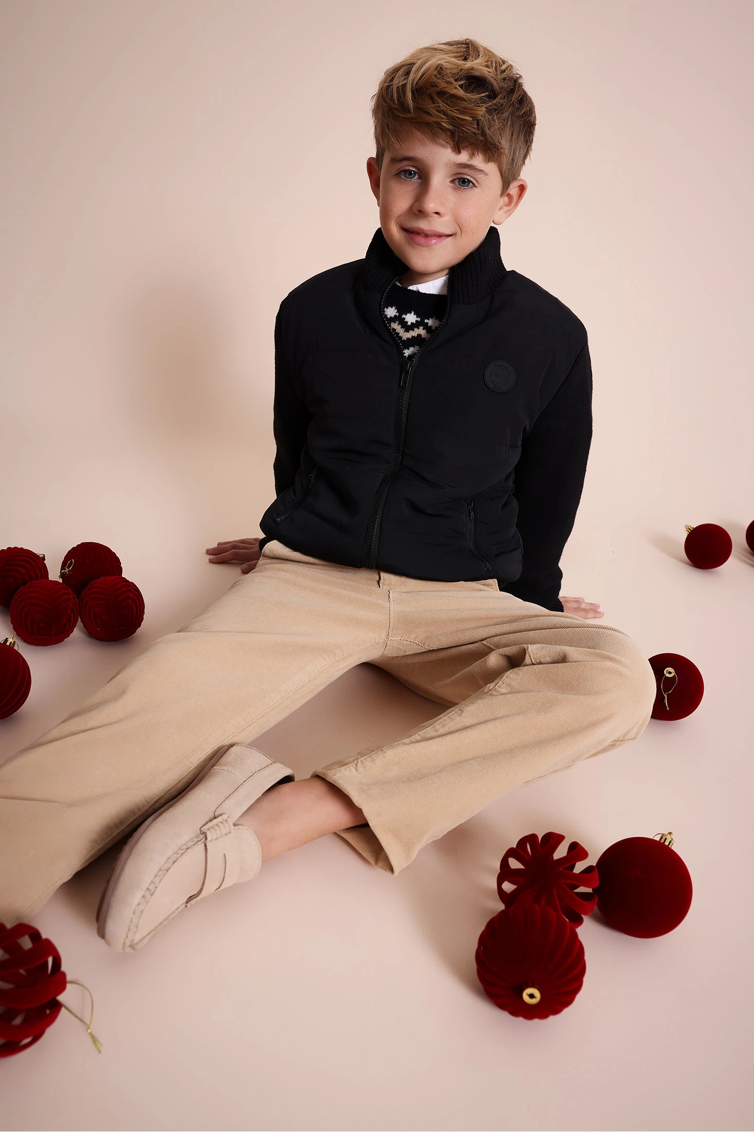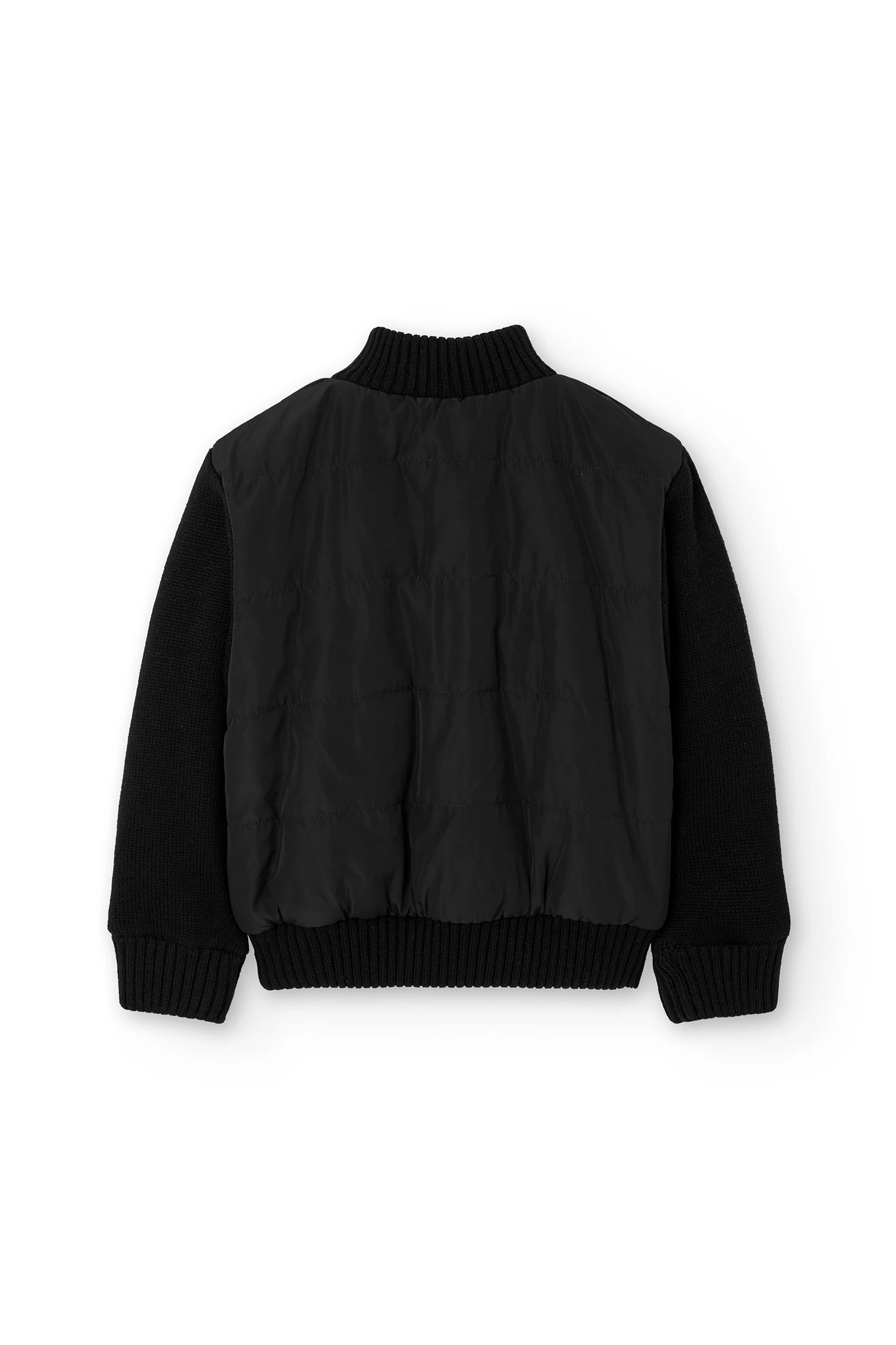 Giacca in maglia per bambino di colore nero, perfetta per le stagioni autunnali e invernali, offre calore e comfort grazie al suo tessuto a maglia. Il suo design nero presenta un collo alto a coste e maniche aderenti, garantendo una vestibilità comoda. Dotata di chiusura frontale con cerniera e tasche laterali funzionali, è disponibile in taglie dalla 2 alla 14. È un complemento versatile che si abbina facilmente a diversi capi, diventando un elemento essenziale per il guardaroba dei bambini.