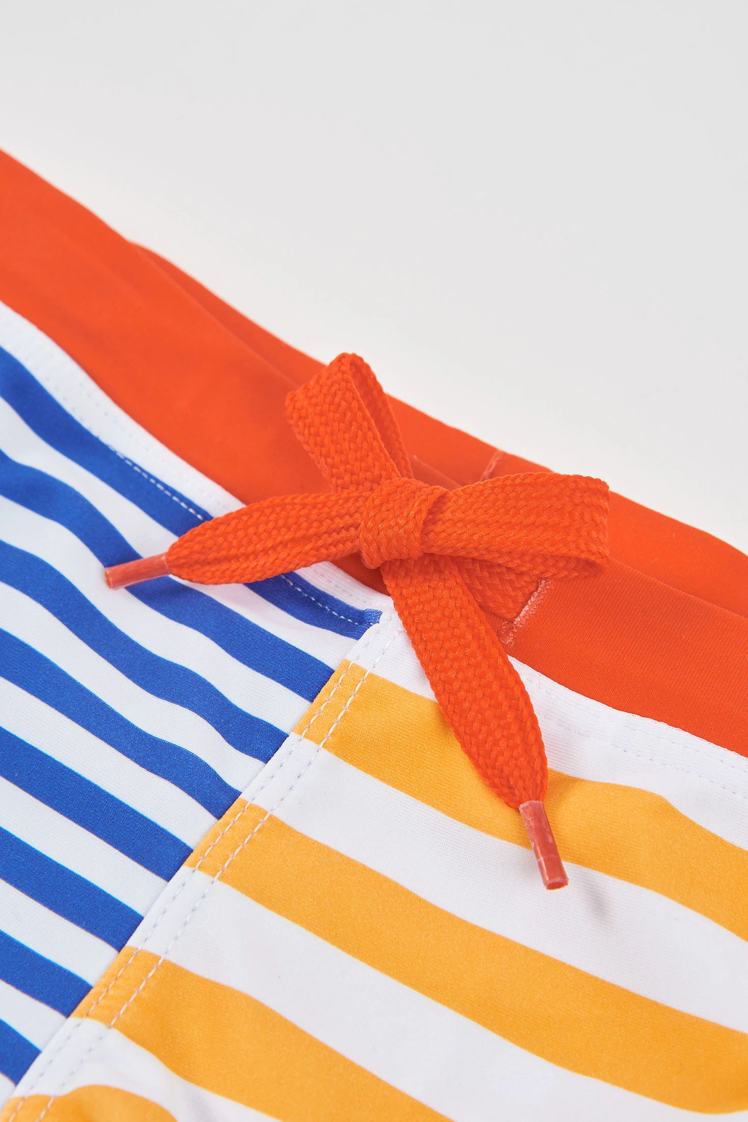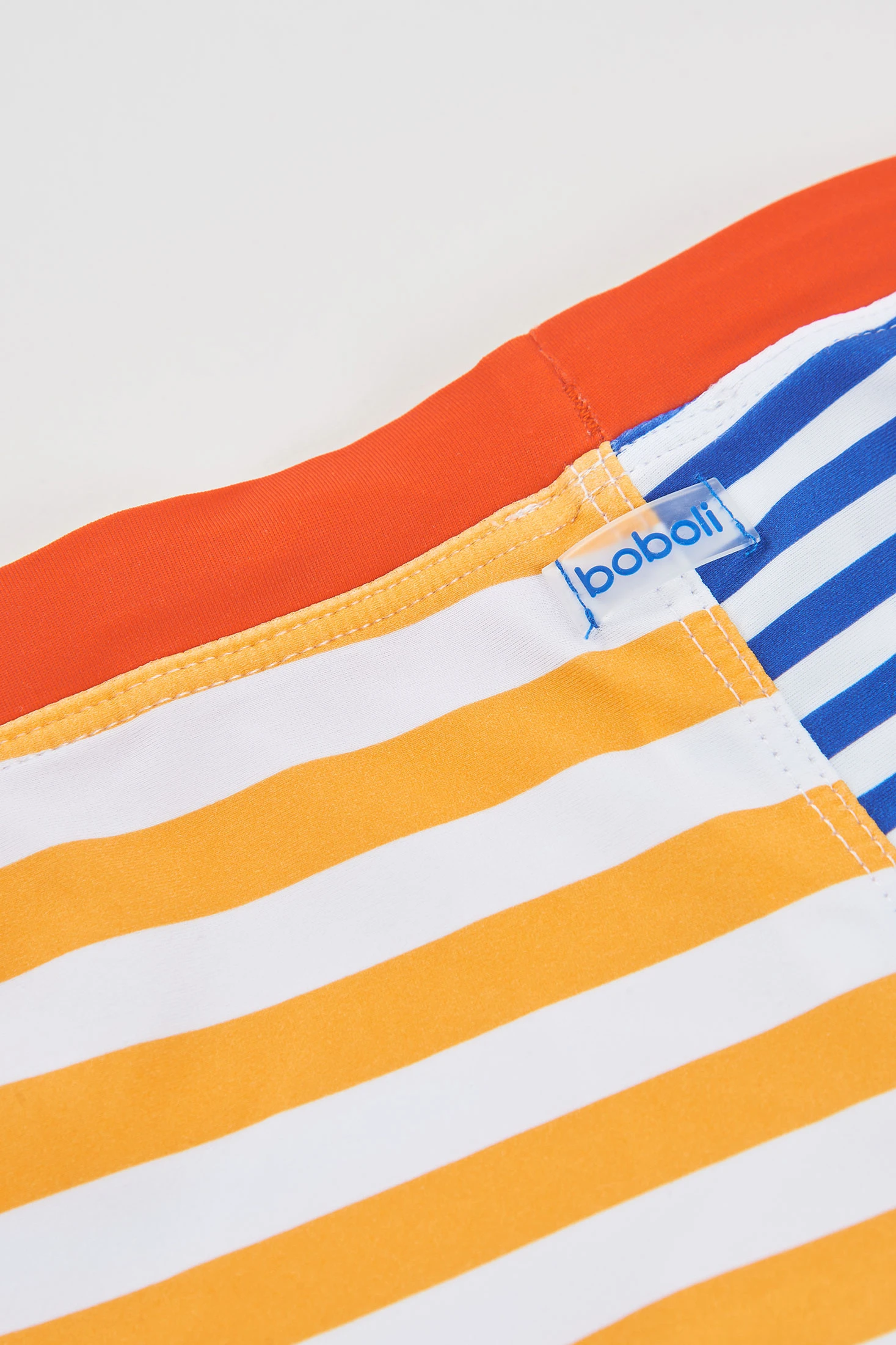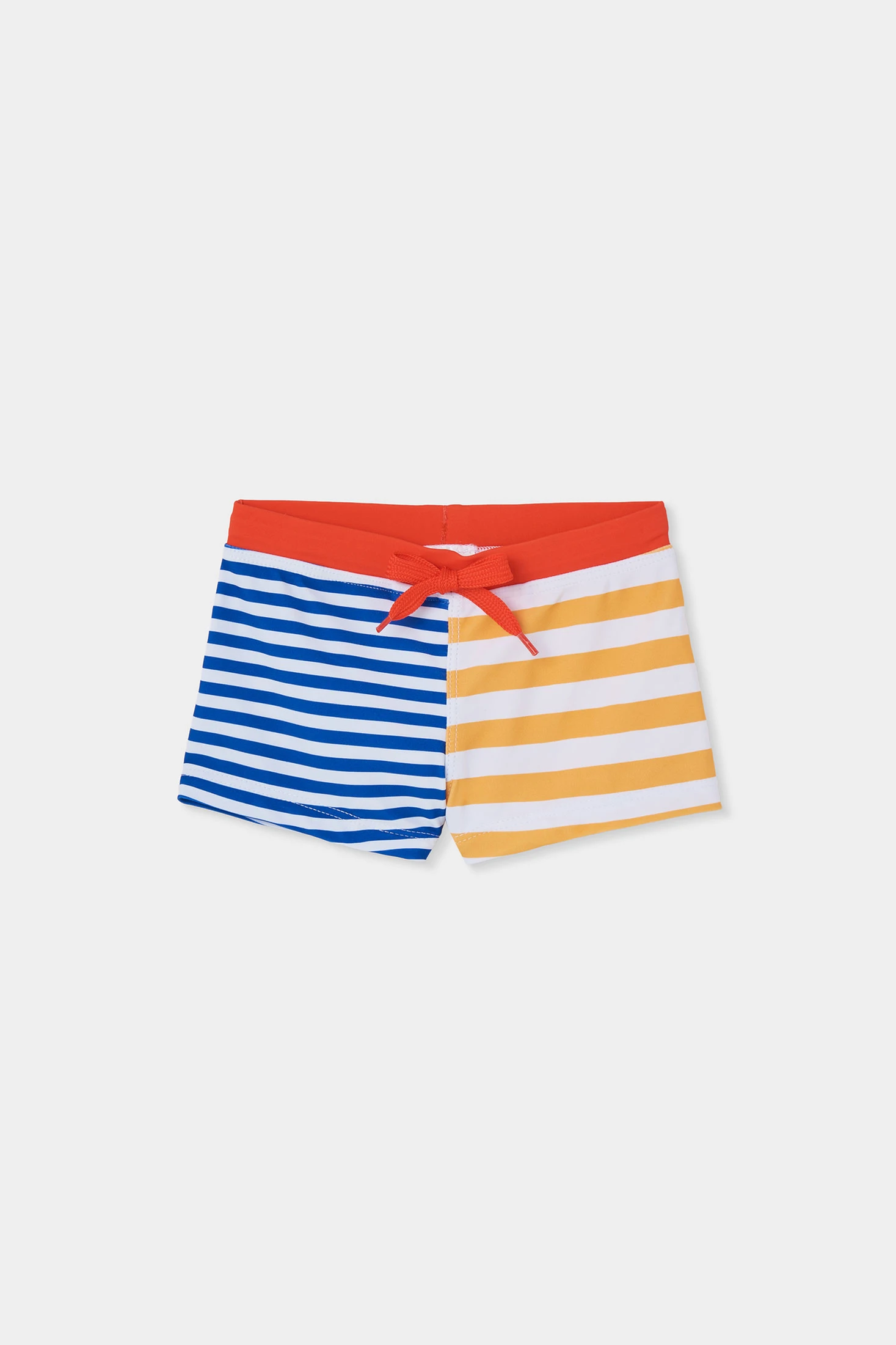 Costume da bagno per bambino con protezione solare certificata UPF50+, con un moderno design a righe in toni blu e arancione, perfetto per le giornate di piscina o spiaggia. Realizzato in tessuto leggero in poliammide e ad asciugatura rapida, garantisce comfort e freschezza. La sua cintura elastica con cordoncino regolabile assicura una vestibilità salda e comoda. Disponibile nelle taglie dai 2 ai 14 anni.