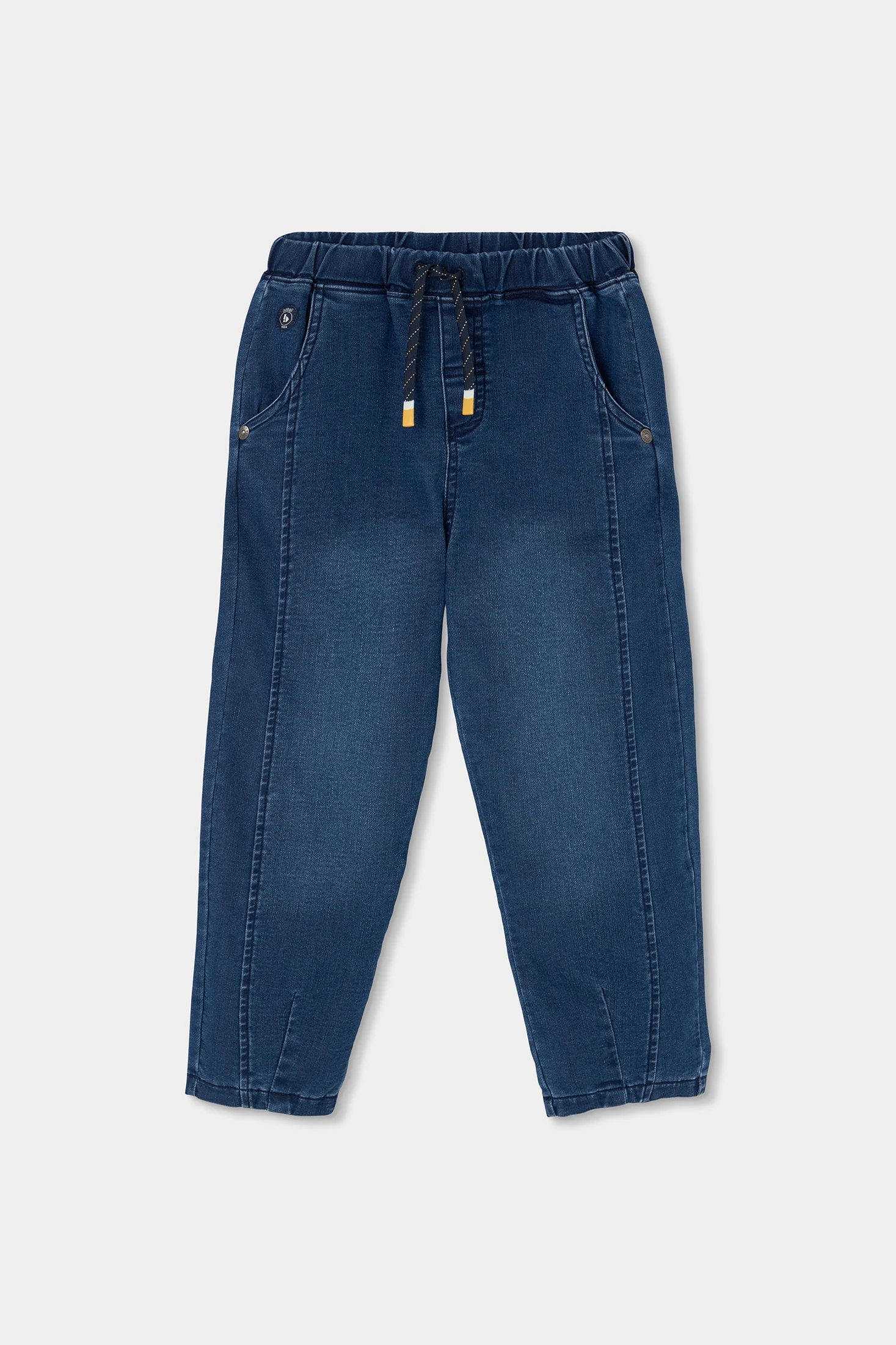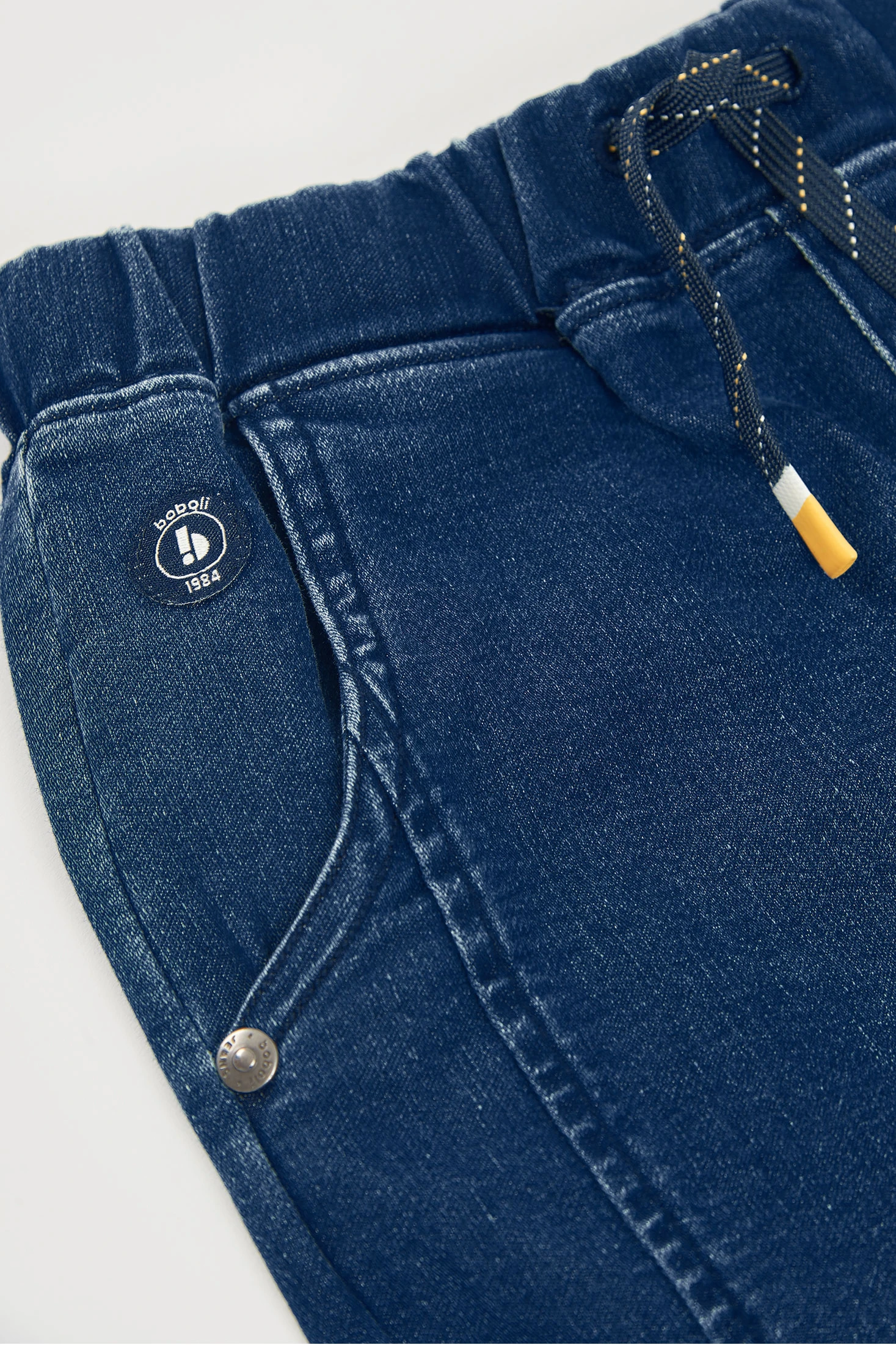 Pantalone denim blu scuro per bambino. Presenta un design semplice con vita elastica e cordoncino regolabile, facilitando l'adeguamento per un maggior comfort. Perfetto per attività quotidiane, combina stile e funzionalità. Disponibile nelle taglie da 12 mesi fino a 10 anni, si adatta alla crescita del tuo piccolo. Un'opzione versatile e moderna, facilmente abbinabile per qualsiasi occasione.