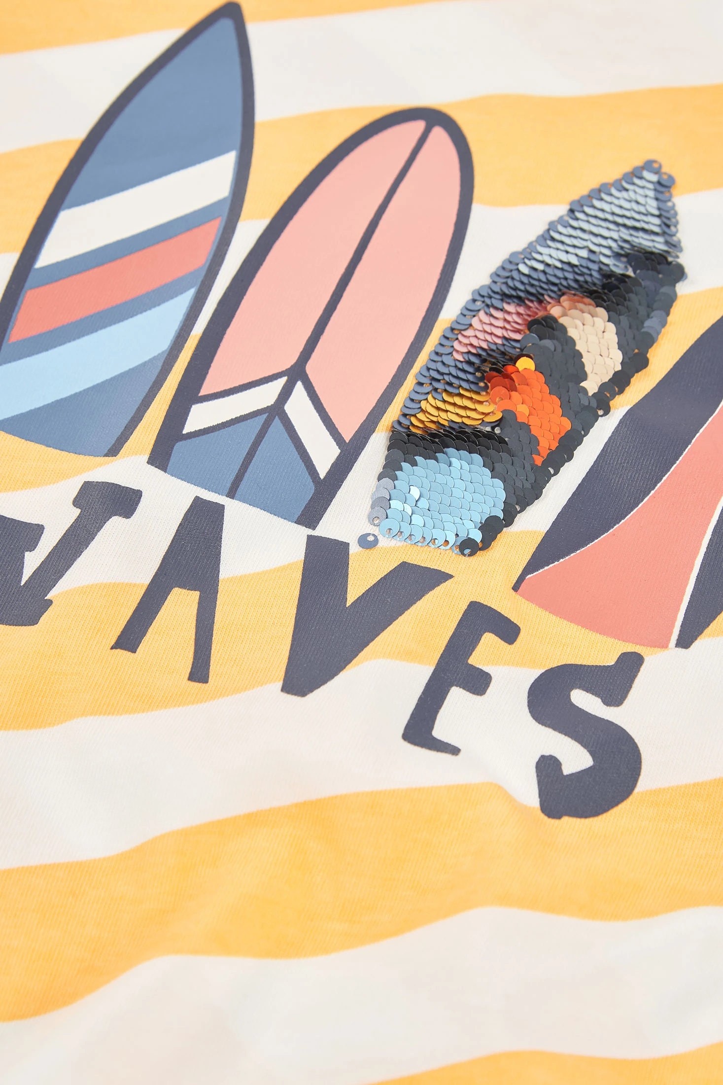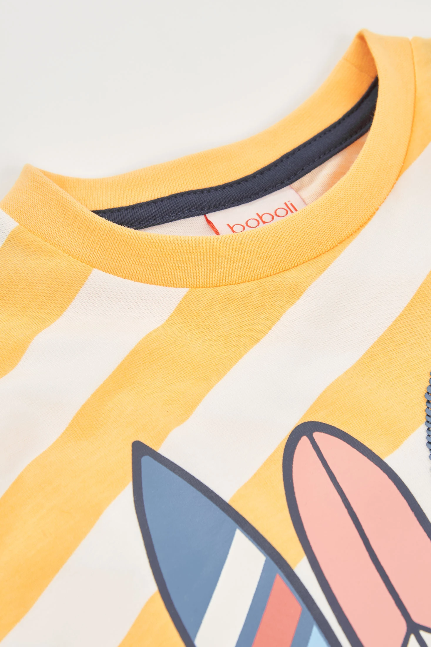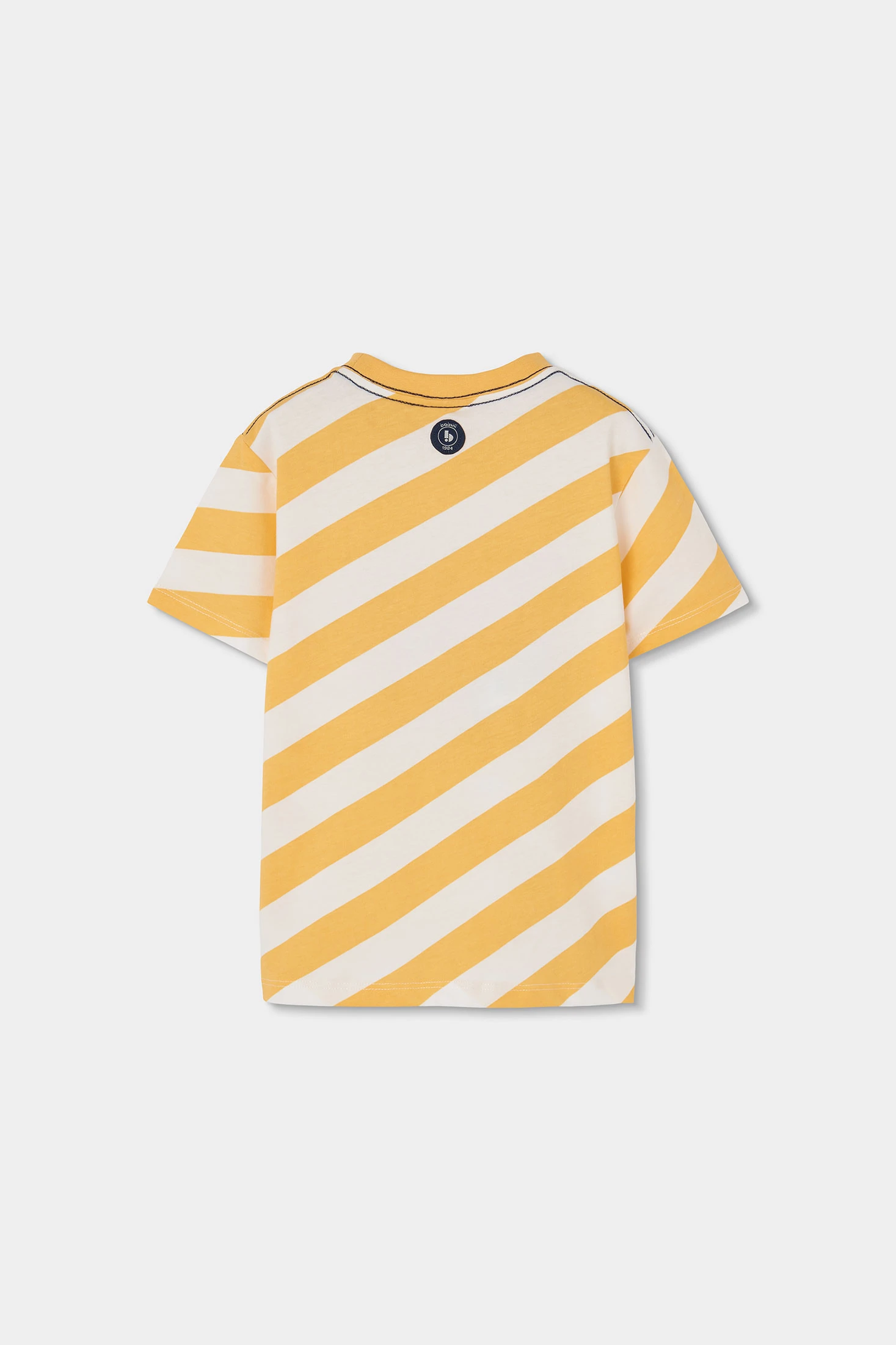 Maglietta in maglia per bambino ideale per l'estate, con un design a righe diagonali in giallo e bianco che apporta freschezza. Al centro, presenta una stampa divertente di tavole da surf. Il materiale di maglia è morbido e comodo, perfetto per l'uso quotidiano. Disponibile in taglie da 12 mesi a 10 anni, si adatta alla crescita dei bambini. Si abbina perfettamente con jeans o pantaloncini per uno stile casual e disinvolto.