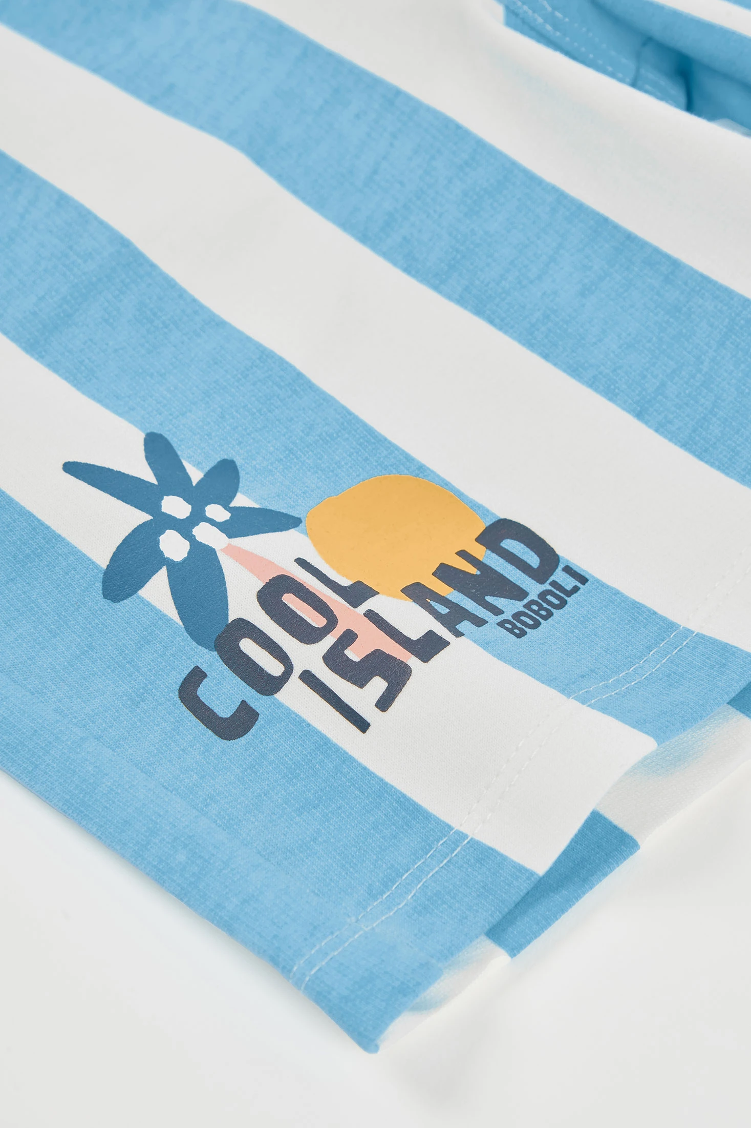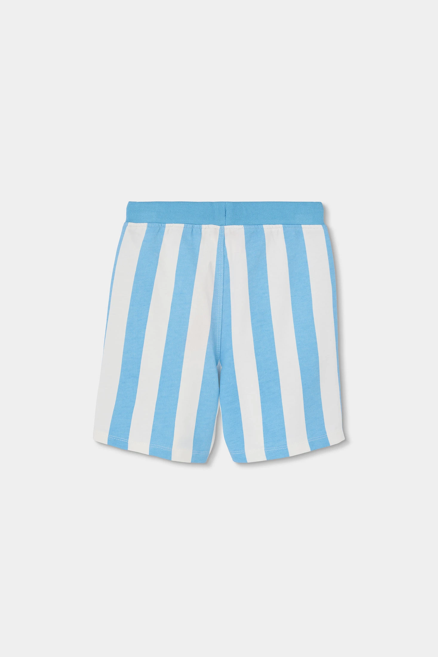 Bermuda in felpa a righe per bambino, perfetta per la stagione estiva, con un design a righe verticali in blu e bianco che si distingue per il suo stile fresco e moderno. Il materiale morbido assicura comfort per tutto il giorno. Include una vita elastica con cordoncino regolabile, che garantisce una vestibilità perfetta. Disponibile nelle taglie da 12 mesi a 10 anni. Ideale da abbinare a magliette casual per un look rilassato e divertente nei giorni di sole.