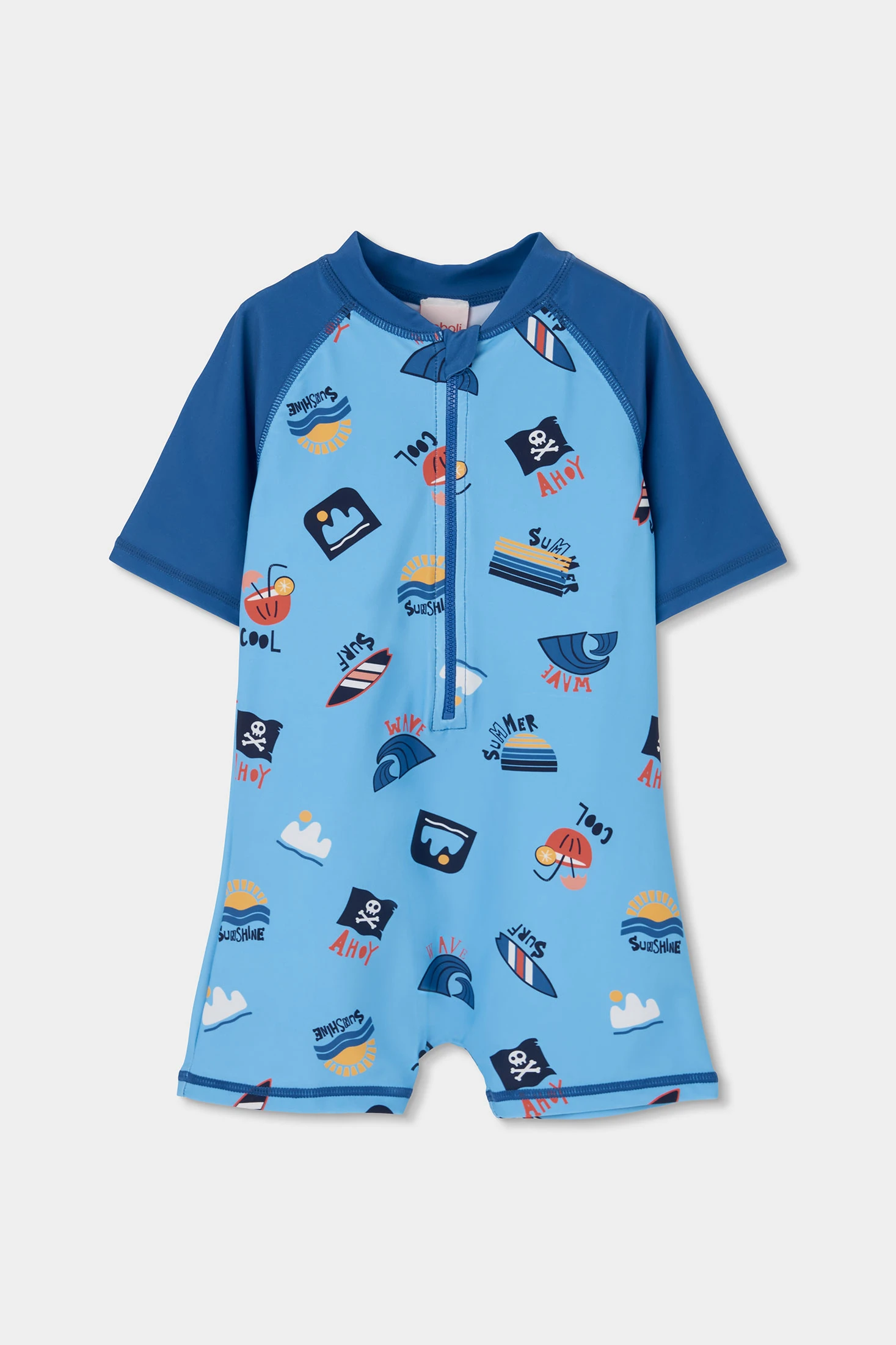 Pagliaccetto stampato per bambini, perfetto per i mesi estivi. Presenta un design colorato con disegni di barche, onde e bandiere dei pirati. Disponibile nelle taglie da 12 mesi a 10 anni, si adatta a varie fasi di crescita. Il suo colore blu vibrante aggiunge un tocco fresco e divertente. Pagliaccetto con maniche corte e chiusura frontale con cerniera, offrendo comodità e praticità. Ideale per giornate in spiaggia o in piscina, garantendo divertimento e stile. Indumento con protezione solare UPF50.