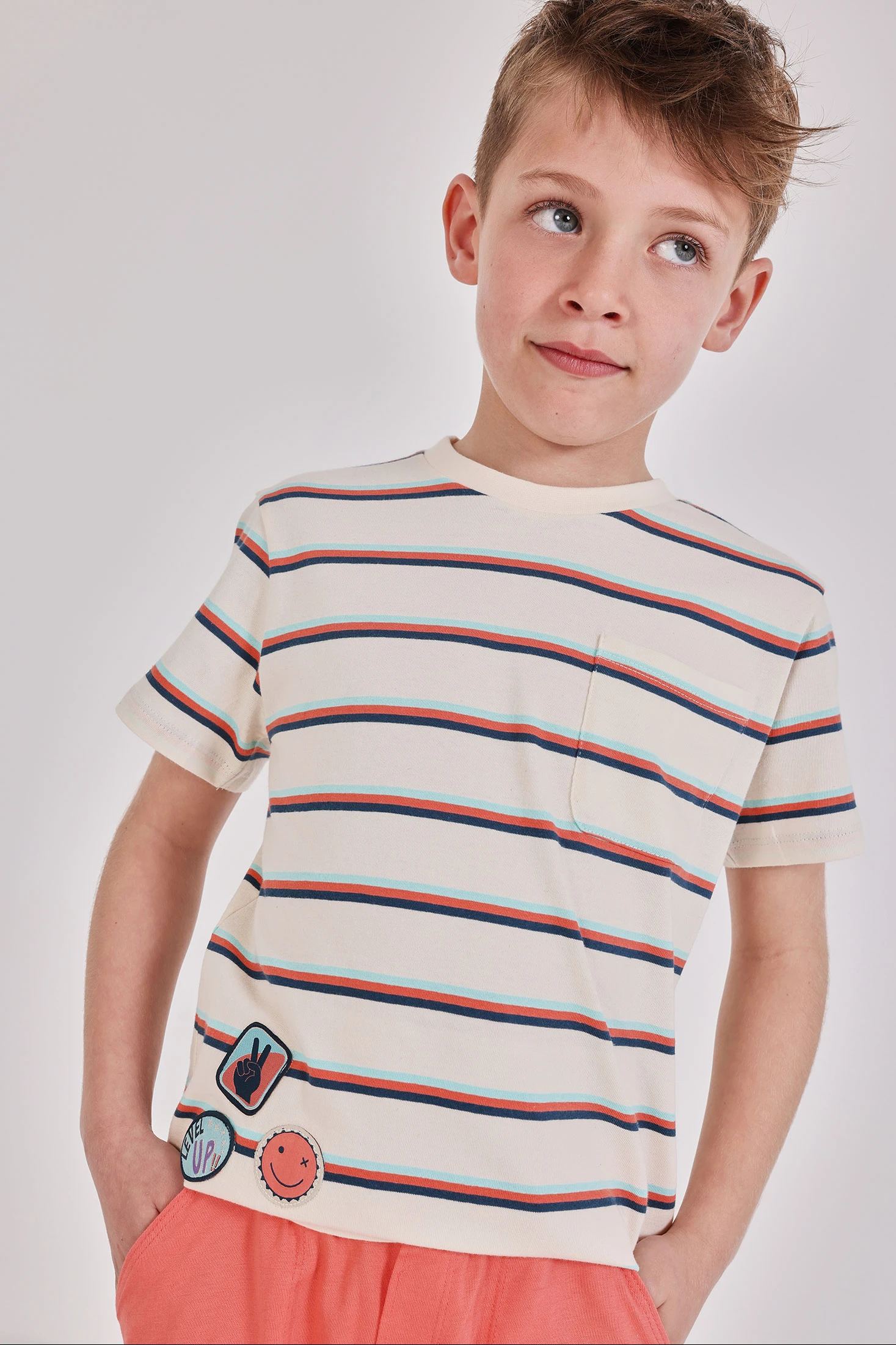 Maglietta a maglia per bambino ideale per tutte le stagioni. Realizzata in un tessuto di maglia morbido e comodo, presenta un design a righe orizzontali multicolori su uno sfondo chiaro. Include dettagli di etichette come decorazione, conferendo un tocco unico. Il suo collo rotondo e le maniche corte la rendono perfetta per l'uso quotidiano. Disponibile in taglie da 12 mesi a 10 anni, è un capo versatile che si abbina facilmente con jeans o pantaloncini per un look casual e moderno.