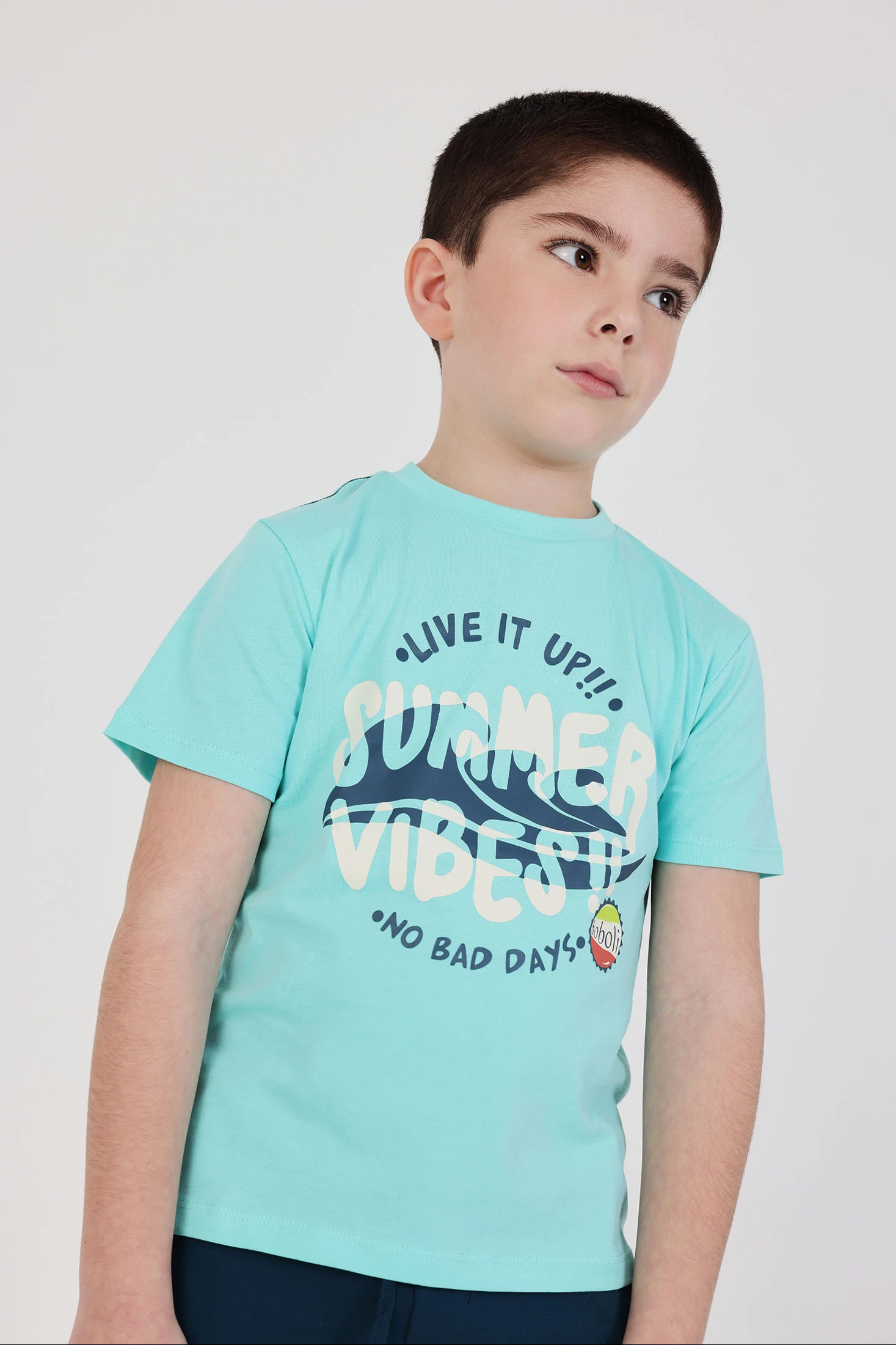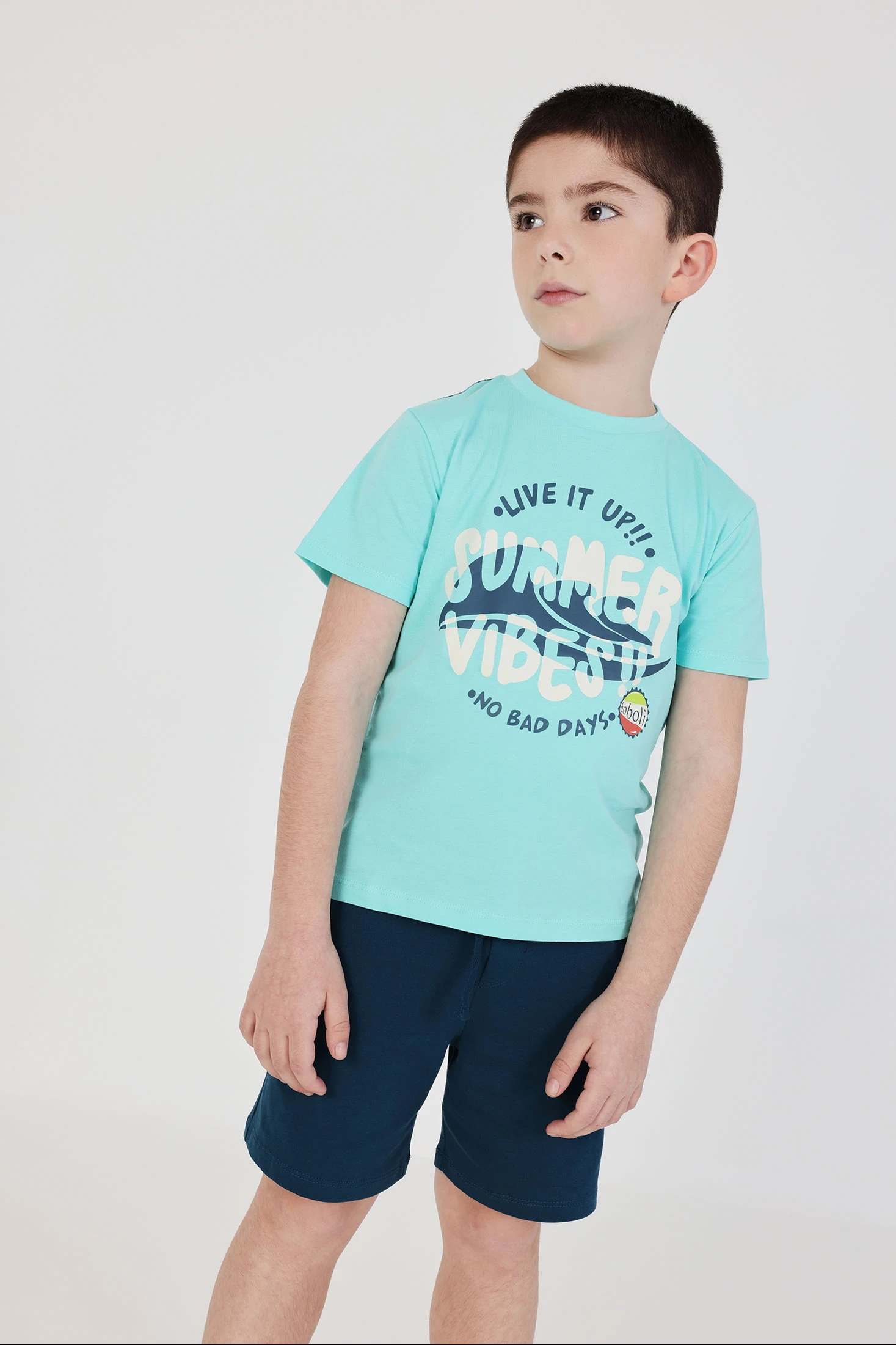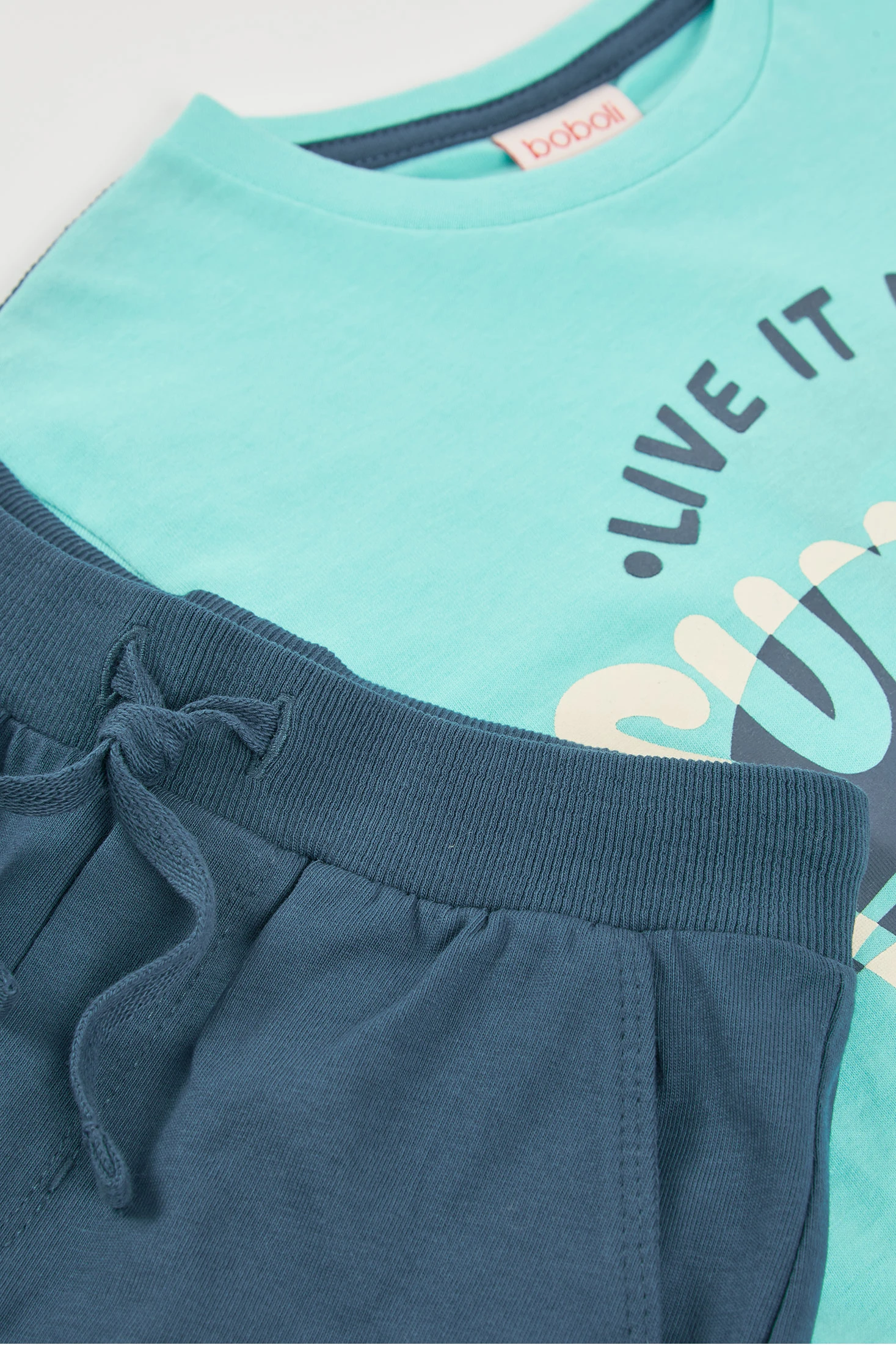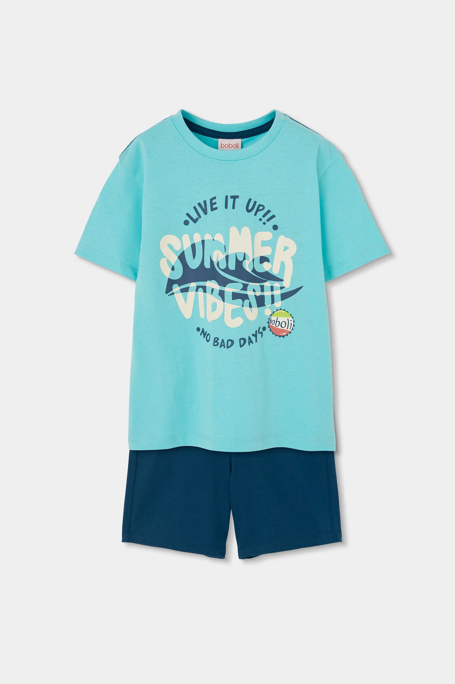 Completo in cotone per bambino, ideale per l'estate grazie al suo tessuto fresco e comodo. La maglietta è di colore celeste, con una divertente stampa sul davanti con frasi ed elementi grafici che evocano una sensazione giovanile e vibrante. Ha un collo rotondo e maniche corte, perfette per i giorni caldi. I pantaloncini sono leggeri in colore blu navy. È disponibile in taglie da 12 mesi a 10 anni. È un completo versatile, leggero per un look estivo casual.