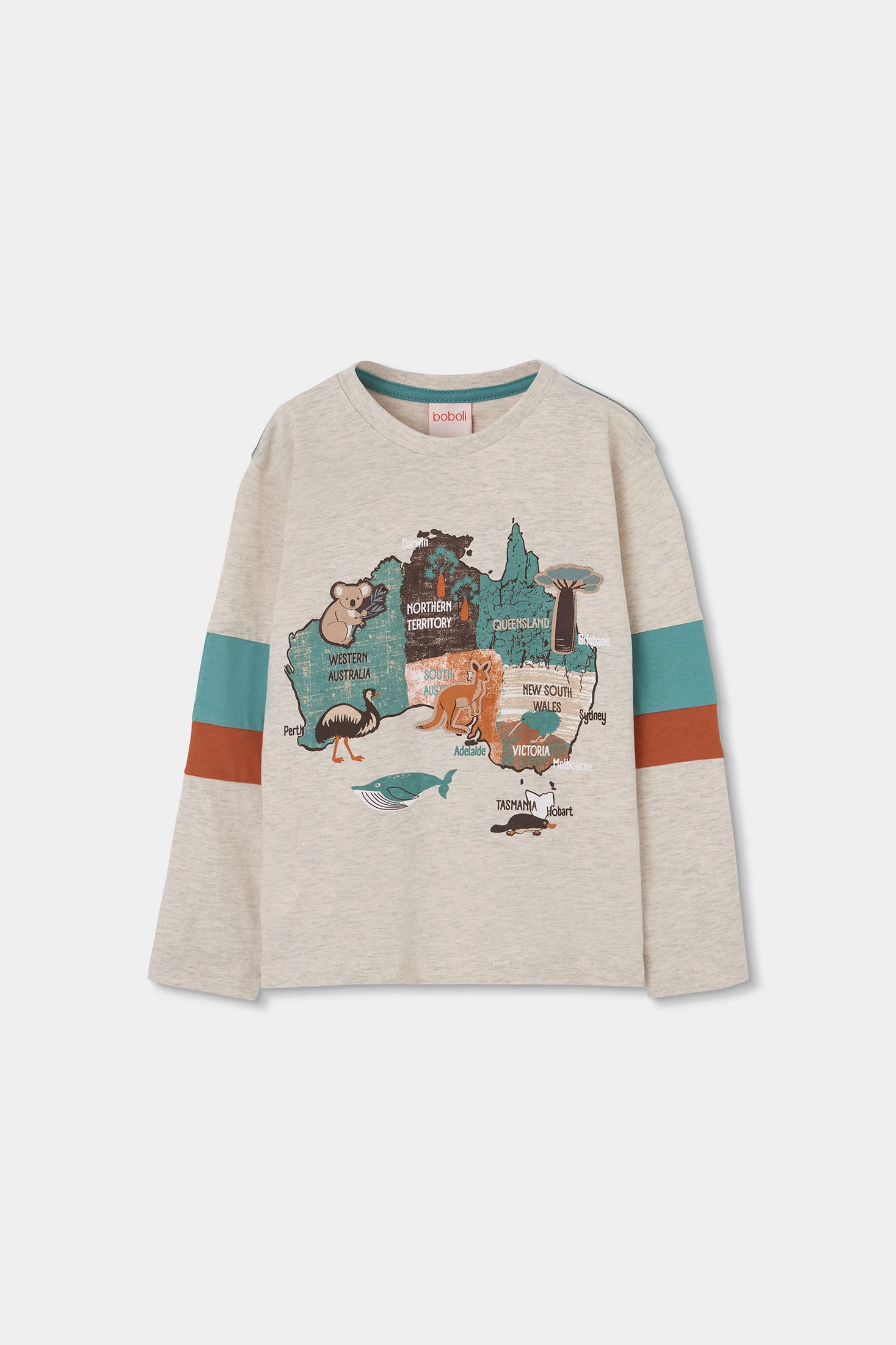 Maglietta a maniche lunghe in maglia per bambino realizzata in cotone beige, perfetta per i giorni più freschi d'estate e primavera. Presenta una stampa colorata con disegni di animali. Realizzata in un tessuto morbido, garantisce comfort e flessibilità per l'uso quotidiano. Disponibile in taglie da 12 mesi fino a 10 anni. Il suo design è versatile, ideale da abbinare a jeans o pantaloni casual, aggiungendo un tocco divertente a qualsiasi outfit.