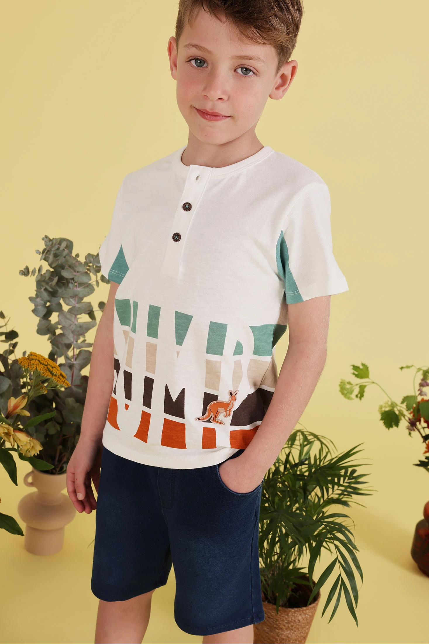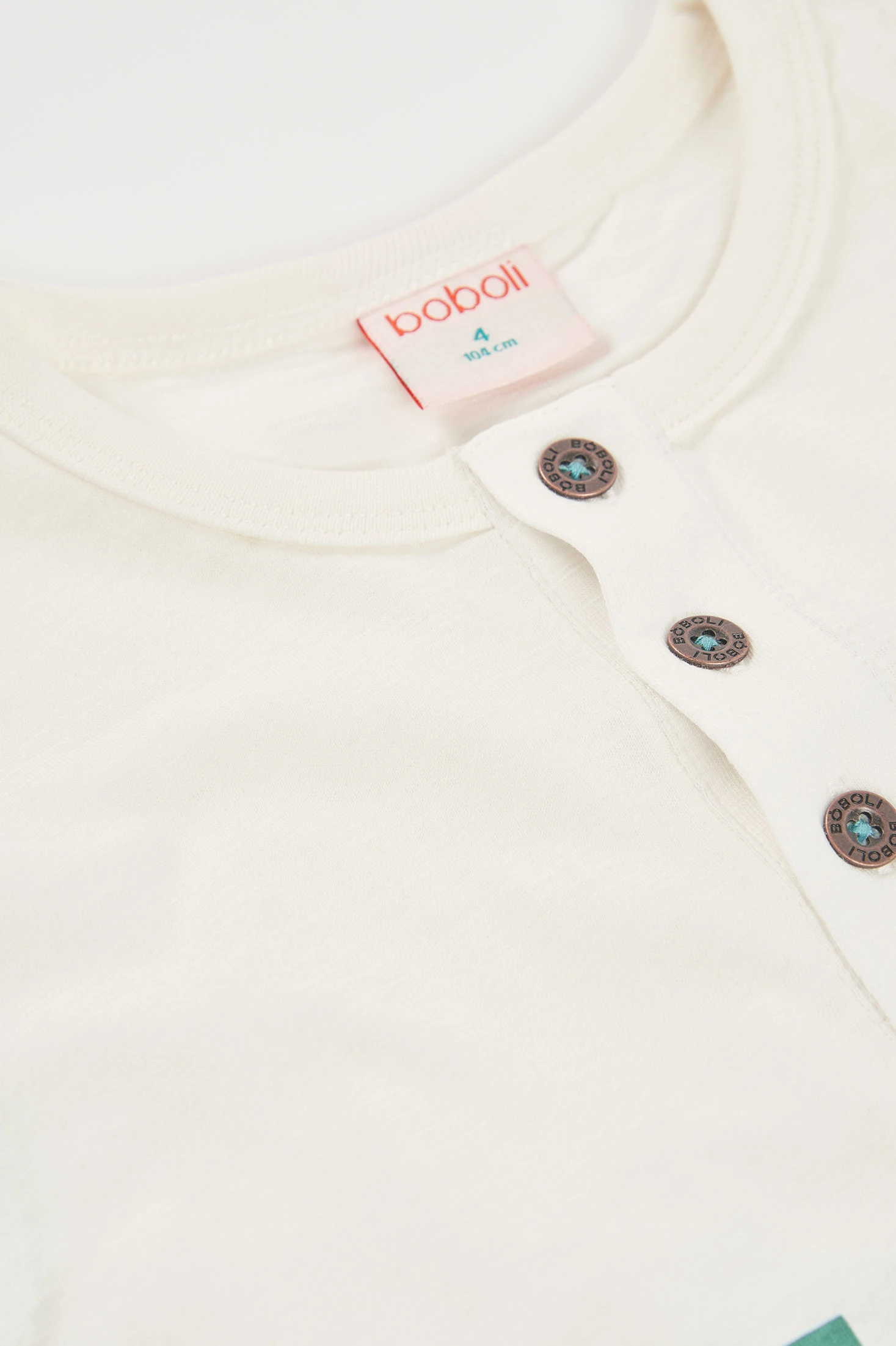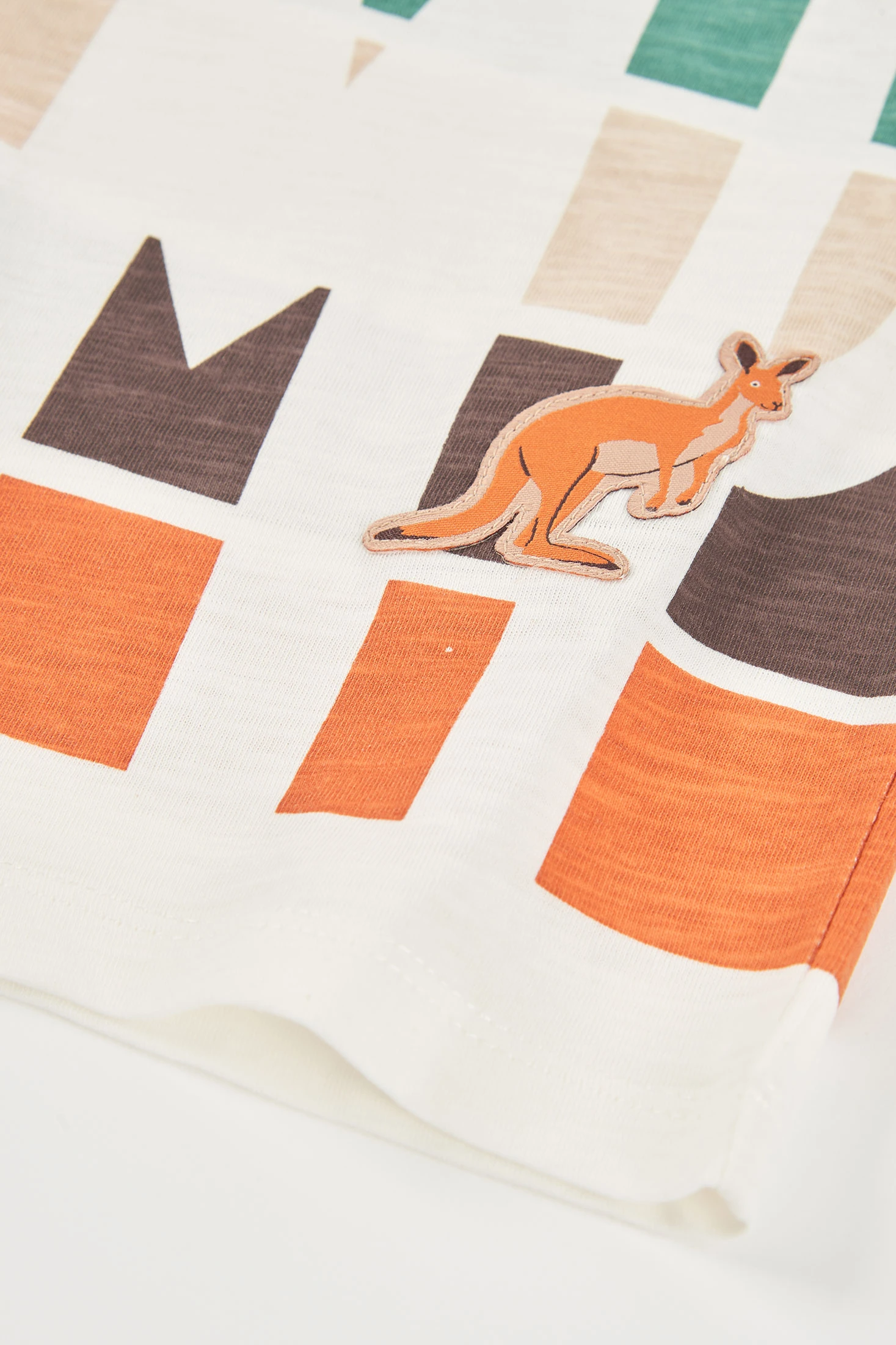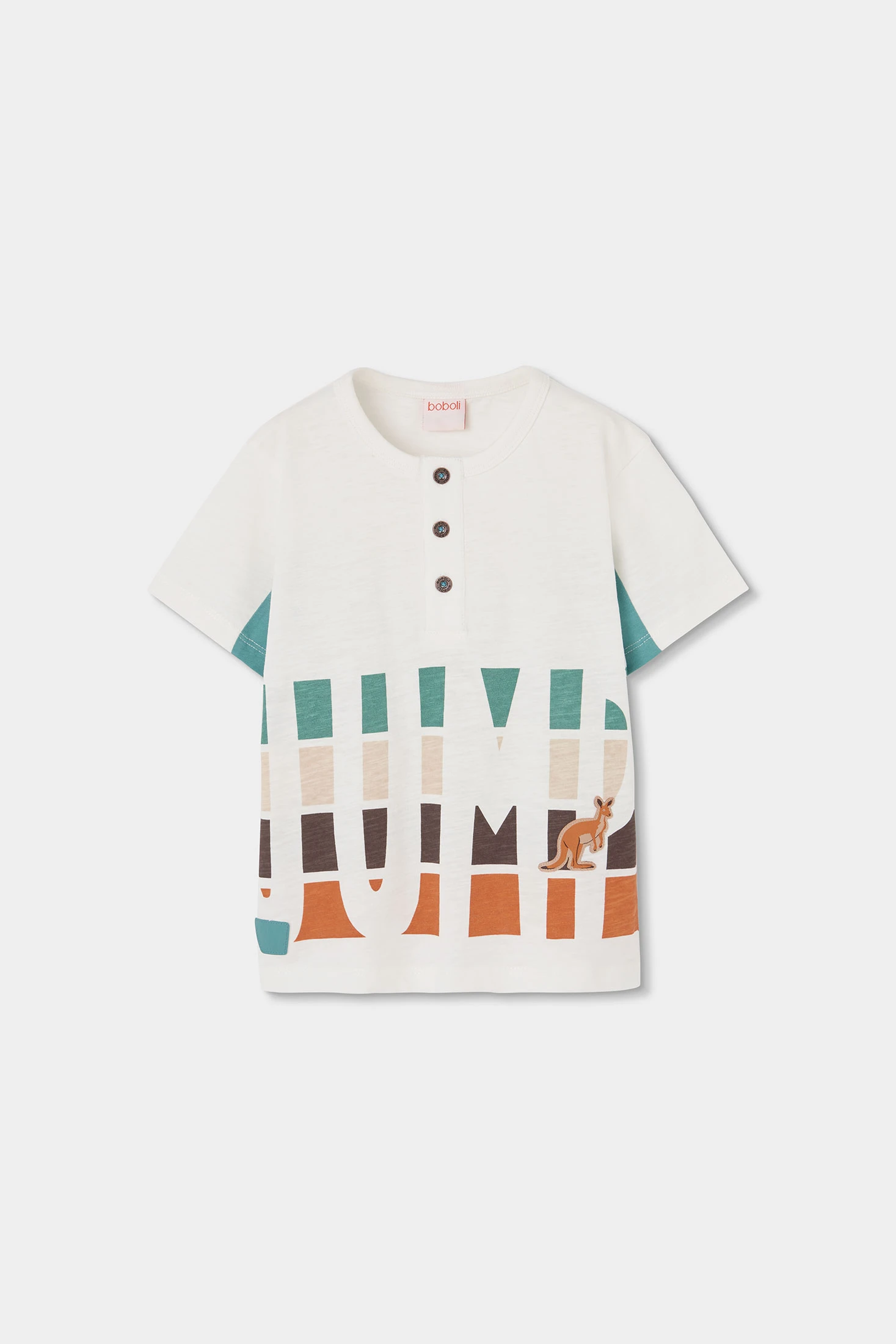 Maglietta in cotone bianco sporco per bambino, ideale per un look casual. Presenta un design divertente con la parola "JUMP" in colori variati e un piccolo canguro. Il materiale di cotone assicura comfort e freschezza. Appropriata per età da 12 mesi fino a 10 anni, con taglie disponibili da 12 mesi fino a 10 anni. I bottoni sul collo aggiungono un tocco di stile. Perfetta da abbinare con pantaloncini o jeans per una giornata attiva.