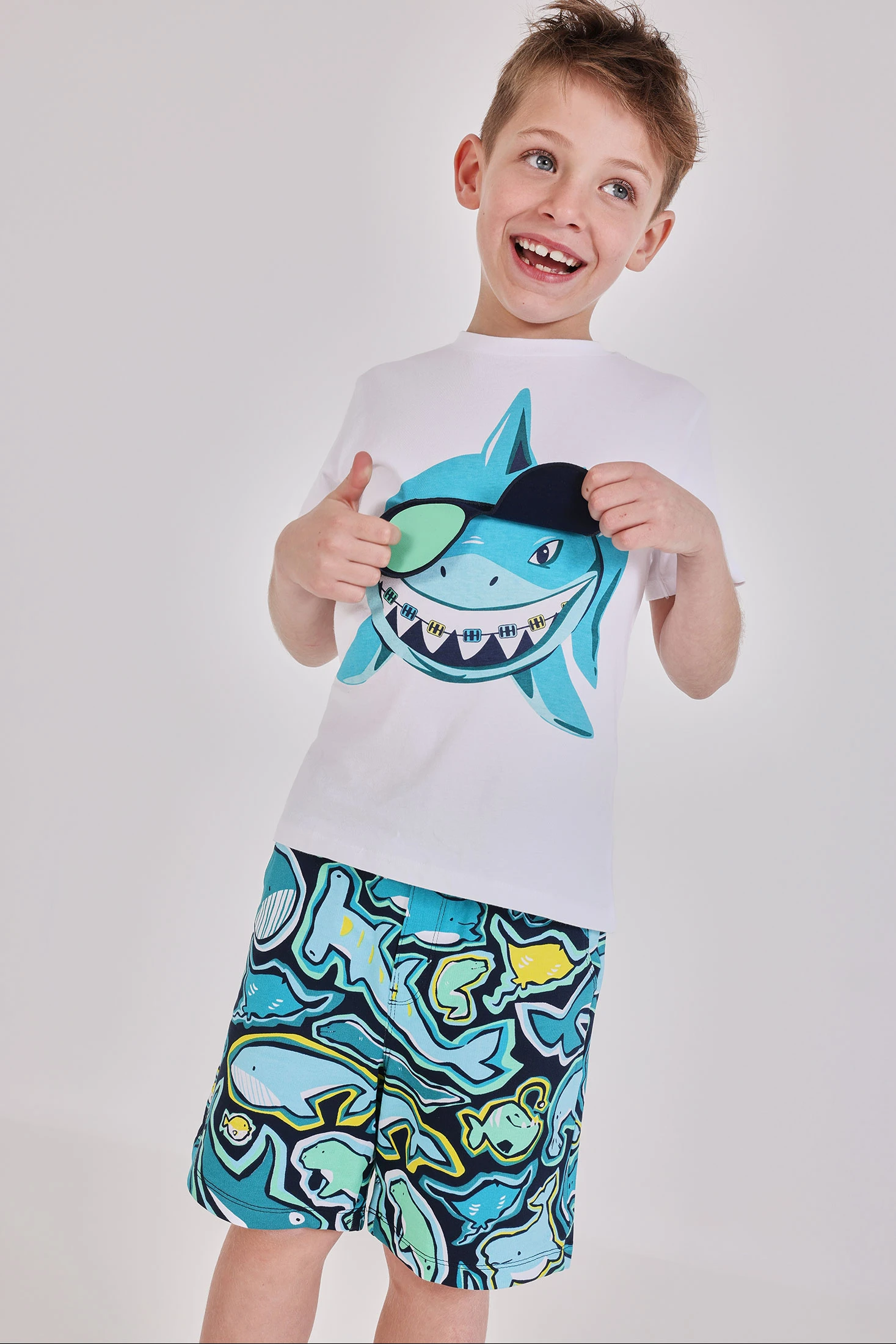 T-shirt di cotone per bambino, ideale per aggiungere un tocco fresco al guardaroba. Di colore bianco, presenta un disegno di uno squalo divertente con occhiali da sole, perfetto per stimolare l'immaginazione dei più piccoli. Indumento versatile, adatto per qualsiasi occasione casual. Il design a maniche corte e collo rotondo offre comfort durante l'uso quotidiano. Disponibile in taglie dai 12 mesi ai 10 anni, questa maglietta è un'opzione pratica e stilosa per mantenere il tuo bambino comodo e alla moda.
