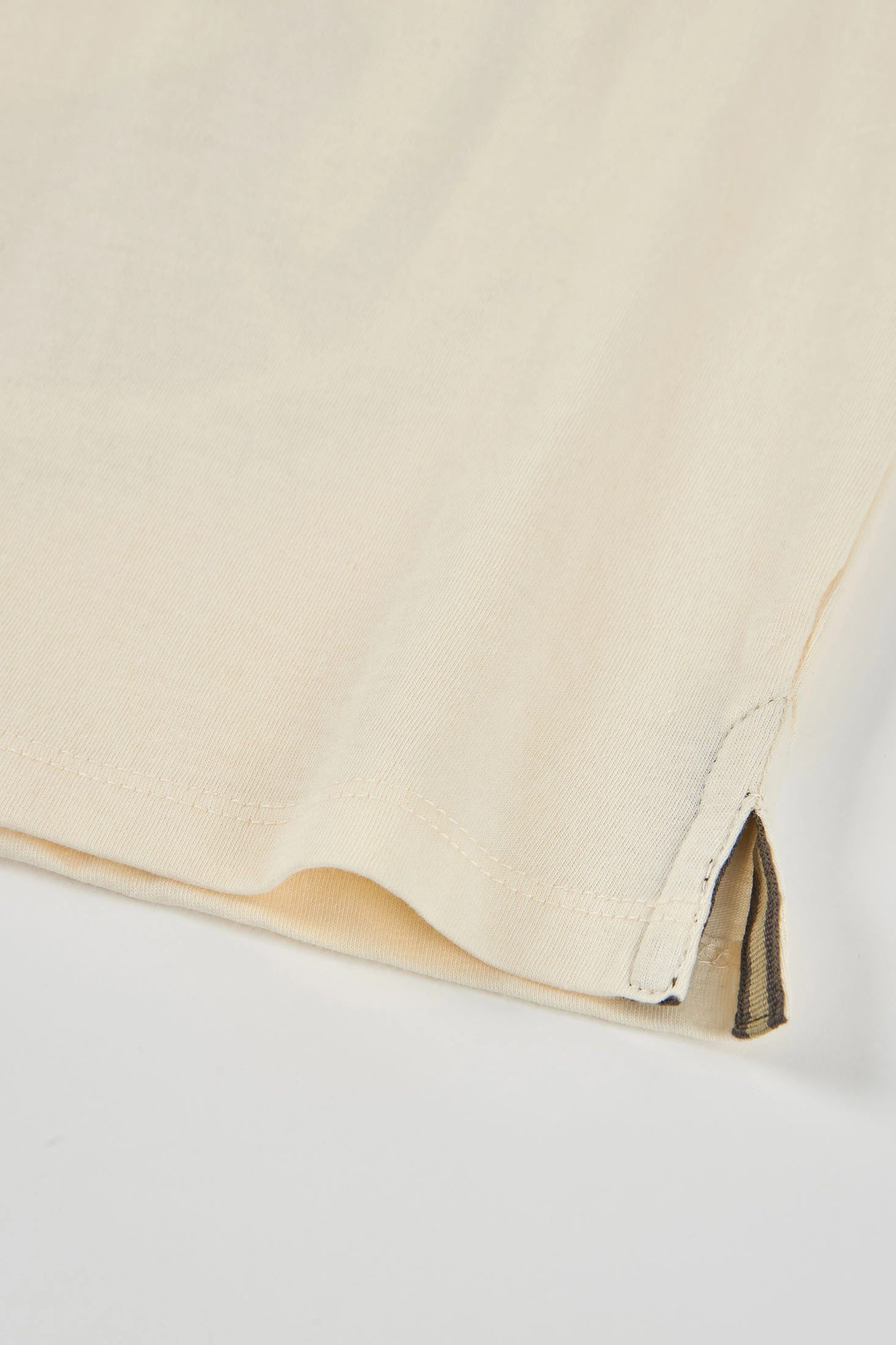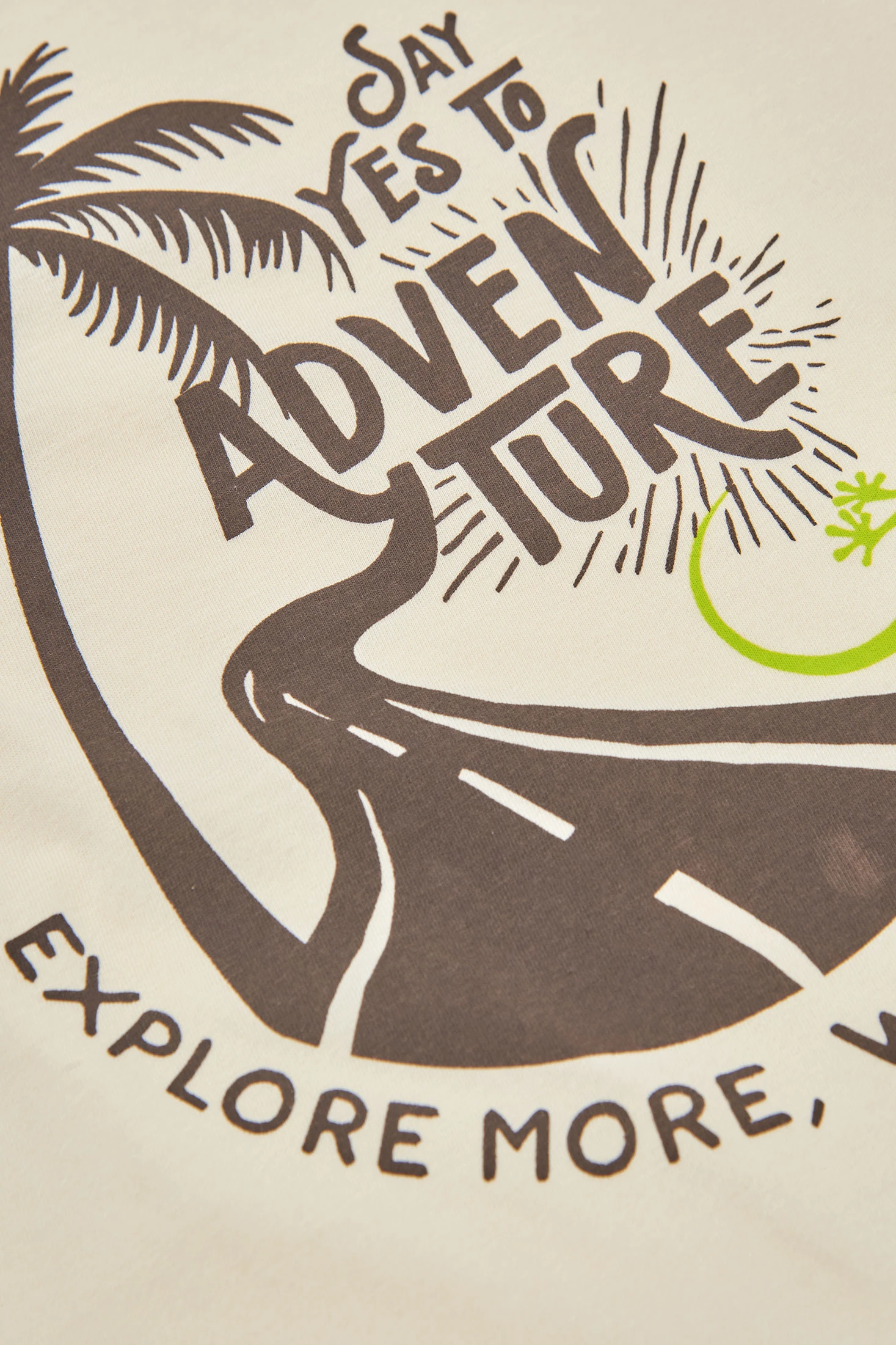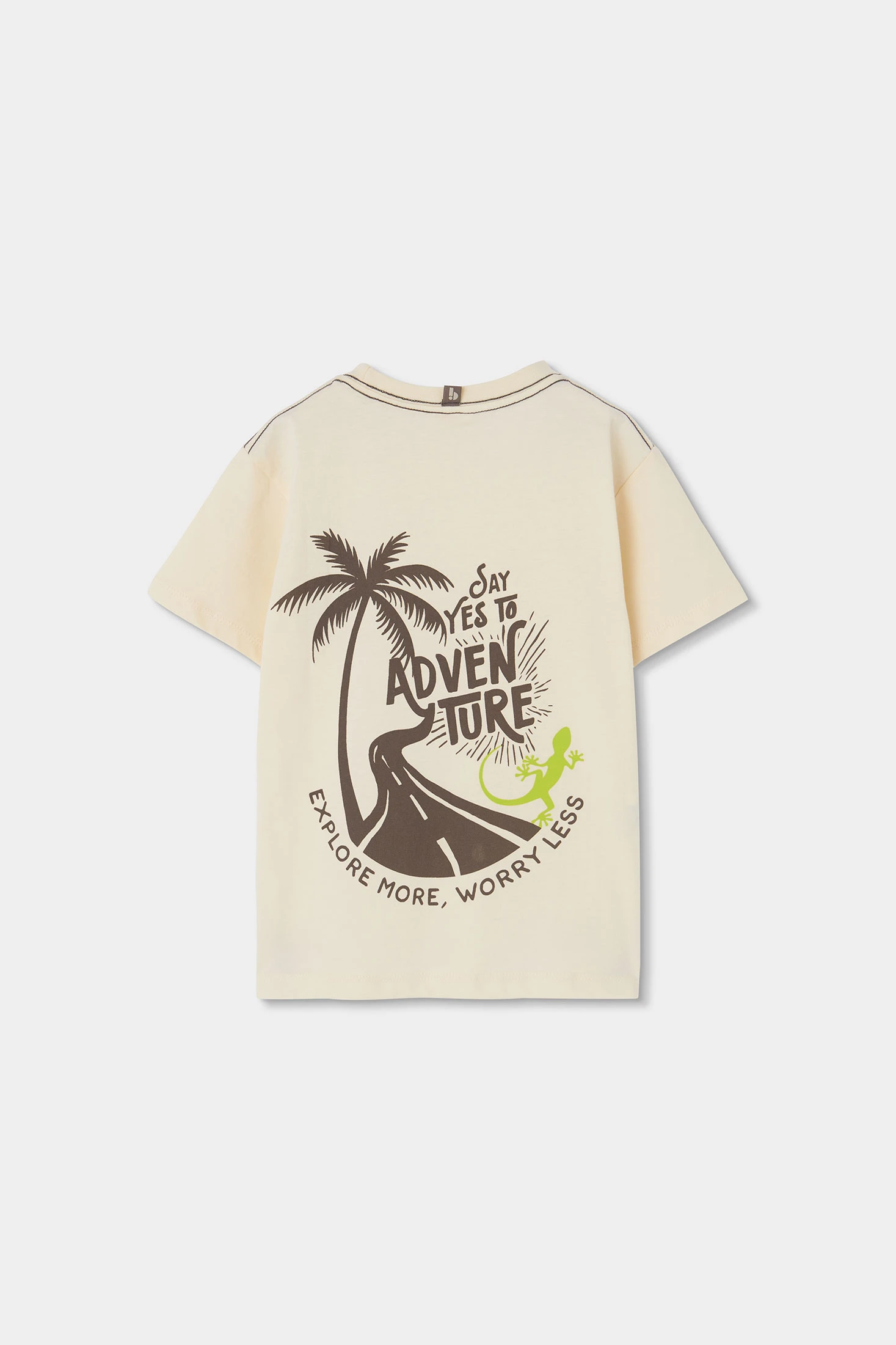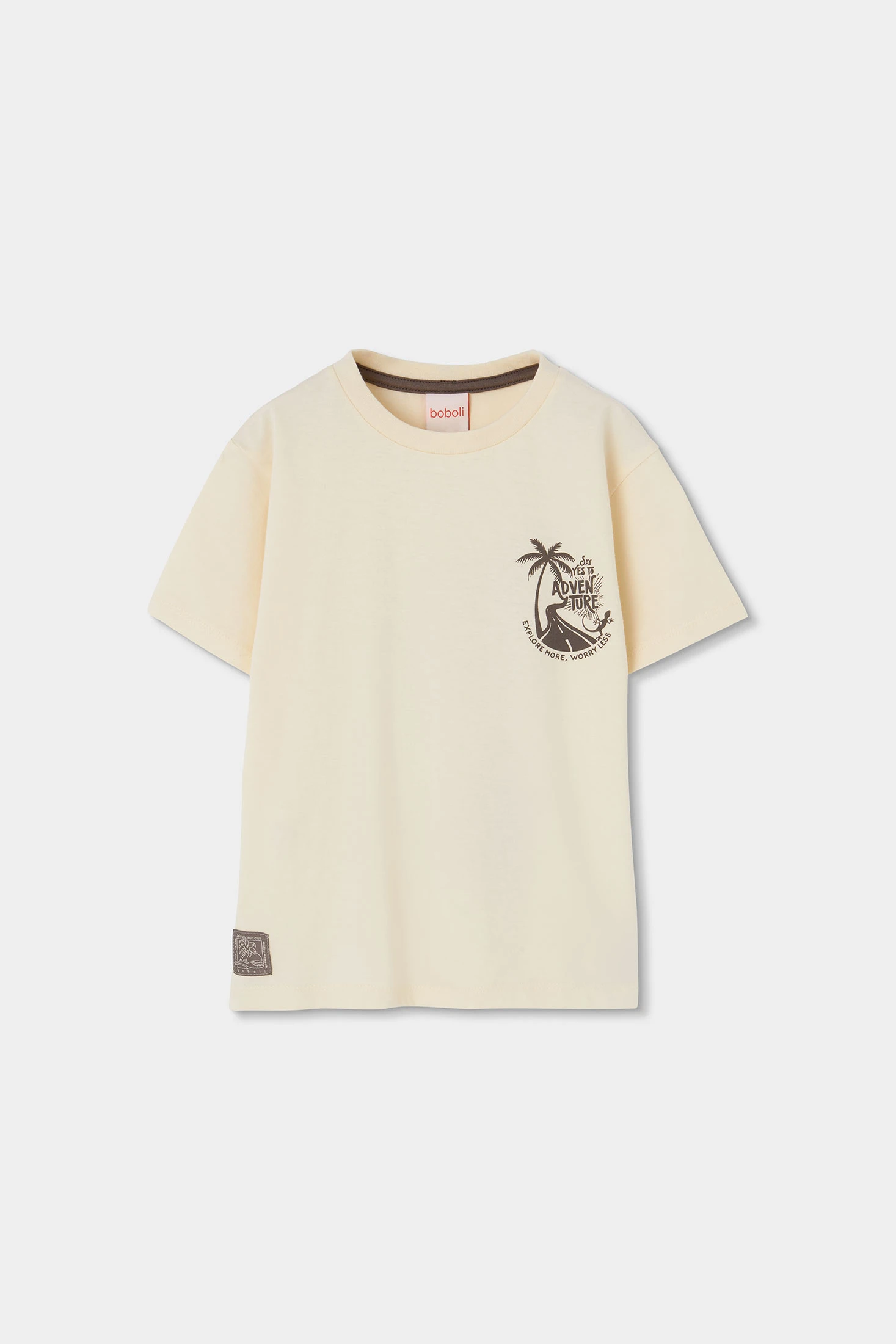 T-shirt per bambino in cotone grezzo, ideale per ogni occasione. Progettata con una stampa di palme e lettere, aggiunge un tocco di avventura. Il suo tessuto di cotone garantisce comodità e freschezza. Disponibile in taglie da 2 a 14 anni, è perfetta per chi cerca un capo versatile. Il colore neutro si abbina facilmente a pantaloni o shorts di qualsiasi tonalità, rendendola un'opzione pratica e stilosa per il quotidiano.