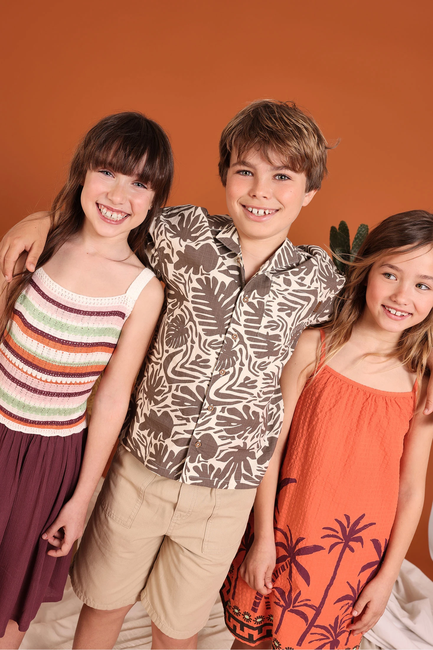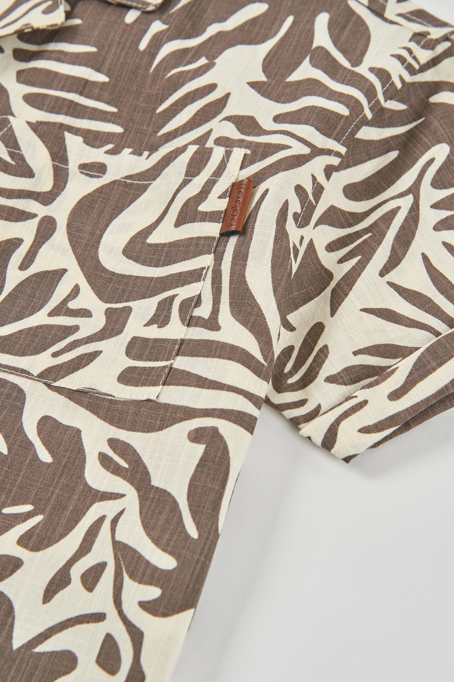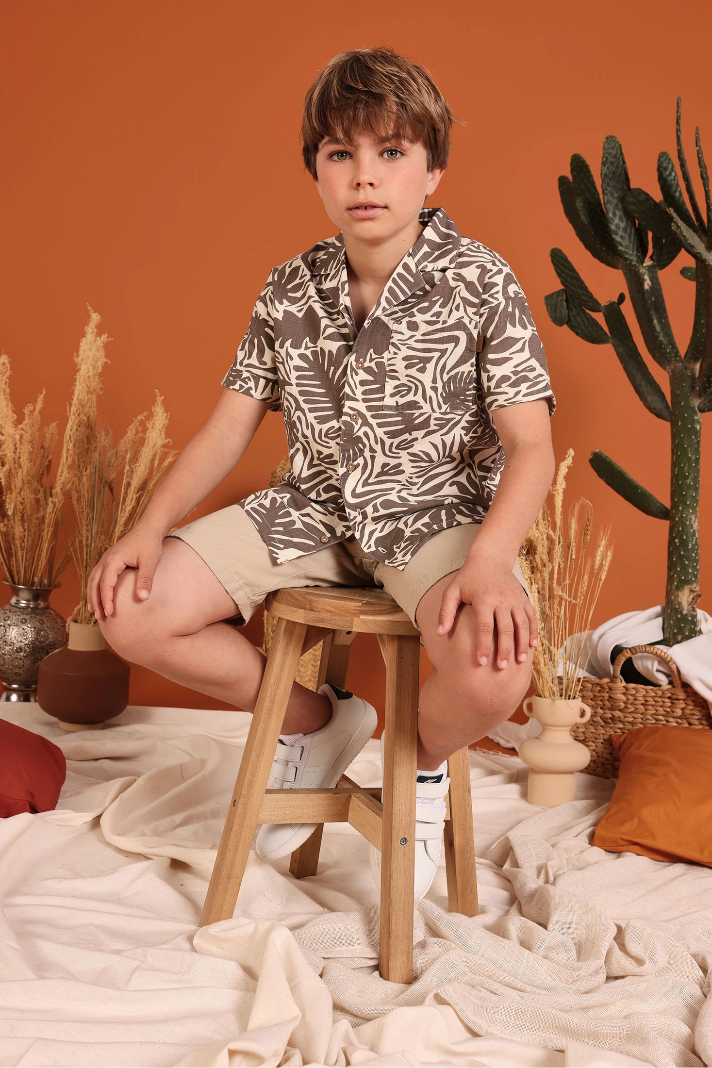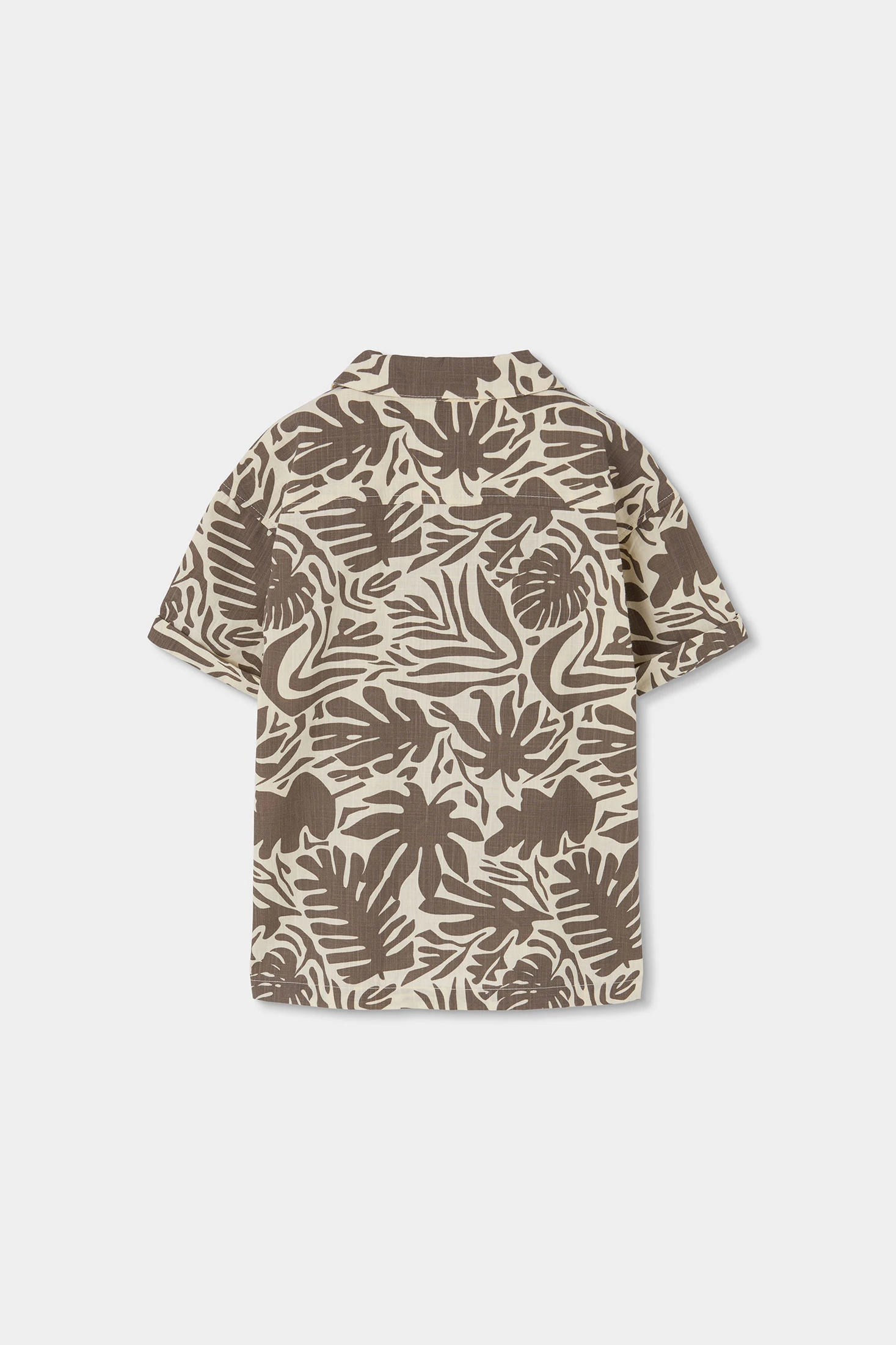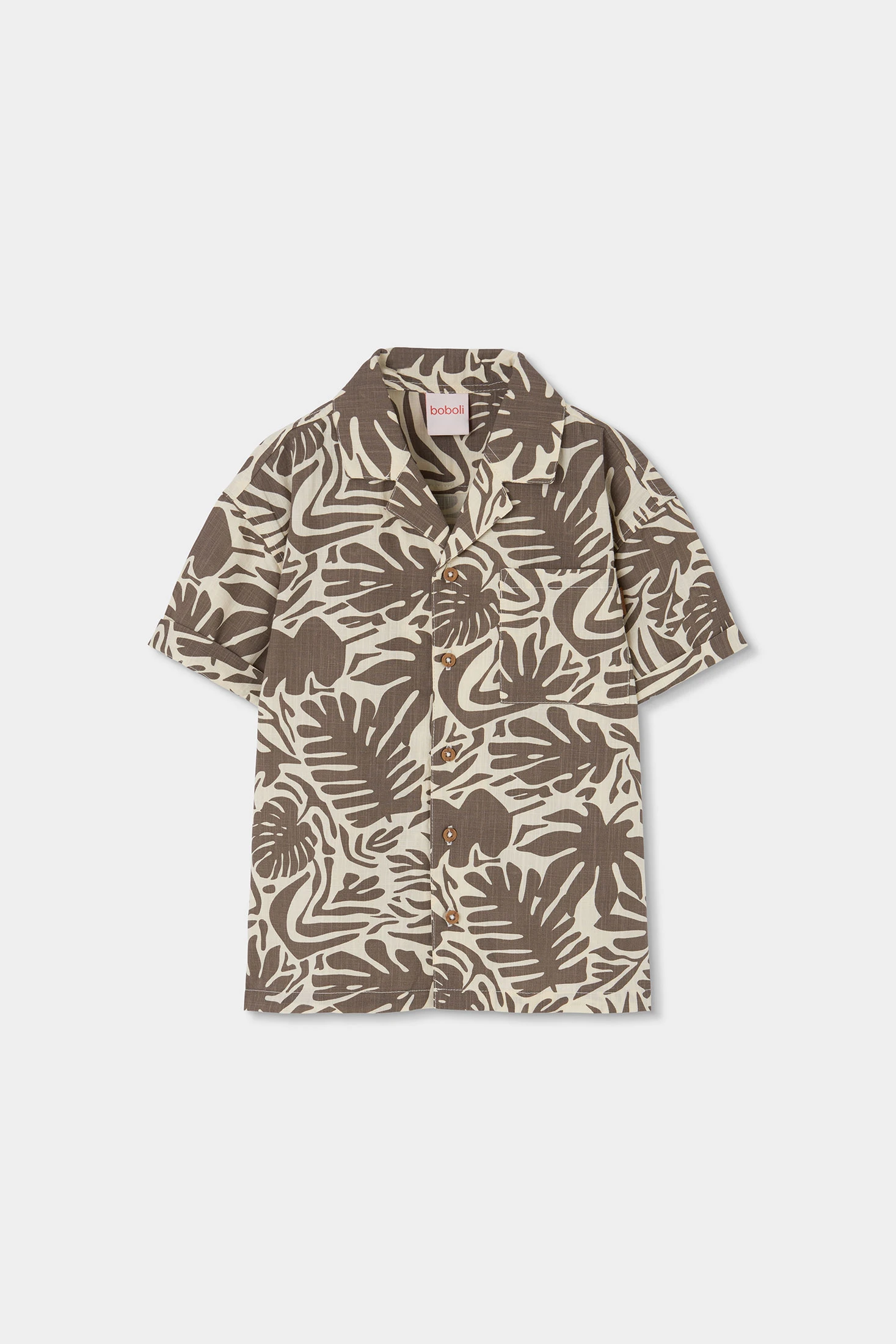 Camicia in popeline per bambino ideale per uno stile estivo e fresco. Il suo design presenta una stampa di foglie in tonalità marrone su uno sfondo chiaro, che aggiunge un tocco tropicale e divertente. Realizzata in un tessuto leggero di popeline, garantisce comfort e traspirabilità. Le taglie disponibili variano da 2 anni a 14 anni. Modello a maniche corte e chiusura con bottoni, perfetto da abbinare a pantaloncini o jeans, offrendo un look rilassato e moderno per giornate calde.