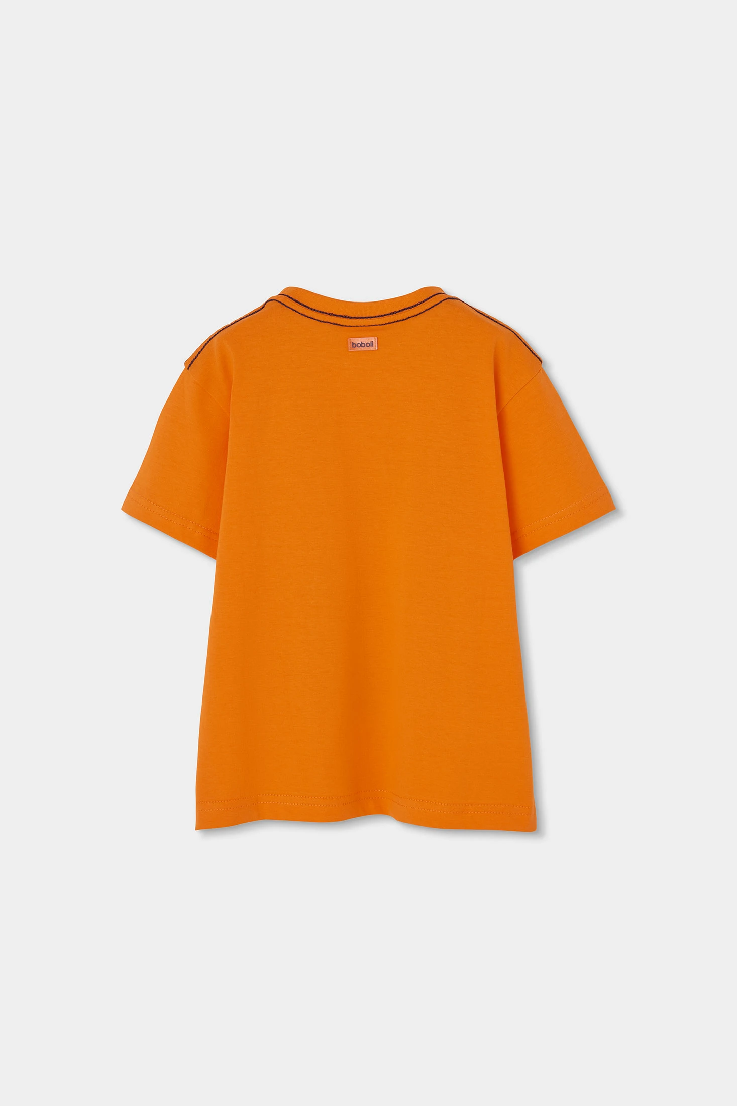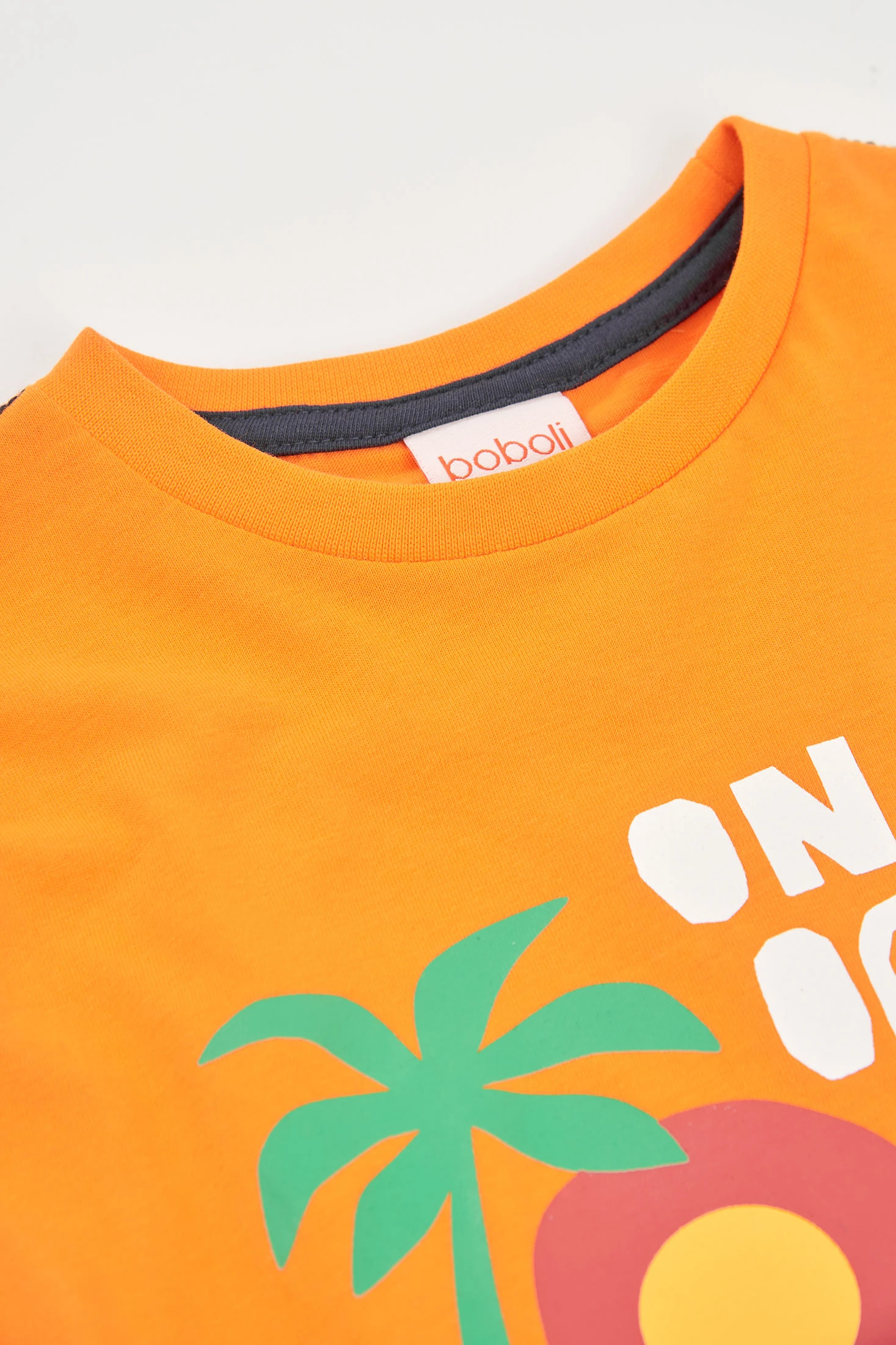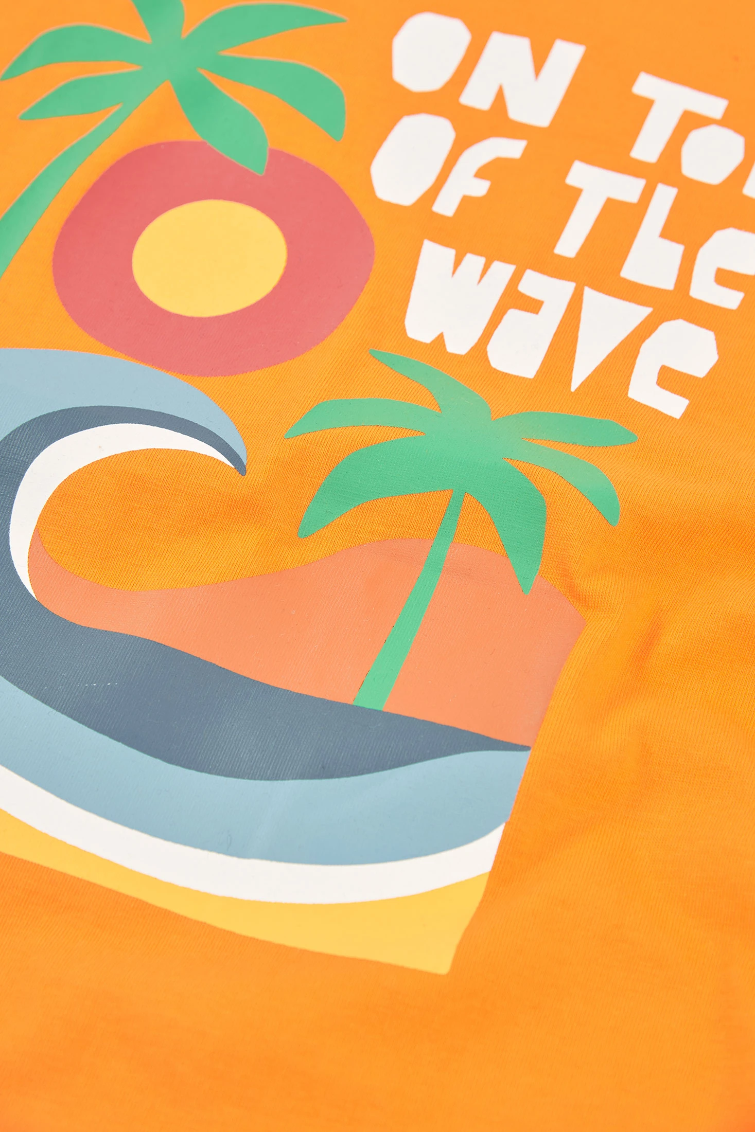 Maglietta in jersey di cotone per bambino perfetta per aggiungere un tocco vivace al guardaroba. Disponibile in taglie dai 2 ai 14 anni, si adatta alla crescita. Design con un colore arancione vivace e una stampa grafica che include palme e un'onda, ideale per uno stile estivo. Collo rotondo e maniche corte garantiscono comfort per tutti i giorni. Indumento ideale per abbinare con pantaloncini o jeans, offrendo un look casual e allegro per le avventure all'aperto.