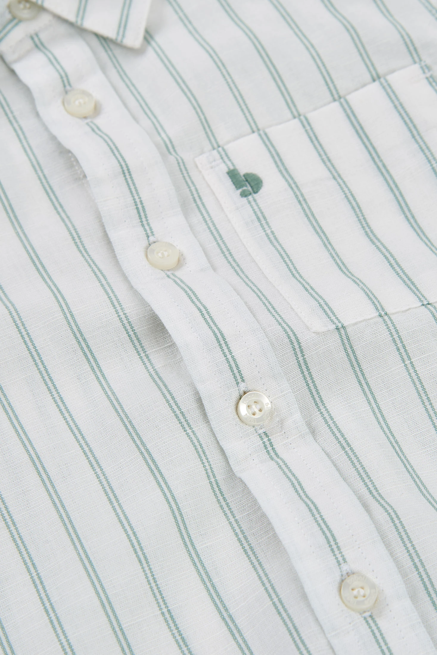 Camicia di lino a righe per bambino ideale per un look elegante e fresco nei mesi più caldi. Realizzata in un materiale leggero, offre comfort per tutto il giorno. Il suo design con righe verticali in tonalità chiare e il taglio a maniche corte aggiungono un tocco chic. Disponibile in taglie da 12 mesi a 10 anni, si adatta a diverse età. Ideale da abbinare a pantaloni di lino o jeans, questa camicia è una scelta versatile per eventi informali o formali.