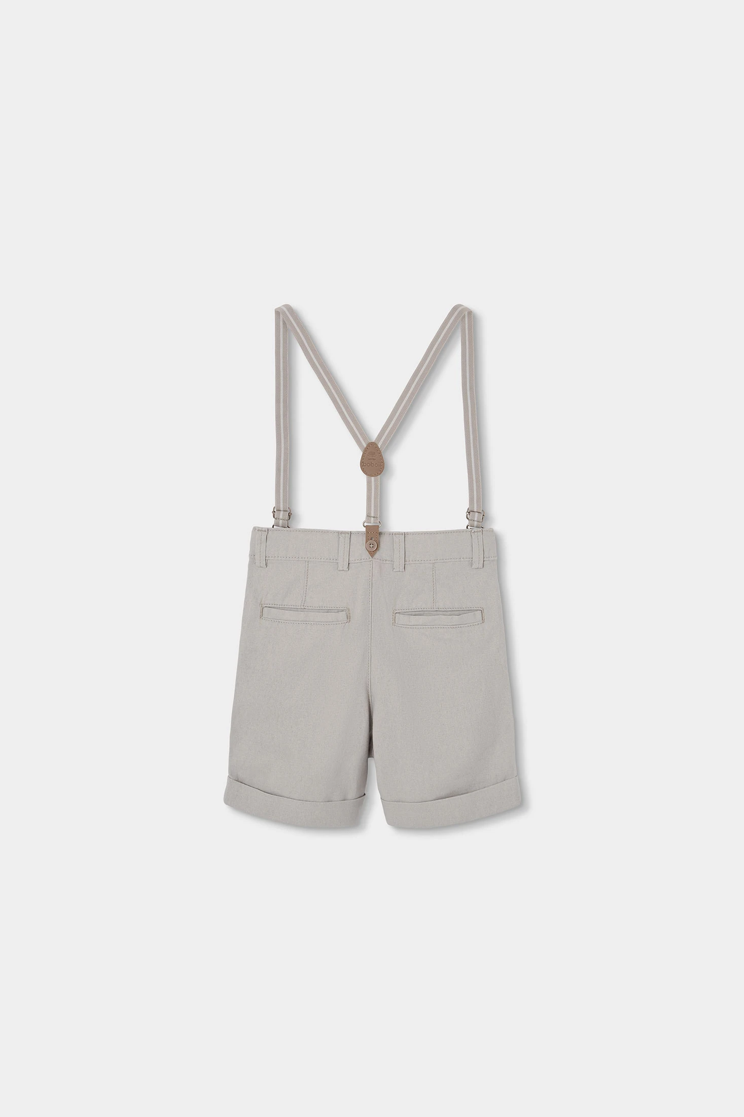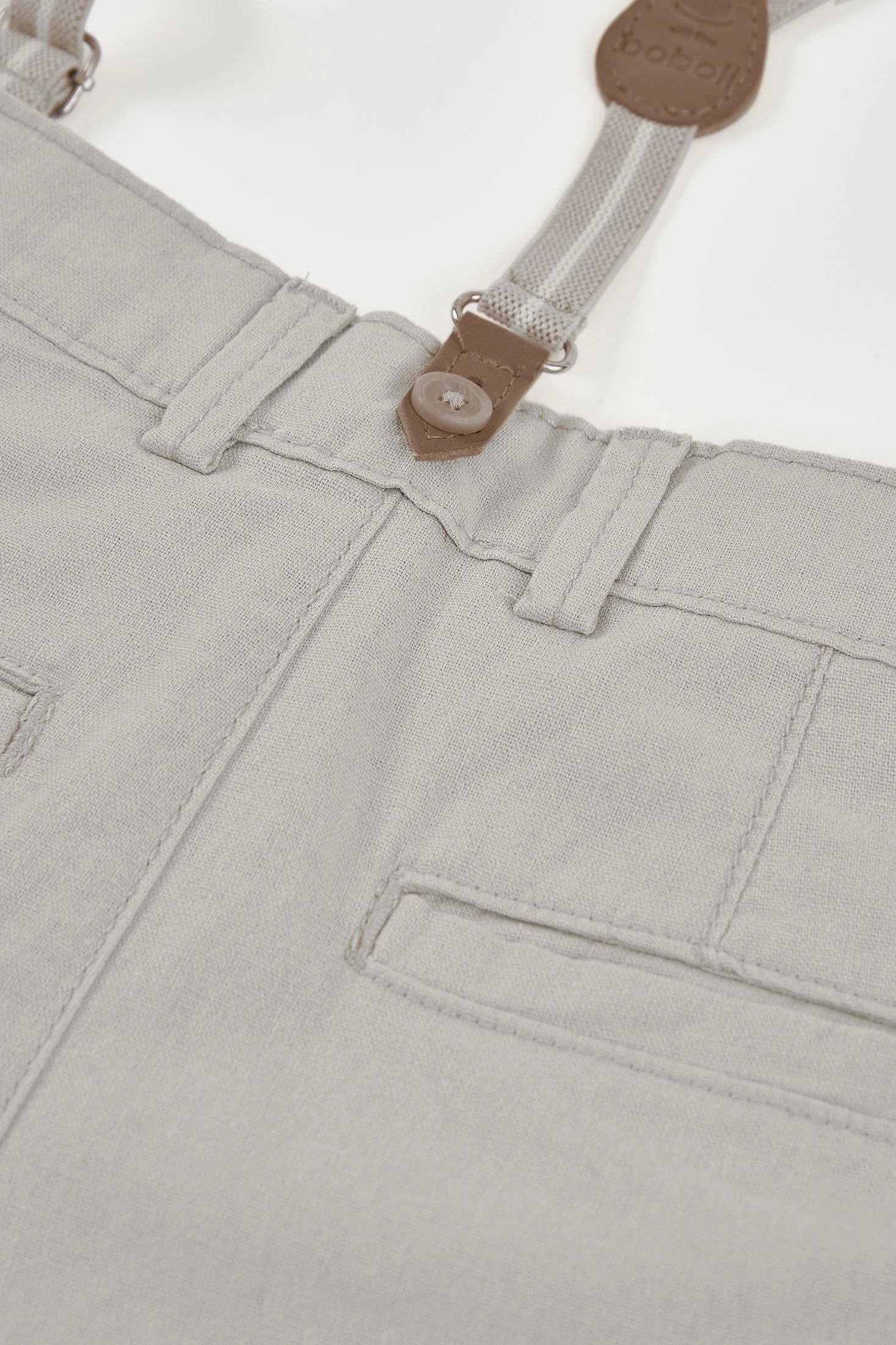 Bermuda di lino con bretelle in colore beige, ideale per bambini, offre un tocco classico ed elegante. Il materiale di lino è leggero e traspirante, perfetto per climi caldi. Le bretelle regolabili offrono una funzionalità pratica e comoda. Disponibile in taglie da 12 mesi fino a 14 anni. Il design semplice permette di abbinarla facilmente con camicie leggere o magliette, ideale per occasioni sia casual che più formali.