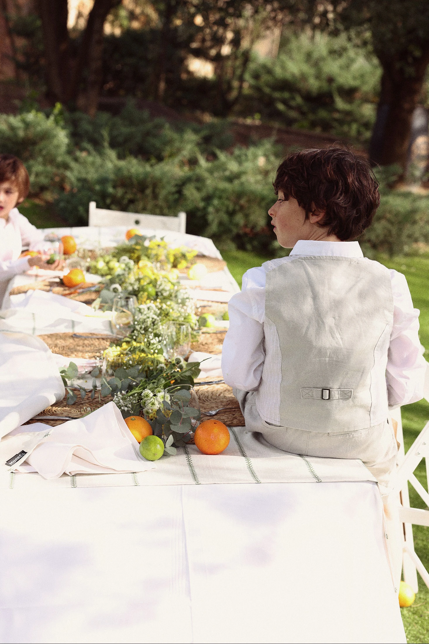 Gilet di lino per bambino perfetto per un look elegante e fresco. Presenta un design a righe in un delicato colore beige, ideale da abbinare a diversi stili. È realizzato in un materiale leggero e traspirante, offrendo comfort in ogni occasione. Disponibile in taglie da 12 mesi a 12 anni, si adatta alla crescita dei più piccoli. Gilet con chiusura a bottoni e due tasche decorative sul davanti, aggiungendo un tocco chic. Perfetto per eventi formali o per aggiungere un tocco sofisticato alla vita quotidiana.