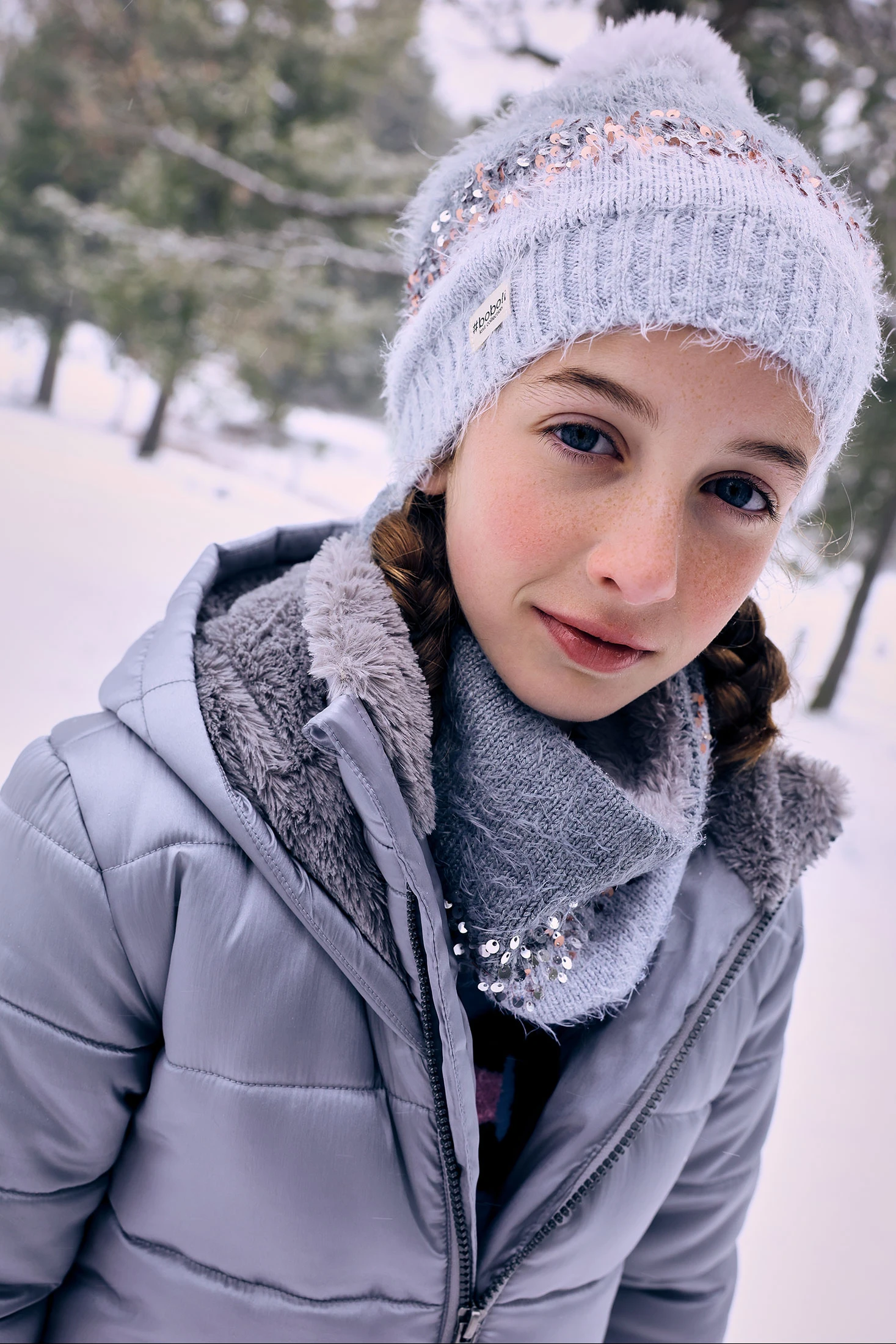 Questa è una sciarpa lavorata a maglia per bambina, perfetta per l'inverno. Il suo tessuto a maglia in colore grigio scuro mélange le conferisce un tocco elegante e versatile. È liscia, con paillettes, il che facilita la sua combinazione con qualsiasi capo. È disponibile in diverse taglie, precisamente in M, L, XL e XXL. Ideale per mantenere la tua piccola al caldo e alla moda durante i mesi più freddi. Un accessorio essenziale nell'armadio di qualsiasi bambina.