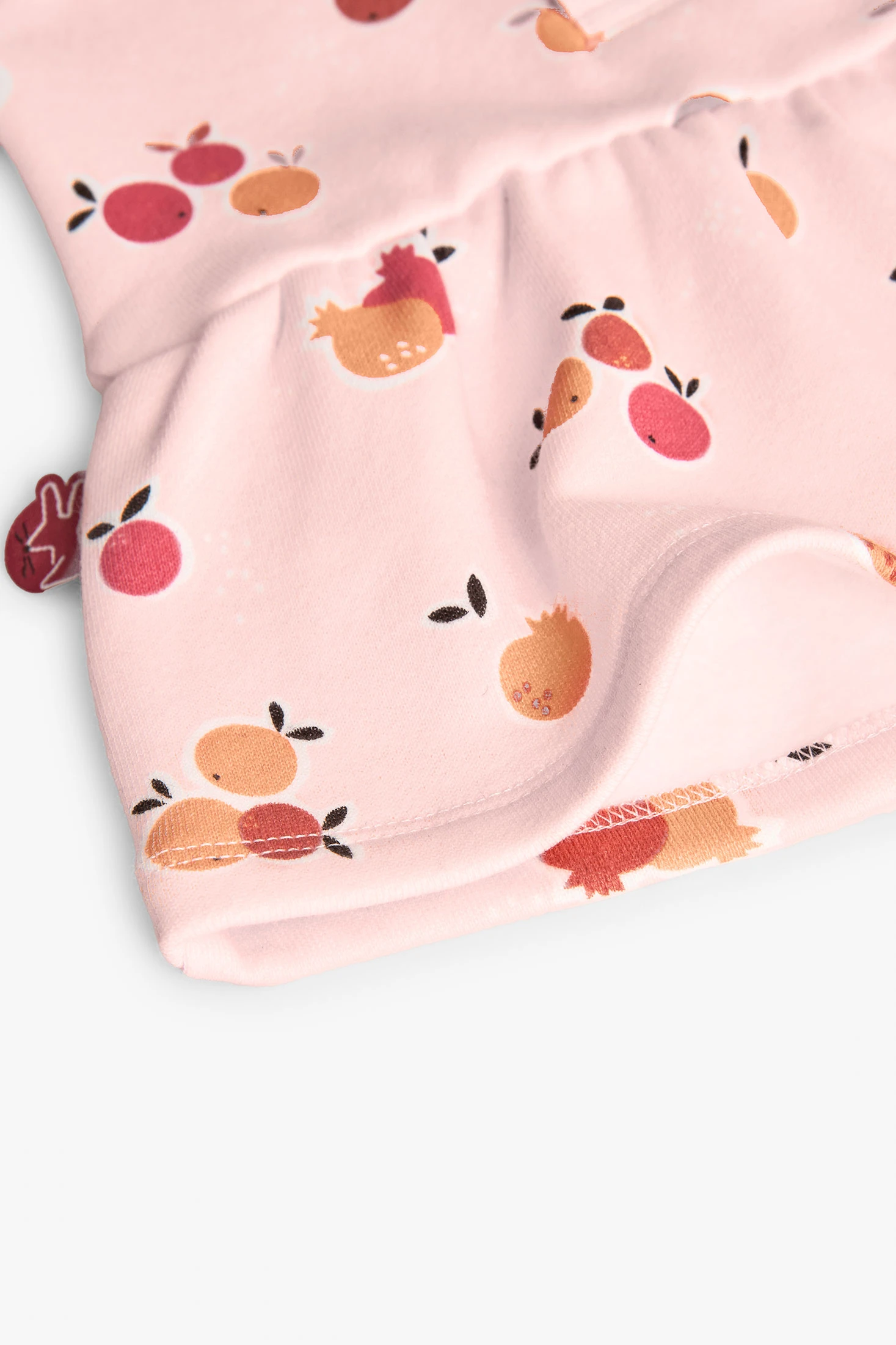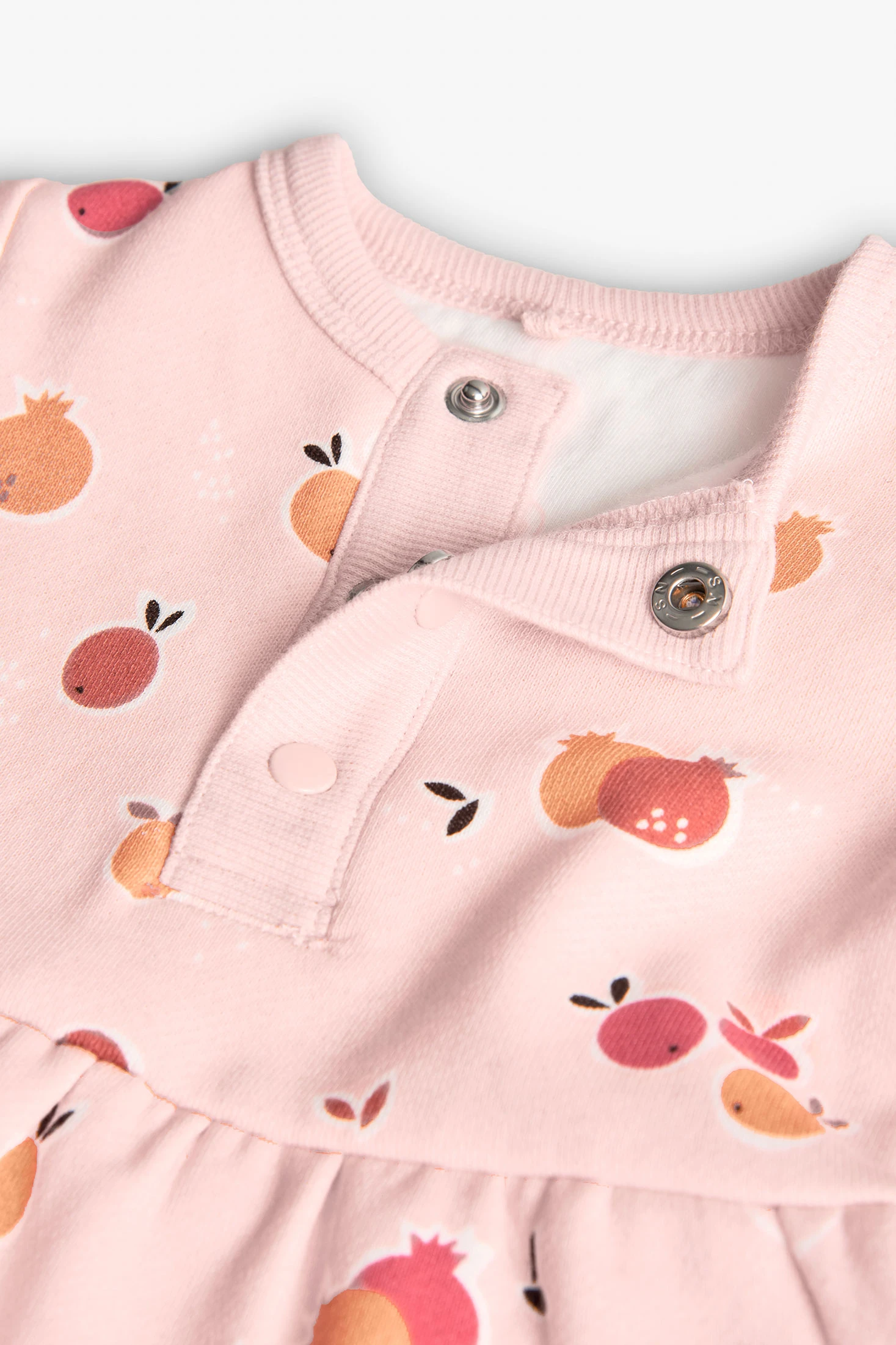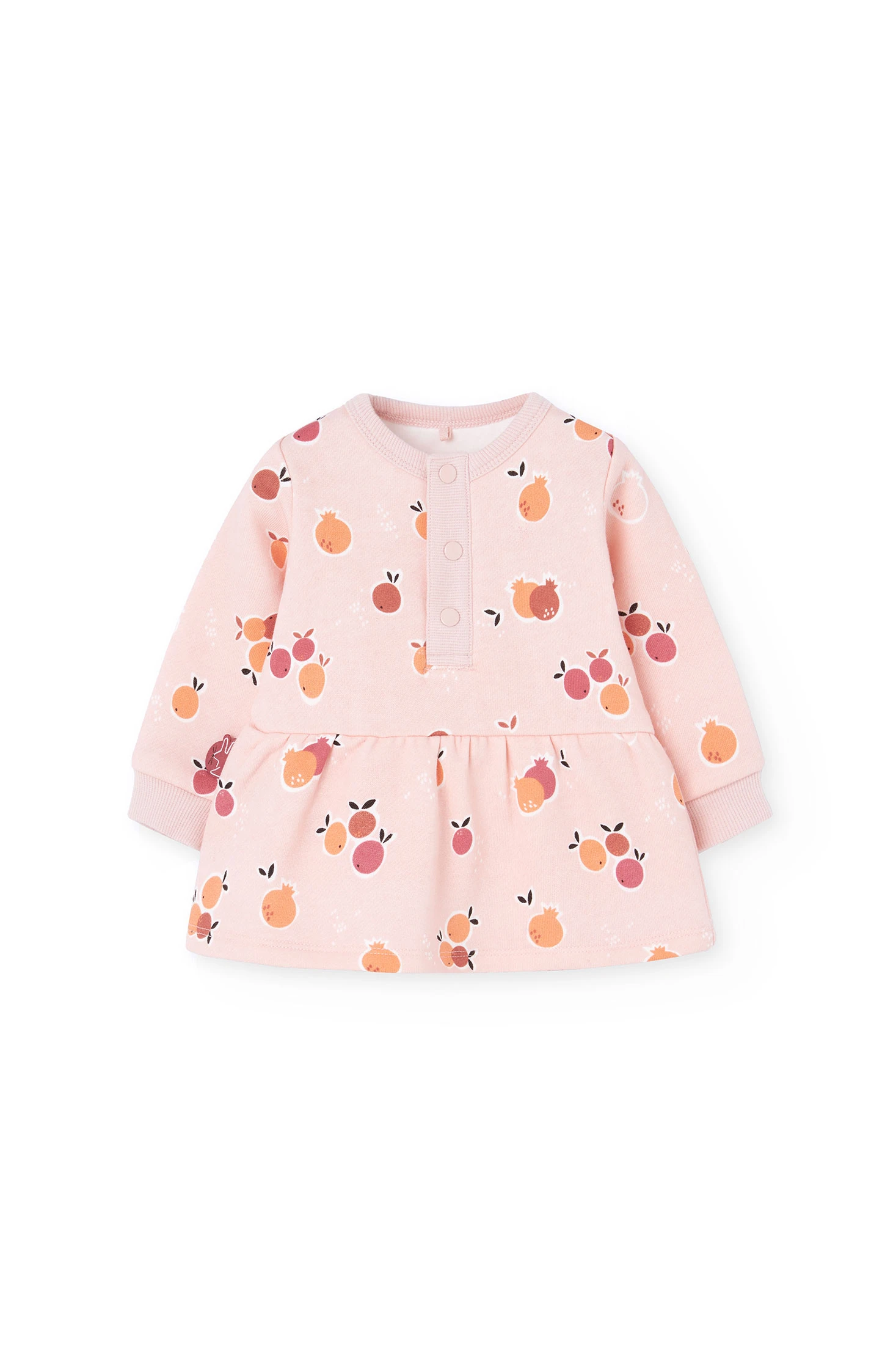 Vestito in felpa flamé per bebè, perfetto per le stagioni autunnali e invernali, che presenta una adorabile stampa di frutta su uno sfondo rosa delicato. Realizzato in tessuto di felpa flamé, offre comfort e calore eccezionali. Progettato con una pratica chiusura a pressione sul davanti e gonna con balza, è ideale sia per occasioni speciali che per l'uso quotidiano. Disponibile in taglie da 1 mese a 2 anni, può essere abbinato a leggings o calze per un look accogliente nei giorni più freschi.