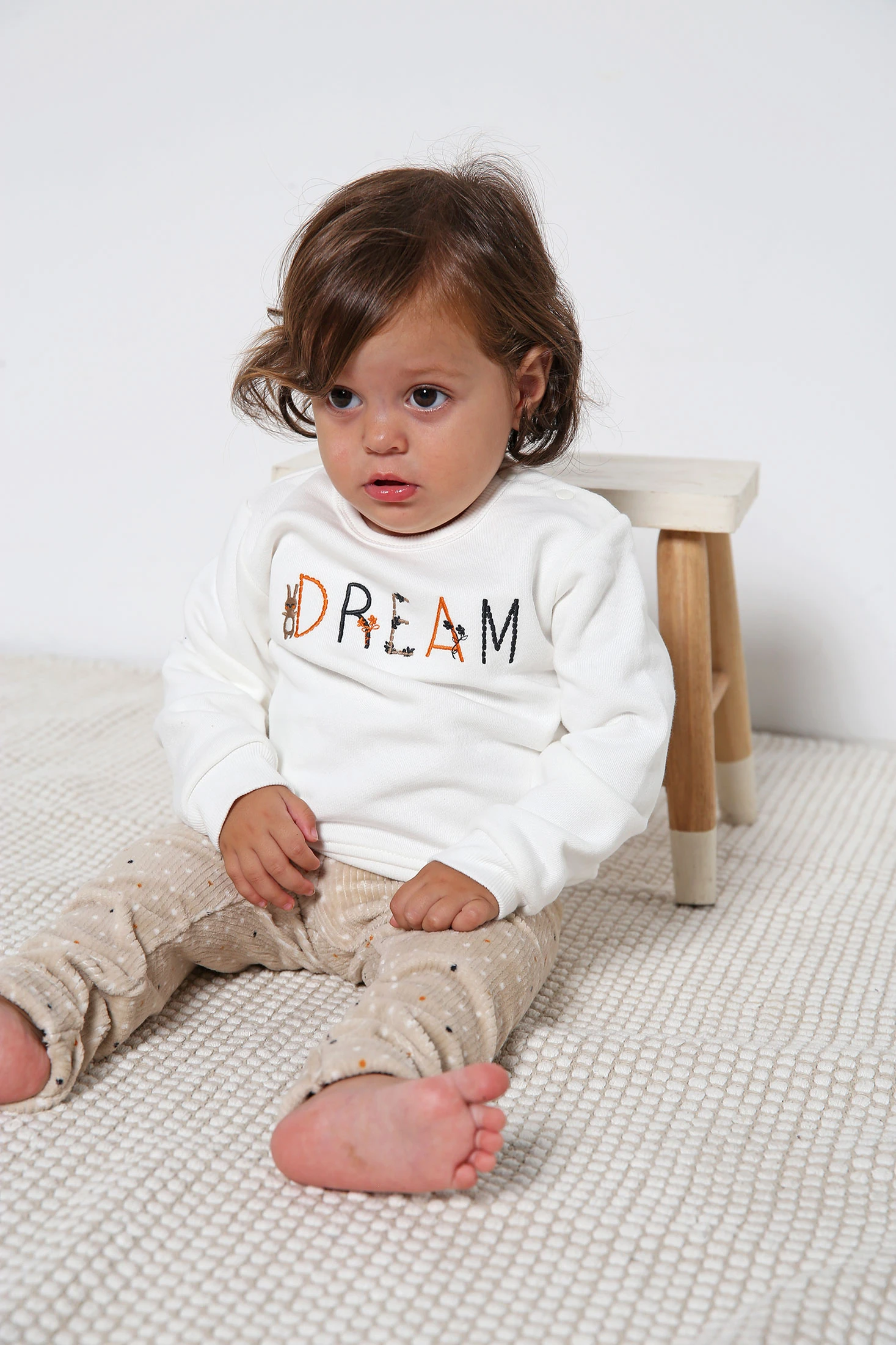 Set di felpa e pantaloni in maglia stampata, ideale per neonate nelle stagioni autunnali e invernali. Felpa bianca con la scritta "DREAM" e piccoli dettagli di animali, apportando un tocco divertente e affascinante. Pantaloni beige che completano il set con una stampa di pois in vari colori, aggiungendo stile e dinamismo. Realizzato in un tessuto morbido, garantisce comfort e calore per la pelle delicata del bambino. Disponibile in taglie da 1 mese a 24 mesi, è l'opzione perfetta per mantenere la tua piccola al caldo e alla moda.
