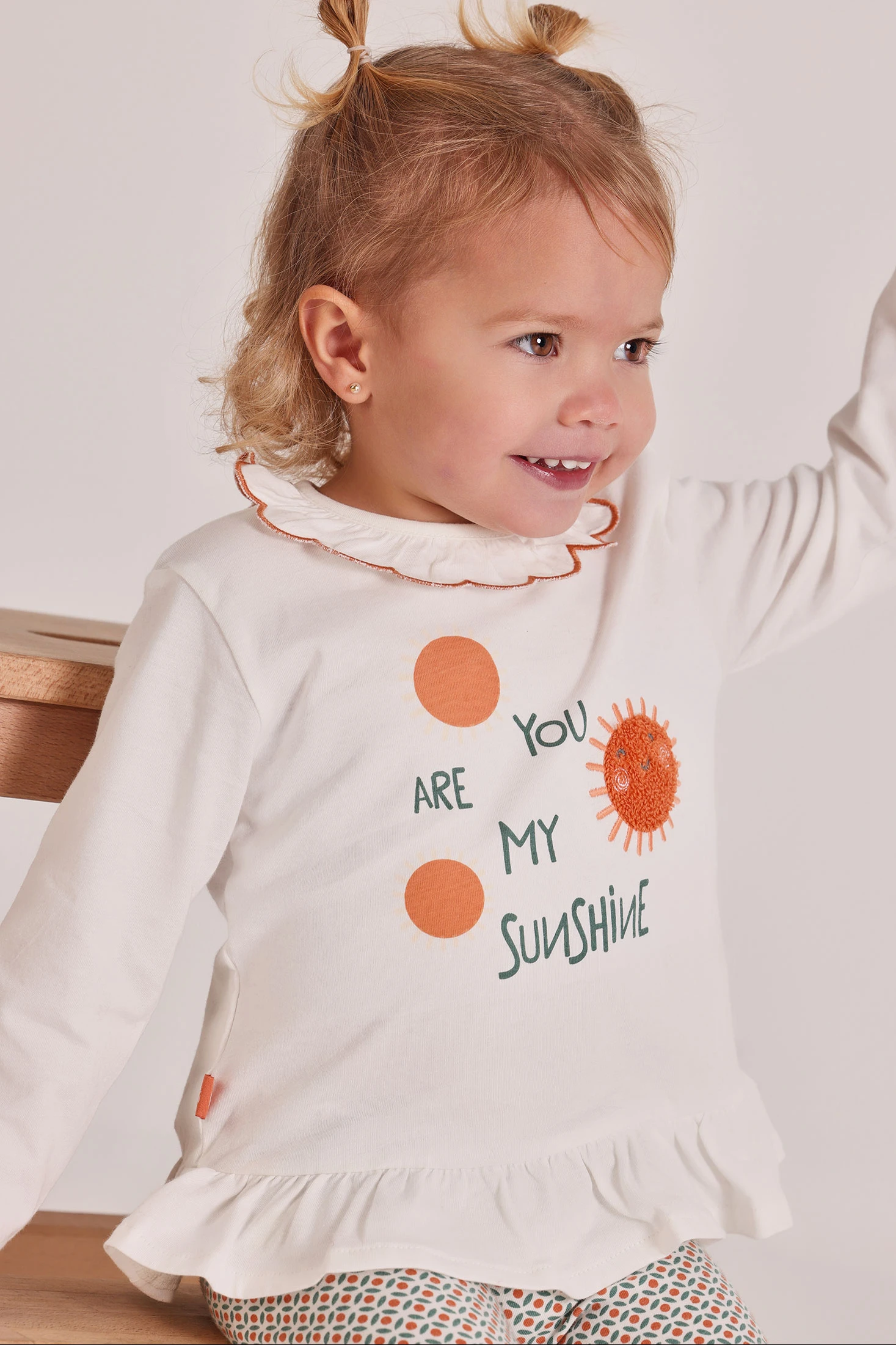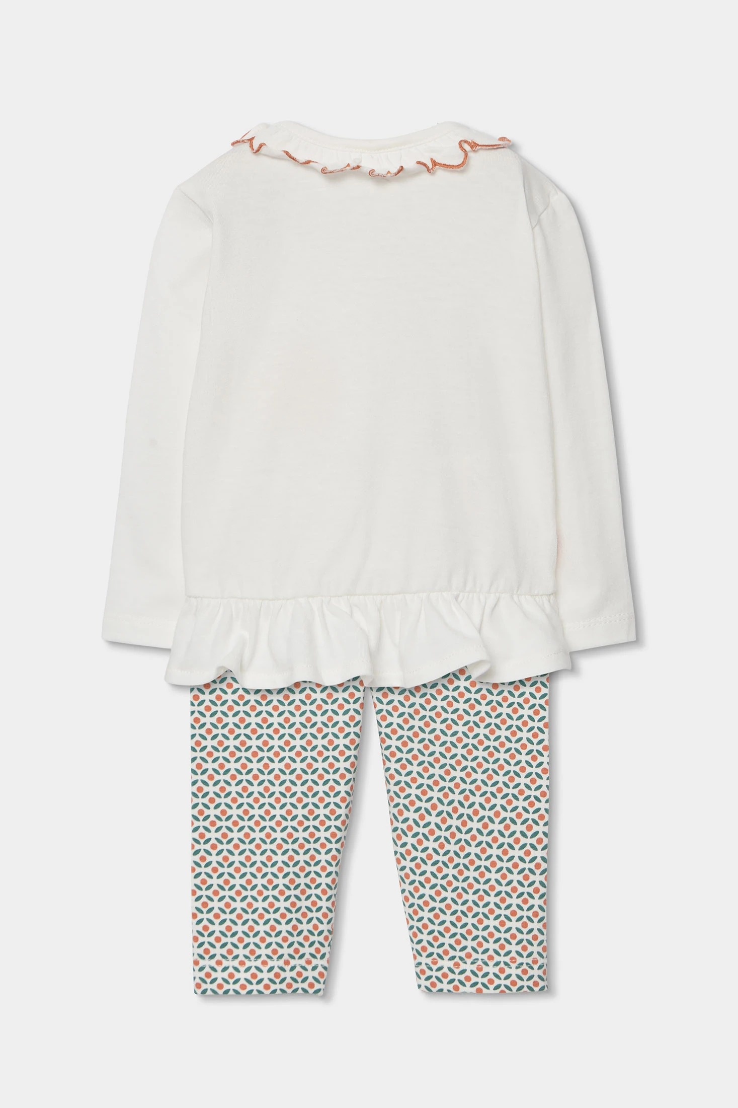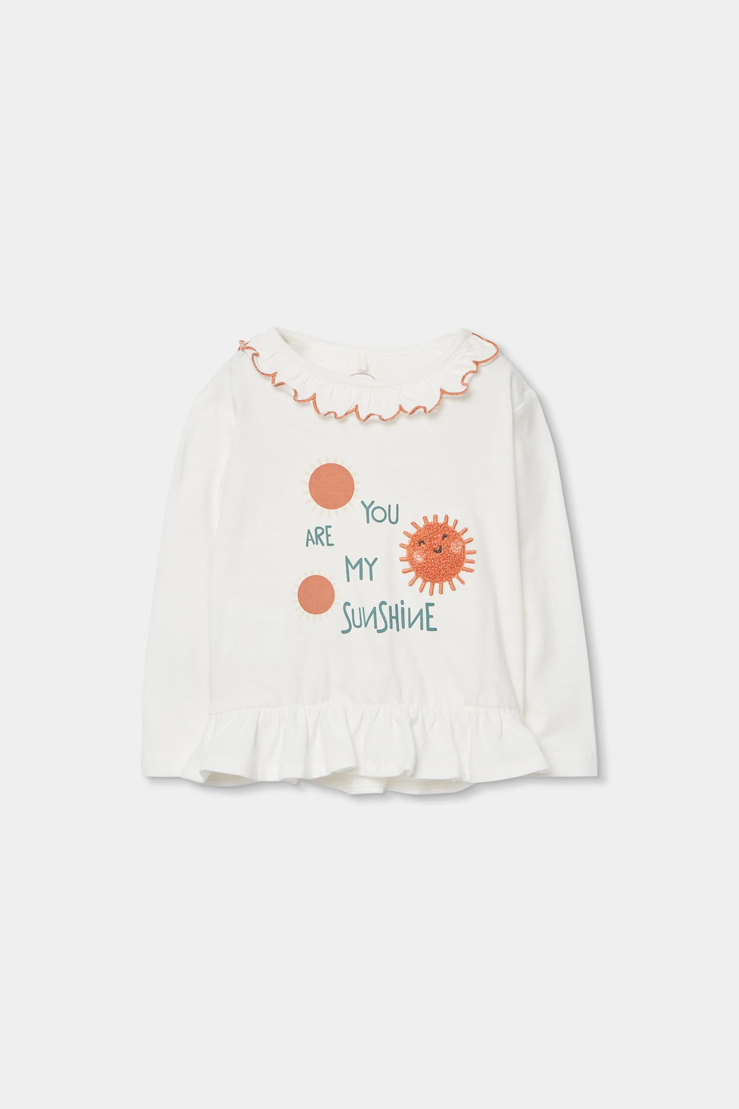 Completo in maglia di cotone e cotone elasticizzato per neonata, da 1 mese fino ai 24 mesi. Maglietta bianca a maniche lunghe con disegno di un sole e la frase "You are my sunshine", aggiungendo un tocco allegro. Colletto con un delicato bordo ondulato a contrasto e bottoni a pressione sulla spalla per facilitare il cambio. Pantaloni con un attraente motivo geometrico nei toni dell'arancione e blu. Tessuto morbido e confortevole con elasticità, assicura libertà di movimento. Ideale per un look casual e allegro.