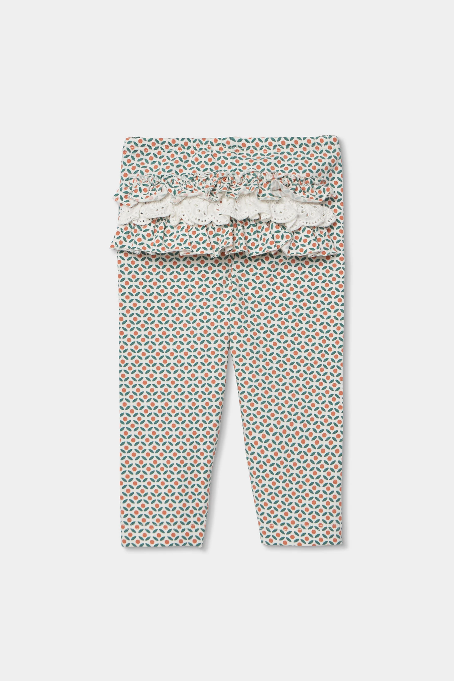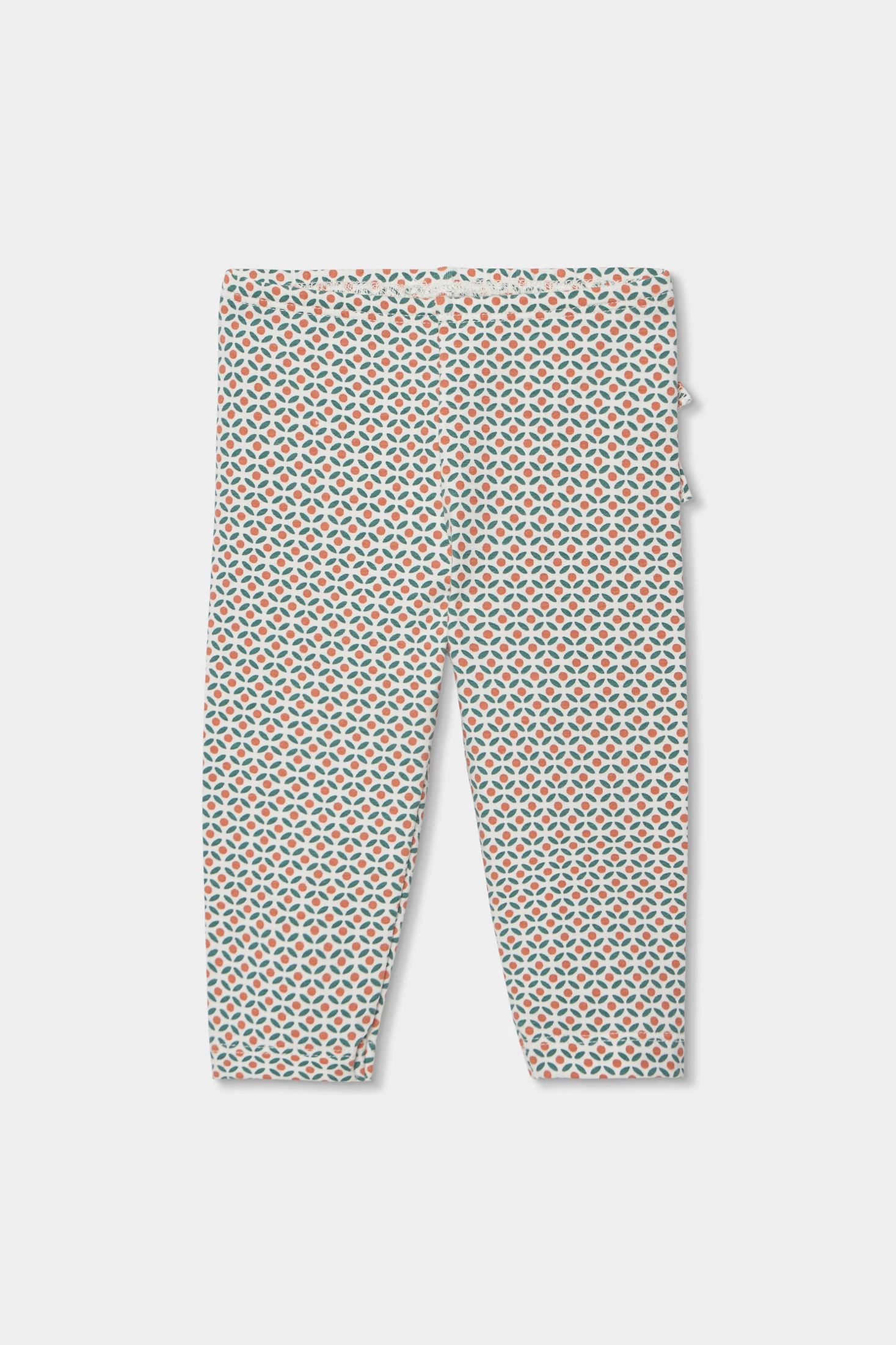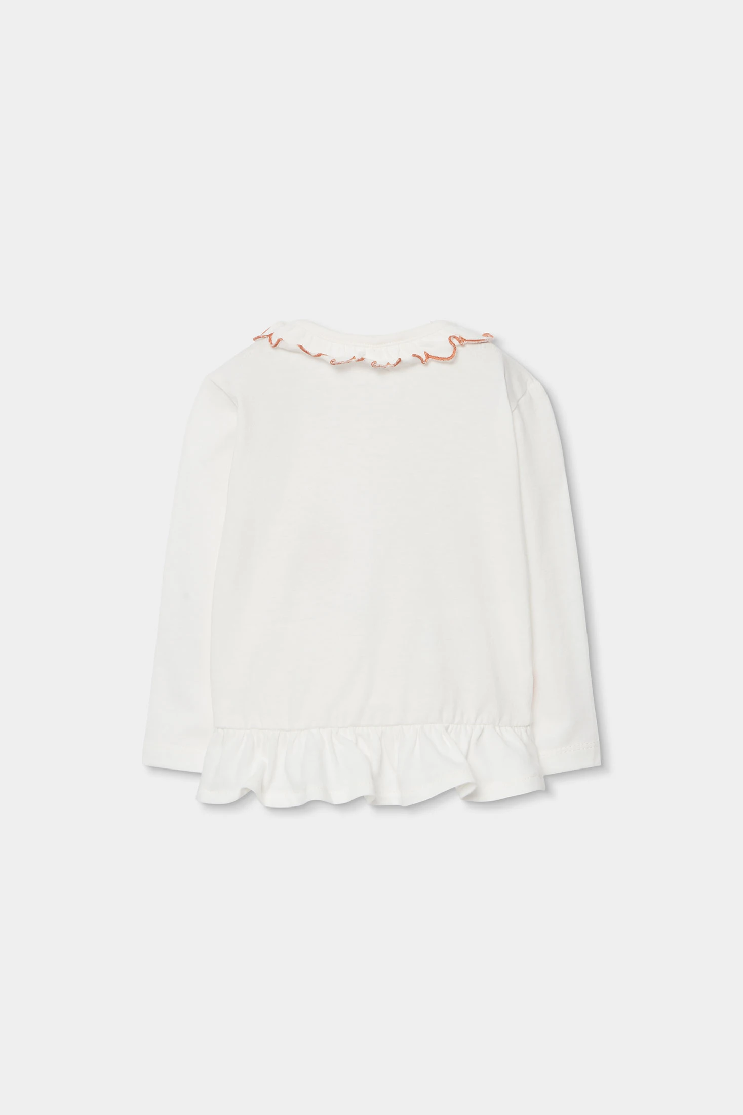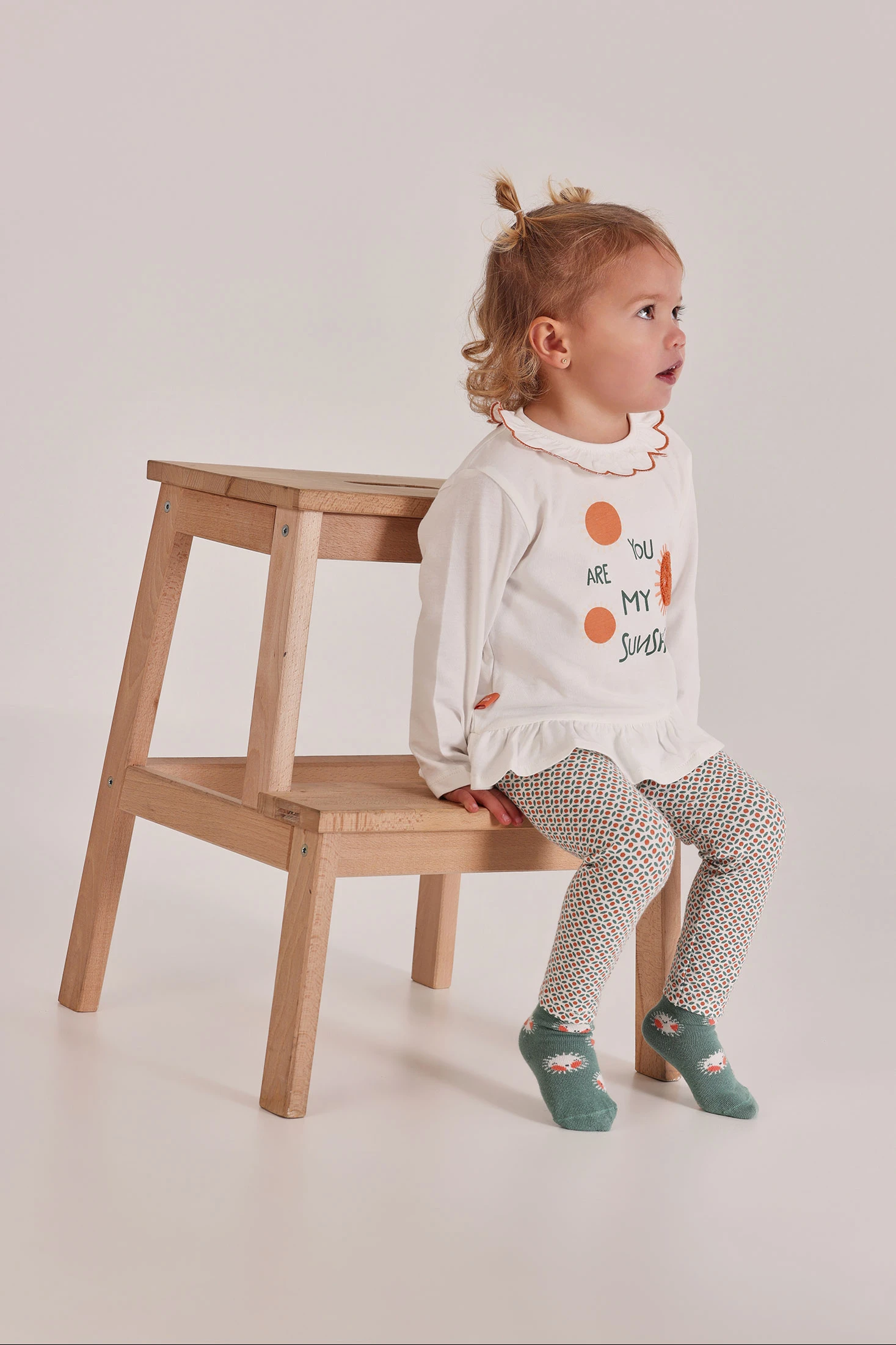Completo in maglia di cotone e cotone elasticizzato per neonata, da 1 mese fino ai 24 mesi. Maglietta bianca a maniche lunghe con disegno di un sole e la frase "You are my sunshine", aggiungendo un tocco allegro. Colletto con un delicato bordo ondulato a contrasto e bottoni a pressione sulla spalla per facilitare il cambio. Pantaloni con un attraente motivo geometrico nei toni dell'arancione e blu. Tessuto morbido e confortevole con elasticità, assicura libertà di movimento. Ideale per un look casual e allegro.