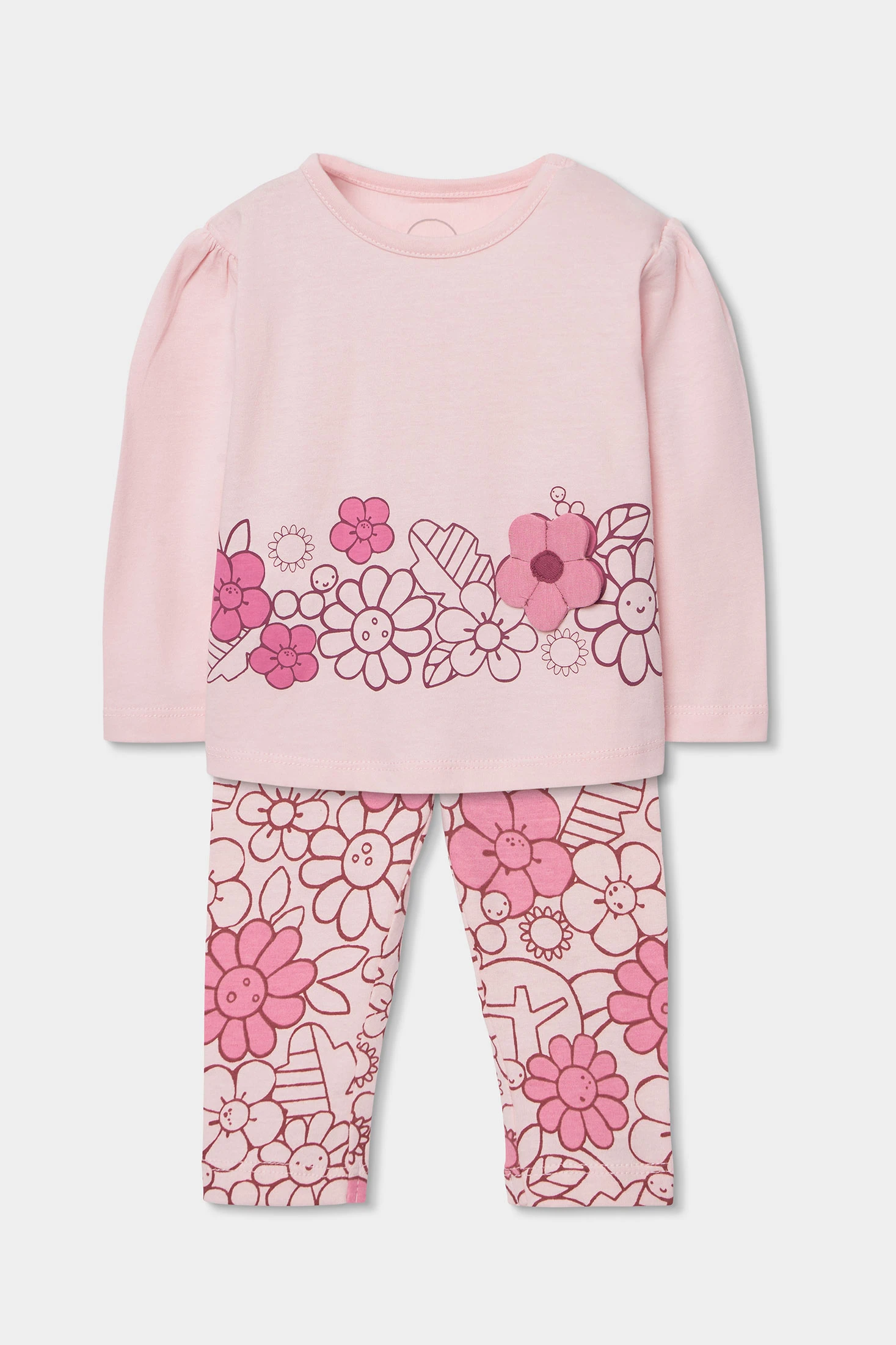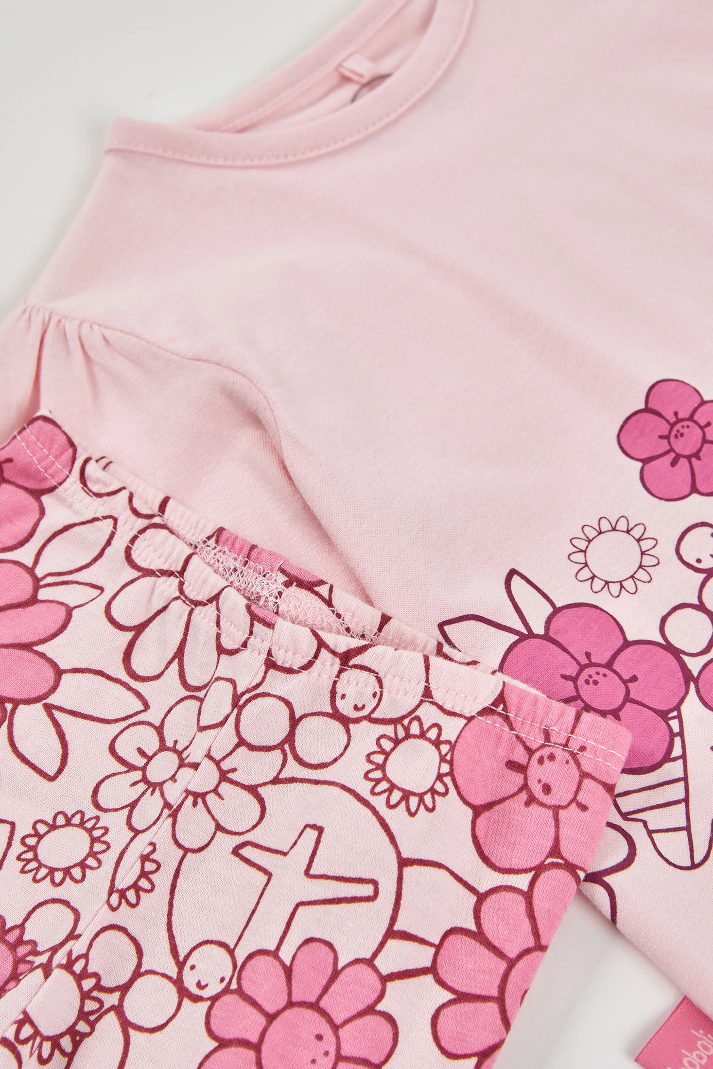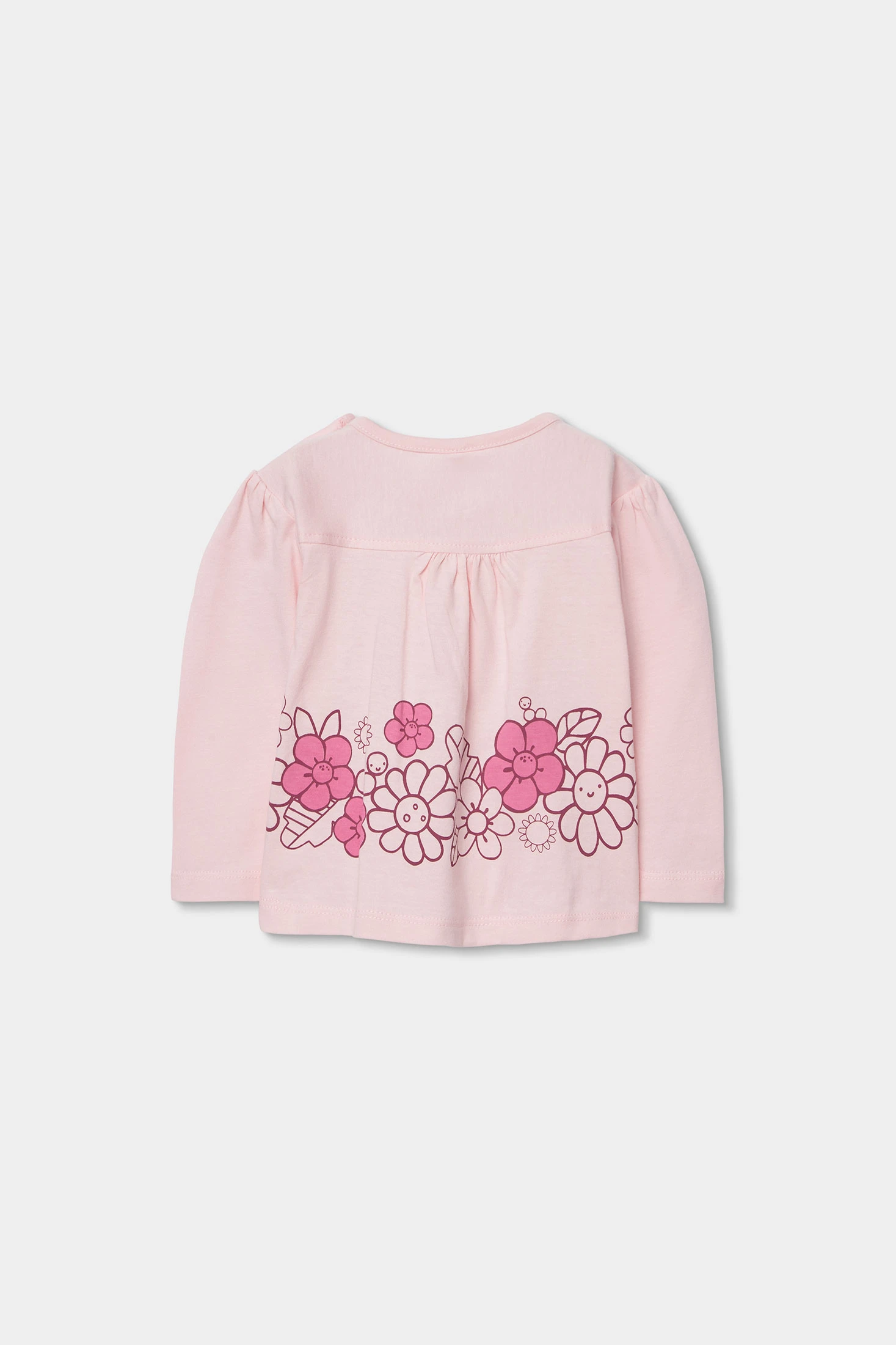 Set di maglia di cotone rosa per bambina, ideale per neonate. Presenta un design con stampa floreale in tonalità rosa, offrendo un tocco dolce e stilizzato. Il suo tessuto è morbido e comodo, perfetto per la delicata pelle del bebé. Ideale per età da 1 mese fino a 24 mesi. Le maniche lunghe sono perfette per i giorni più freschi, essendo un'opzione versatile per tutti i giorni.