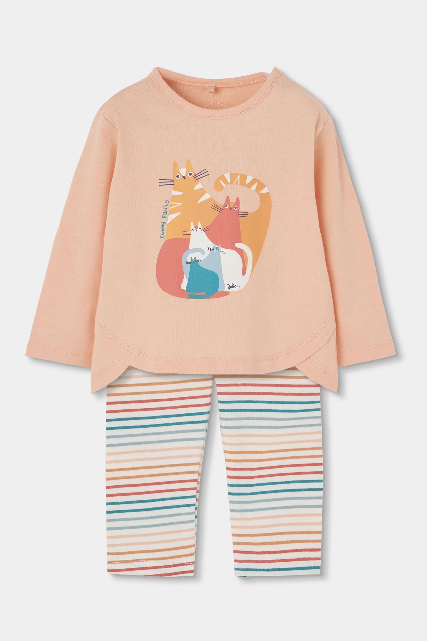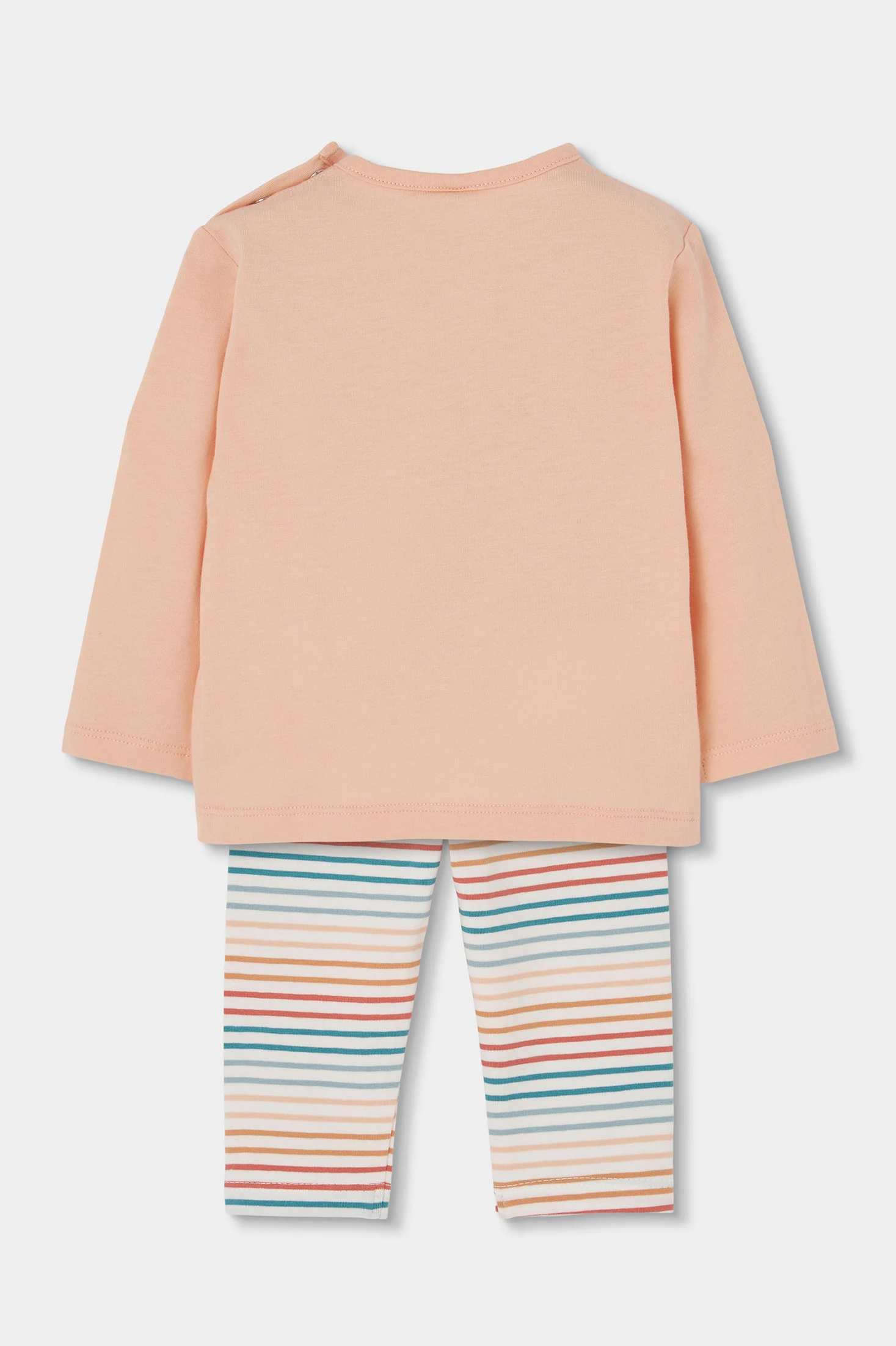 Set di maglietta e pantaloni per bambina, in morbido cotone arancione chiaro, ideale per i più piccoli. La maglietta presenta una stampa di simpatici animali, mentre i pantaloni hanno un design a righe colorate. Con taglie da 1 mese a 24 mesi, questo set è perfetto per il comfort quotidiano e il gioco. Il suo tessuto di cotone e il cotone elasticizzato dei pantaloni offrono morbidezza e calore. Un set pratico e incantevole per aggiungere un tocco di colore al guardaroba del tuo bebé.