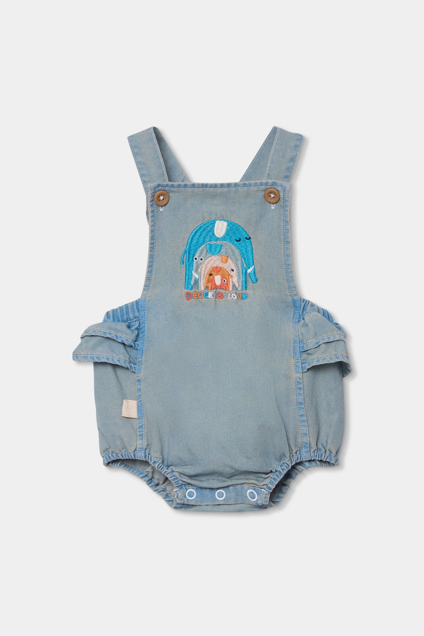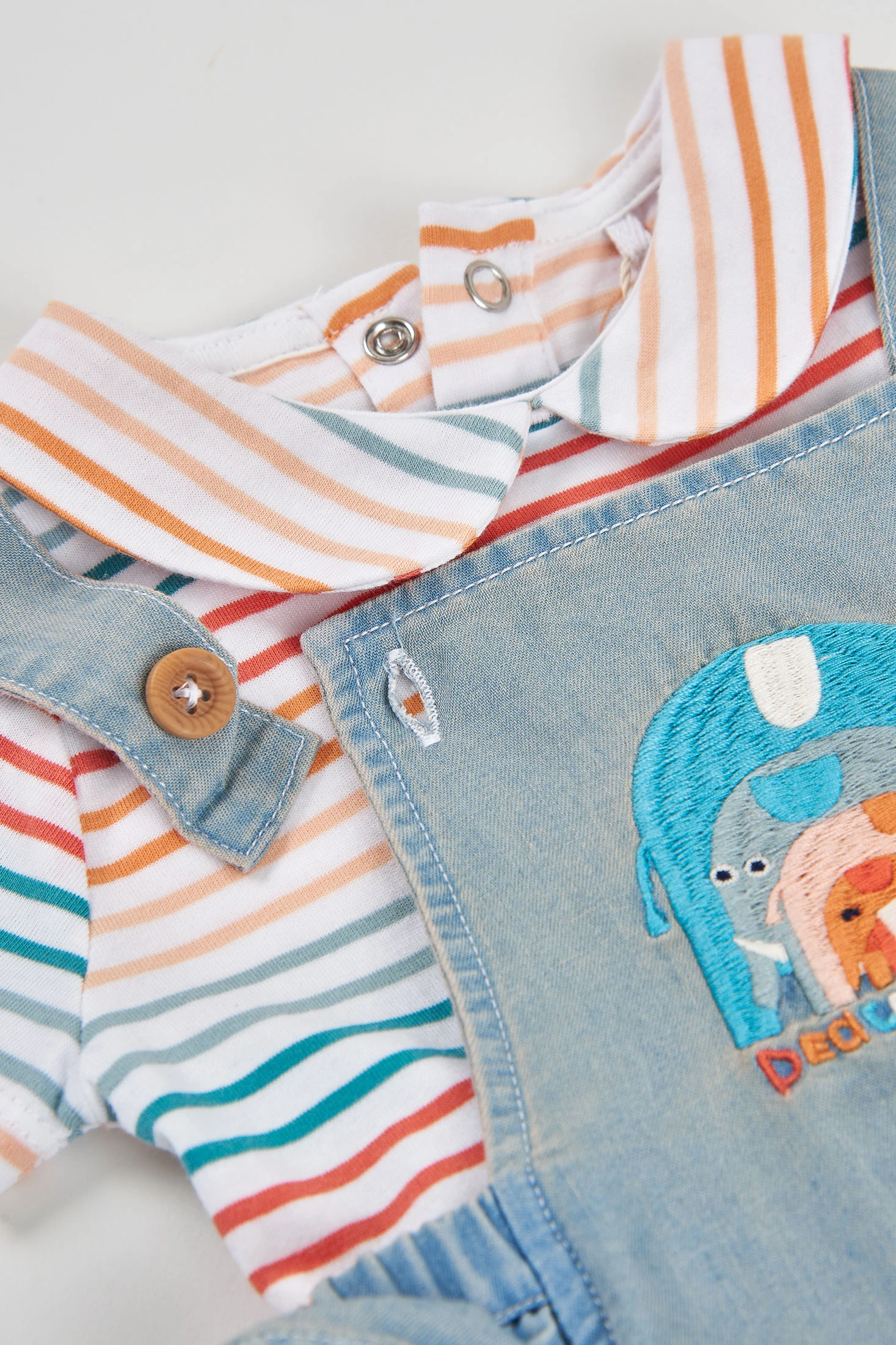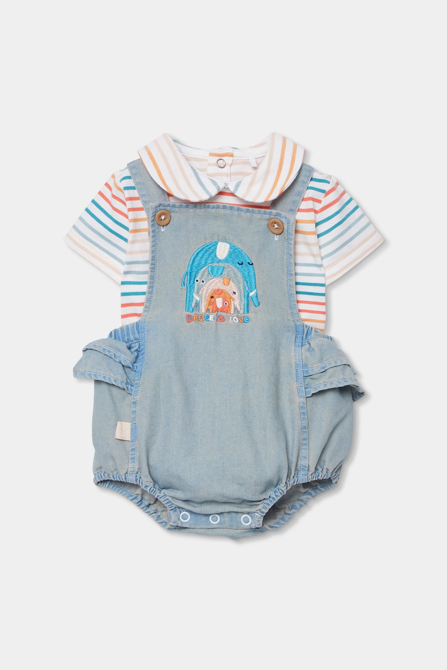 Set per neonato ideale per neonati, realizzato in cotone. Disponibile in taglie da 1 mese a 12 mesi. Il design include una salopette di jeans di colore azzurro chiaro con volant e un ricamo di adorabili animali e le lettere "Peace & Love". Una camicia a righe multicolori con collo rotondo, che offre uno stile dolce e moderno. Bottoni e automatici facilitano il cambio del pannolino. Perfetto per occasioni casuali, combina comfort e stile per i primi mesi del tuo bambino.