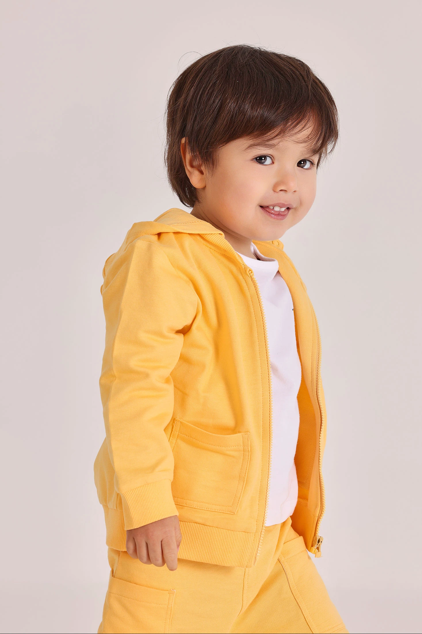 Giacca in pile gialla per bebé, ideale per tenere al caldo il tuo piccolo nei giorni più freschi. Realizzata con tessuto morbido, offre comfort e calore. Il design include un cappuccio e una chiusura a cerniera, che ne facilita l'indossamento. Dispone di due pratiche tasche frontali. Le taglie vanno da 1 mese a 24 mesi. È un capo versatile che può essere facilmente abbinato a pantaloni o salopette per un look confortevole e moderno.