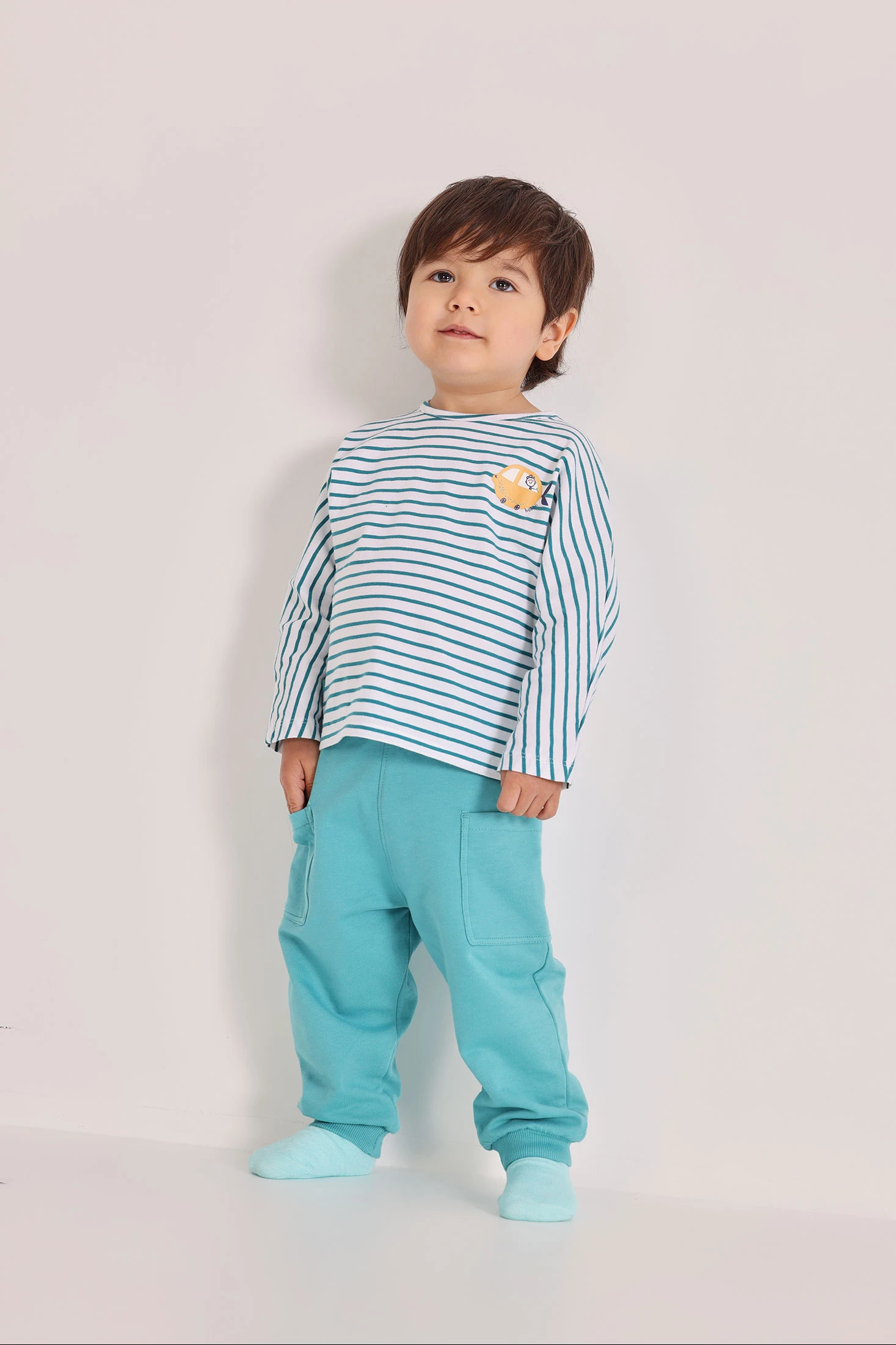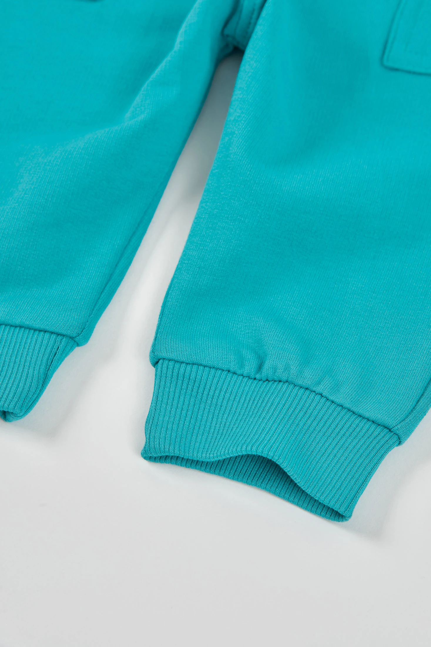 Pantaloni in pile di cotone blu turchese per neonato, ideali per i più piccoli. Il loro design comodo include due tasche frontali e una vita elastica che facilita la regolazione. Perfetti per bambini da 1 mese fino a 24 mesi. Il tessuto morbido offre comfort nell'uso quotidiano, ideale da abbinare con magliette di colori neutri per uno stile casual e allegro.