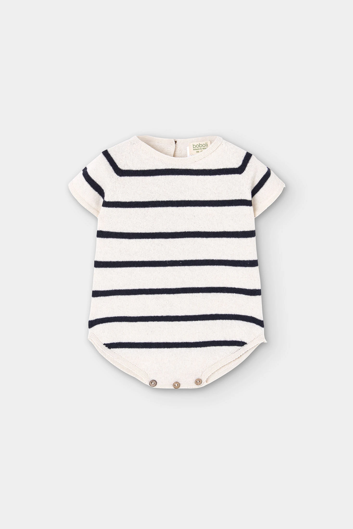 Tutina in maglia per neonato con design a righe. Appartiene alla capsule REBORN by Boboli, una collezione realizzata con filato riciclato post-consumo. Il tessuto leggero e traspirante assicura comfort per tutto il giorno, mentre i bottoni sul fondo facilitano il cambio del pannolino. Presenta scollo rotondo e maniche corte. Un capo basic versatile da indossare da solo o con una giacchina leggera.