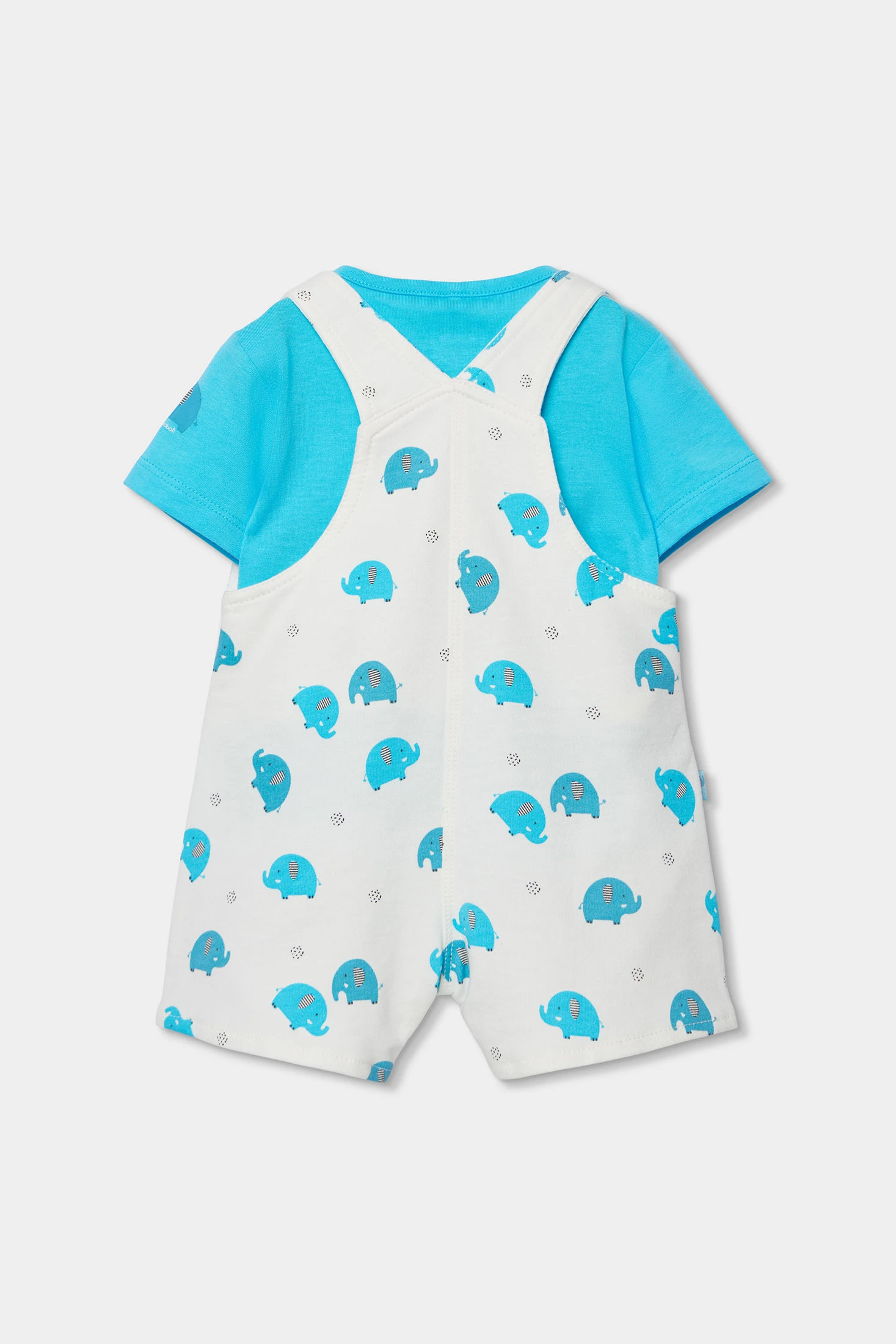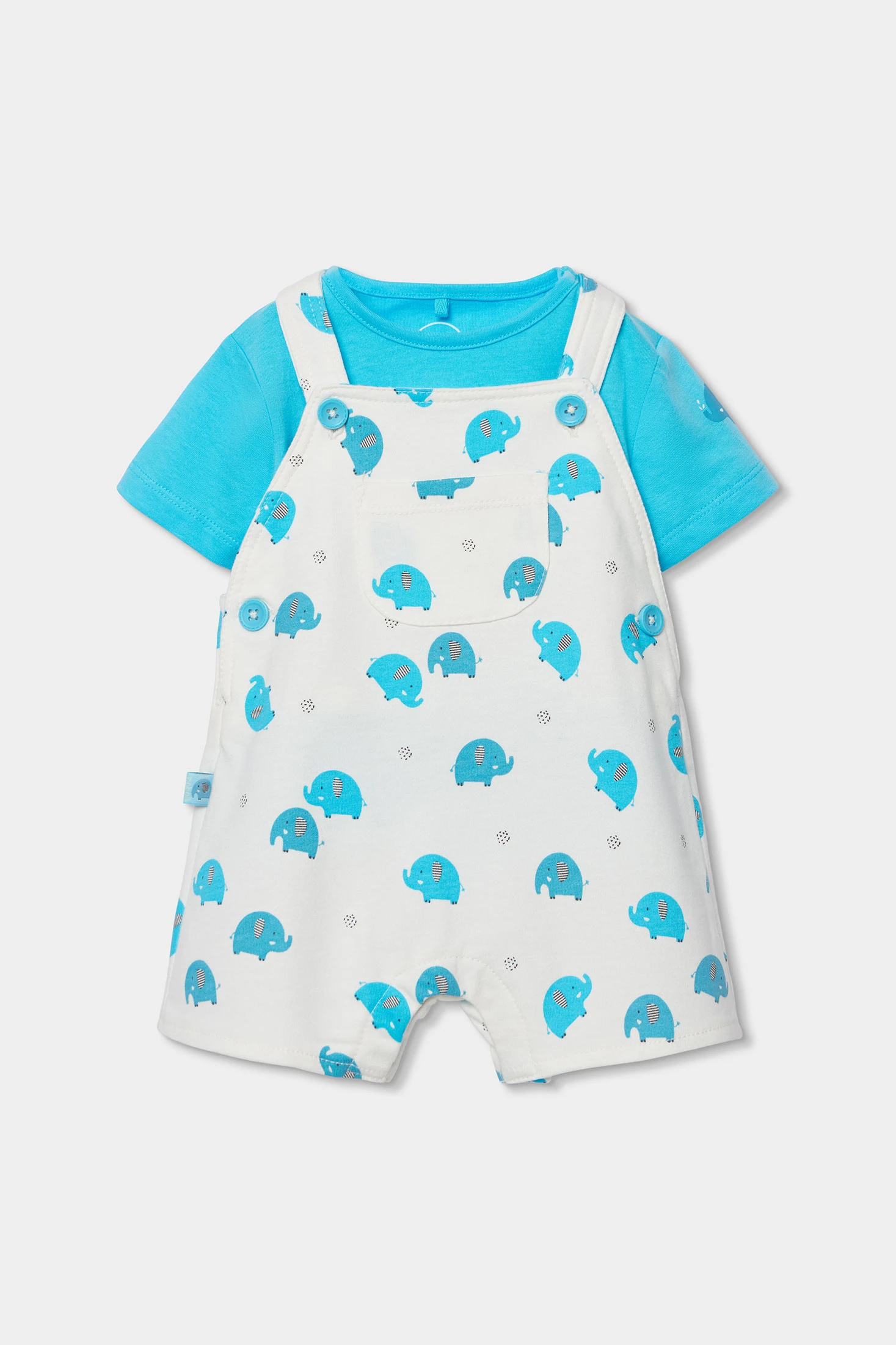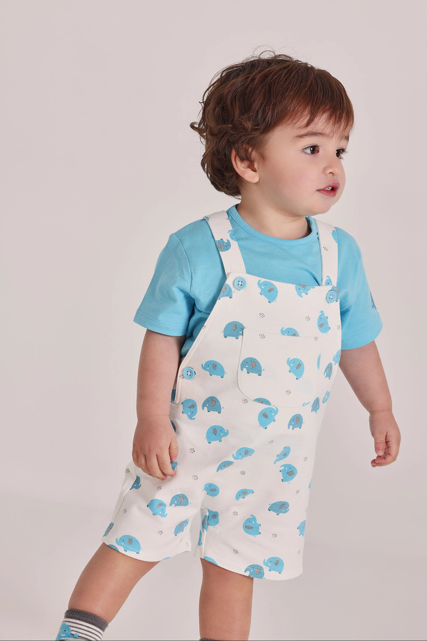 Set di salopette stampata per bambino in cotone, ideale per mantenere il tuo piccolo comodo. Presenta un design con divertenti elefanti di colore blu su sfondo bianco, apportando un tocco divertente. Le taglie disponibili vanno da 1 mese a 24 mesi, adattandosi alla crescita del bambino. Maglietta di colore blu brillante aggiunge un contrasto vivace. Con bretelle regolabili e bottoni laterali, questo set è facile da indossare. Perfetto per uno stile casual e allegro, ideale per i giorni più caldi.