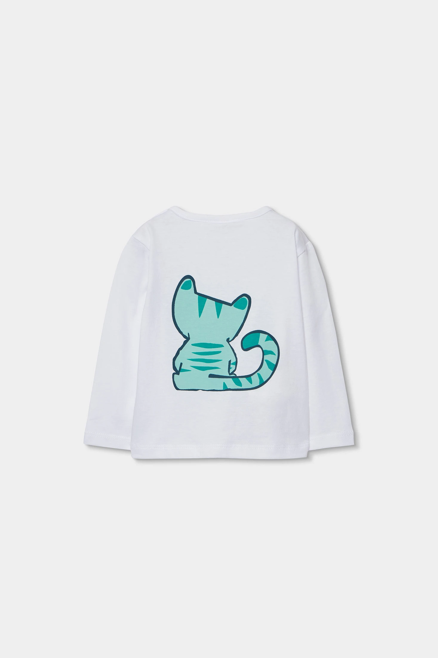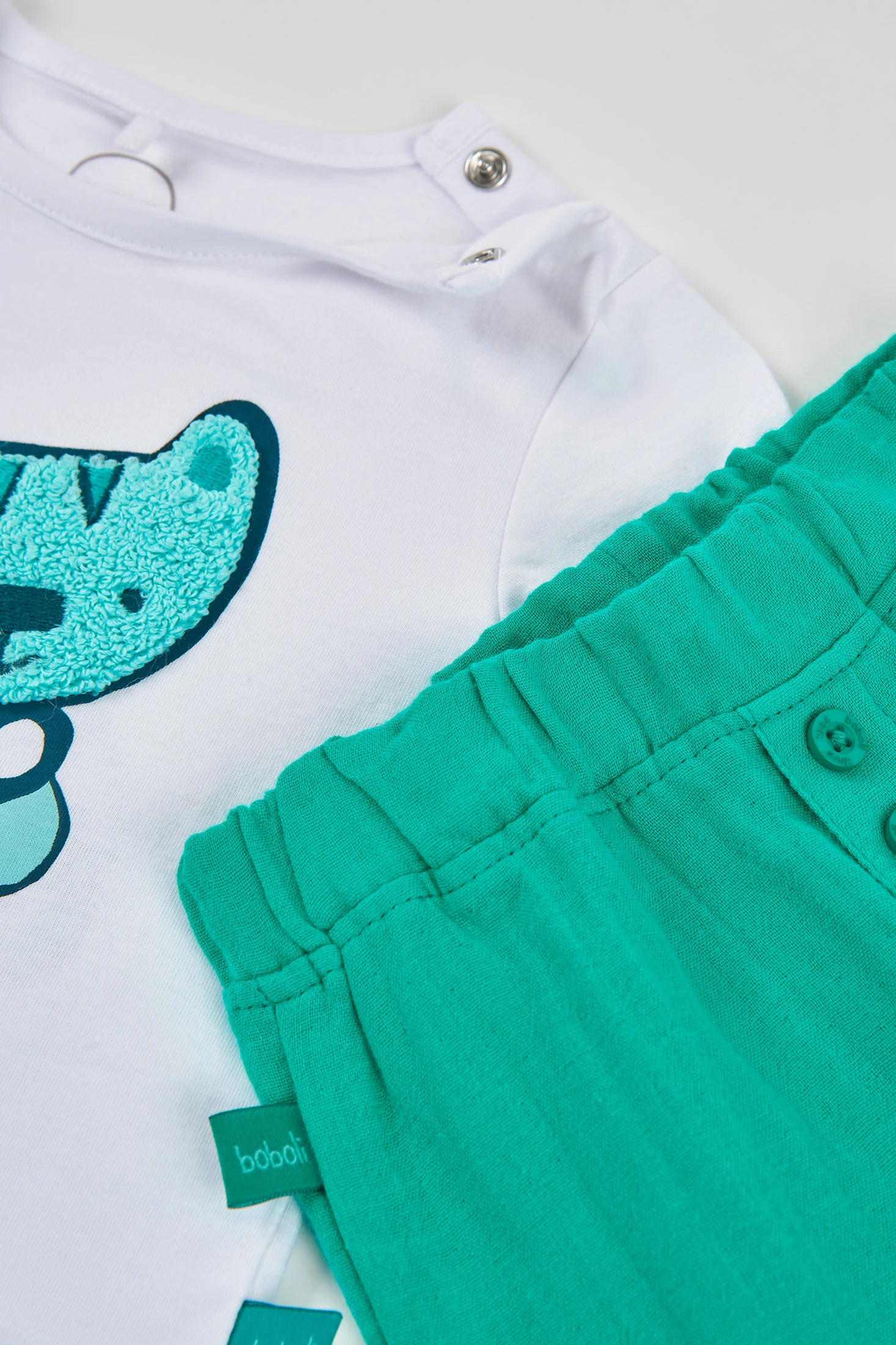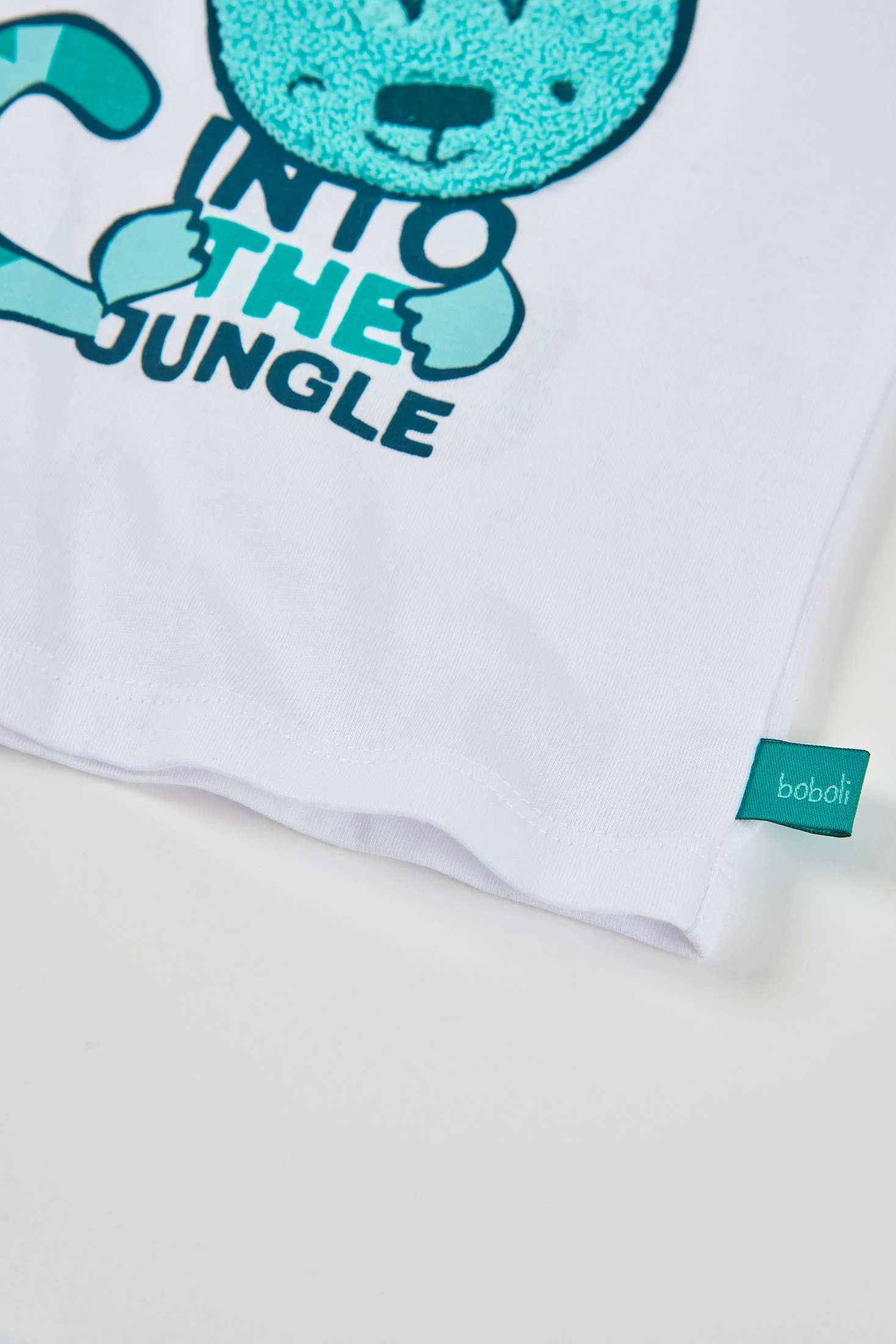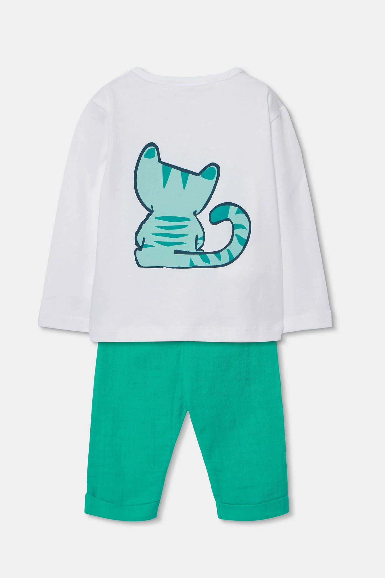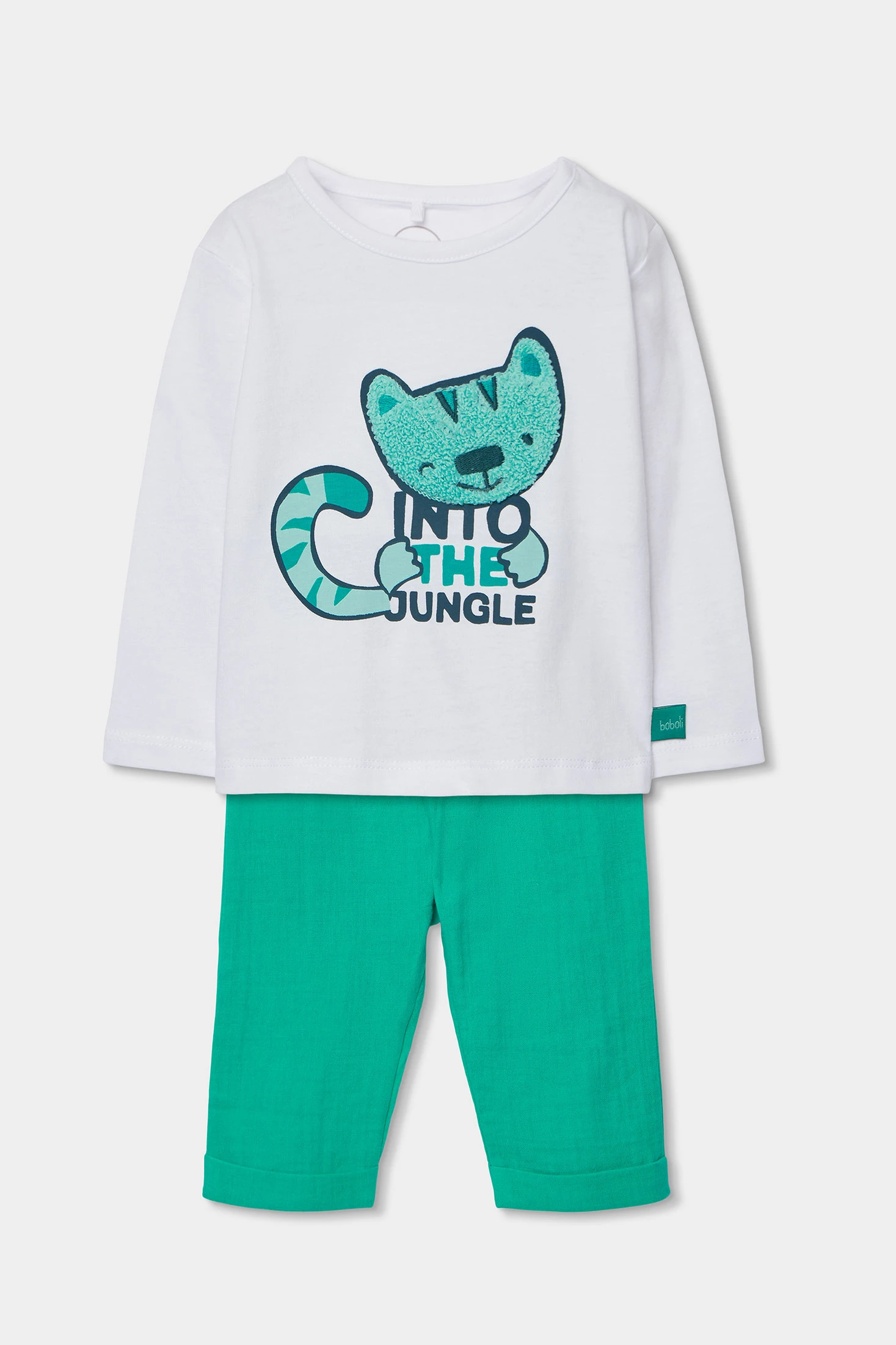 Completo per neonato realizzato in cotone bianco, ideale per neonati. Il design presenta l'illustrazione di una simpatica tigre accompagnata dal testo "Into the Jungle". La maglietta ha maniche lunghe per maggiore calore, mentre i pantaloni sono di un vivace colore verde, offrendo una combinazione divertente e animata. Disponibile in taglie da 0 mesi a 24 mesi, adattandosi alla rapida crescita del neonato. Perfetto per mantenere il tuo piccolo comodo e alla moda in qualsiasi occasione.