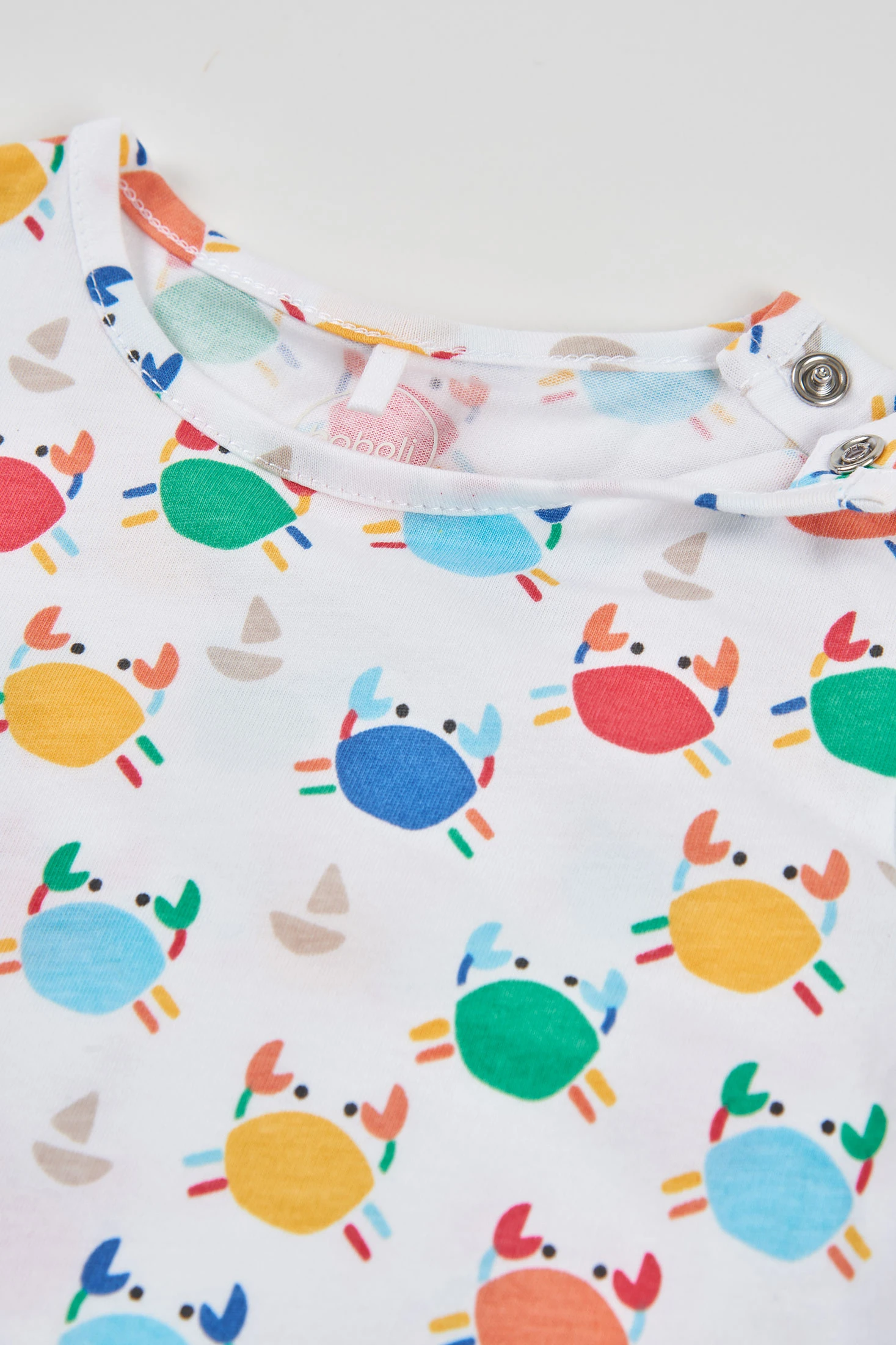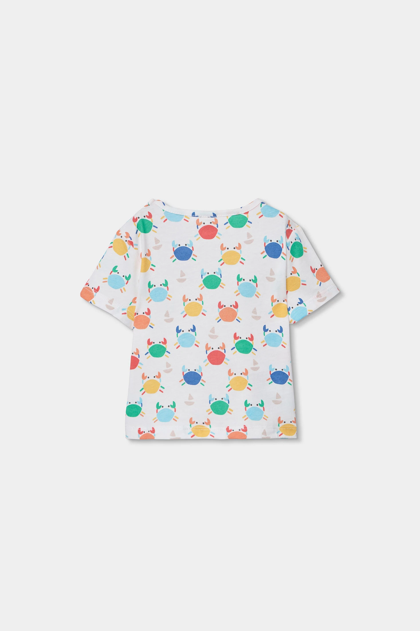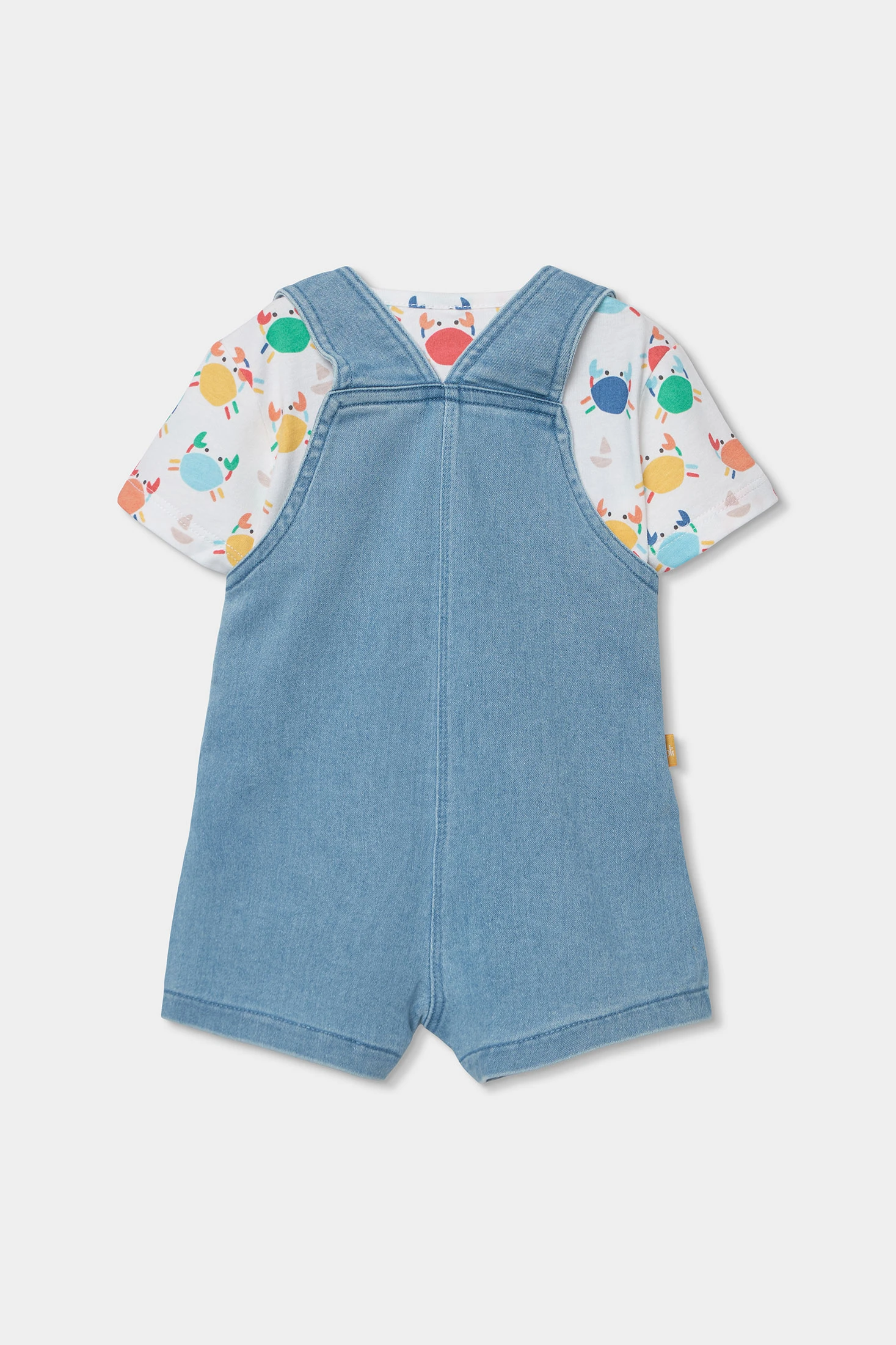 Completo per bambino che combina una maglietta stampata in cotone con un pantaloncino con bretelle in denim. La maglietta presenta disegni dai colori vivaci su uno sfondo bianco, mentre la salopette ha un divertente design di granchio ricamato. Realizzato per offrire comfort, è ideale per le età da 1M a 24M. Perfetto per l'uso quotidiano, combinando stile e funzionalità, si distingue per il suo tessuto fresco e morbido per i bambini.