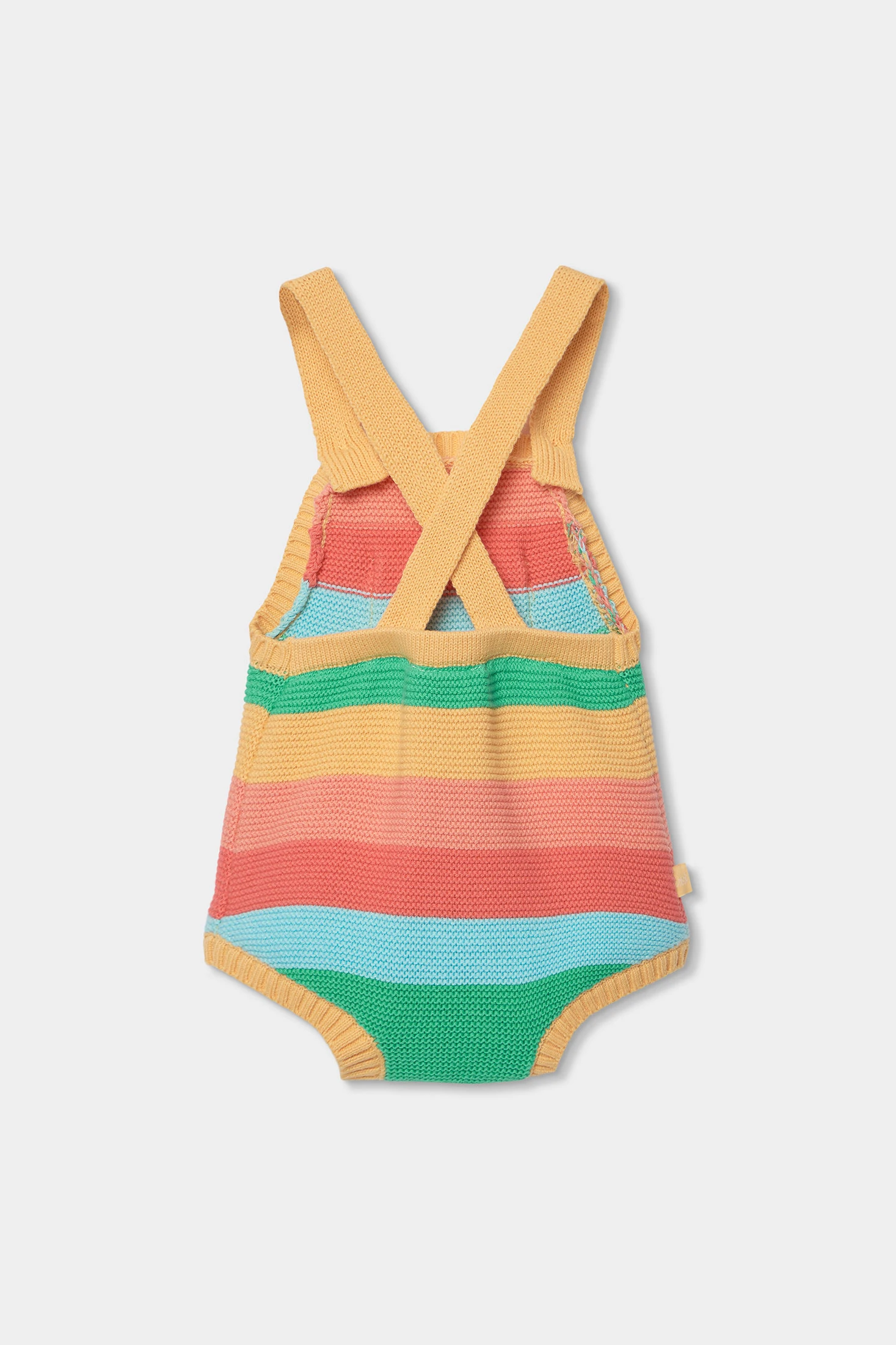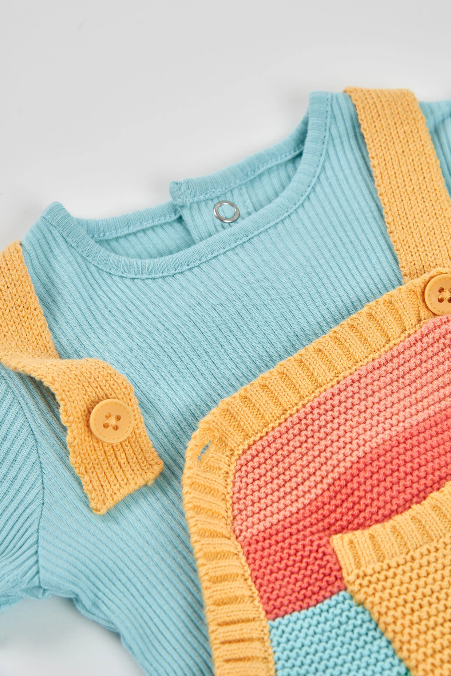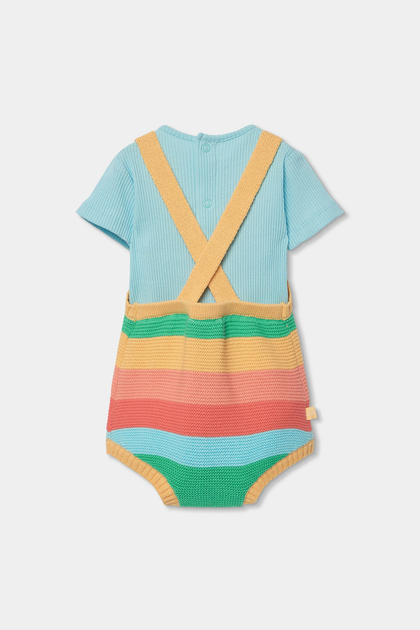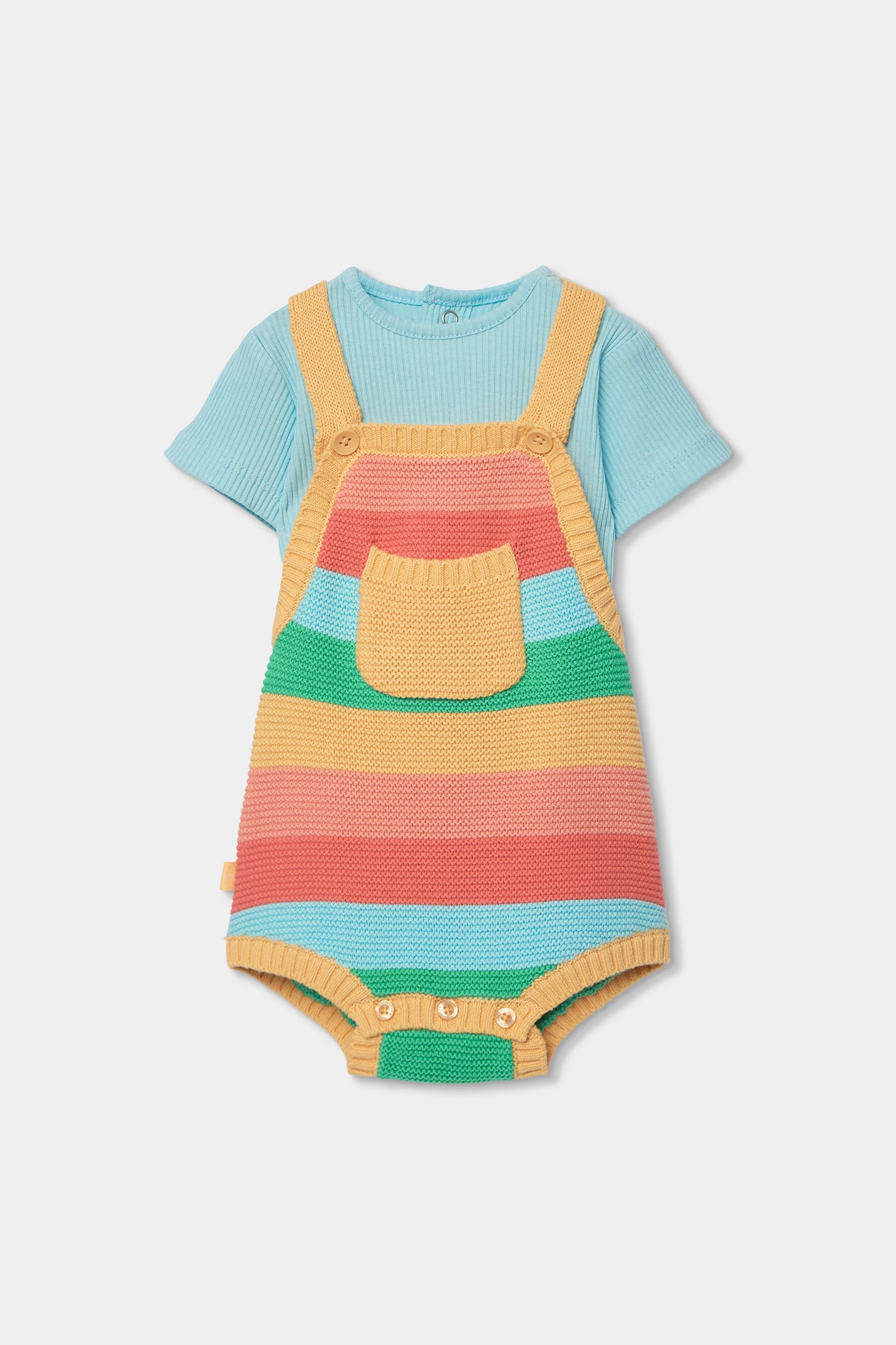 Il completo per bebè in cotone presenta un design a righe multicolore, ideale per un look allegro e comodo. Include una maglietta a maniche corte in azzurro chiaro e una salopette in maglia a righe nei toni del verde, rosso, giallo e blu. È perfetto per la delicata pelle del bebè. È disponibile in taglie da 1 mese a 12 mesi. Il suo stile colorato lo rende perfetto per qualsiasi uscita informale, combinando comodità con un tocco divertente e moderno.
