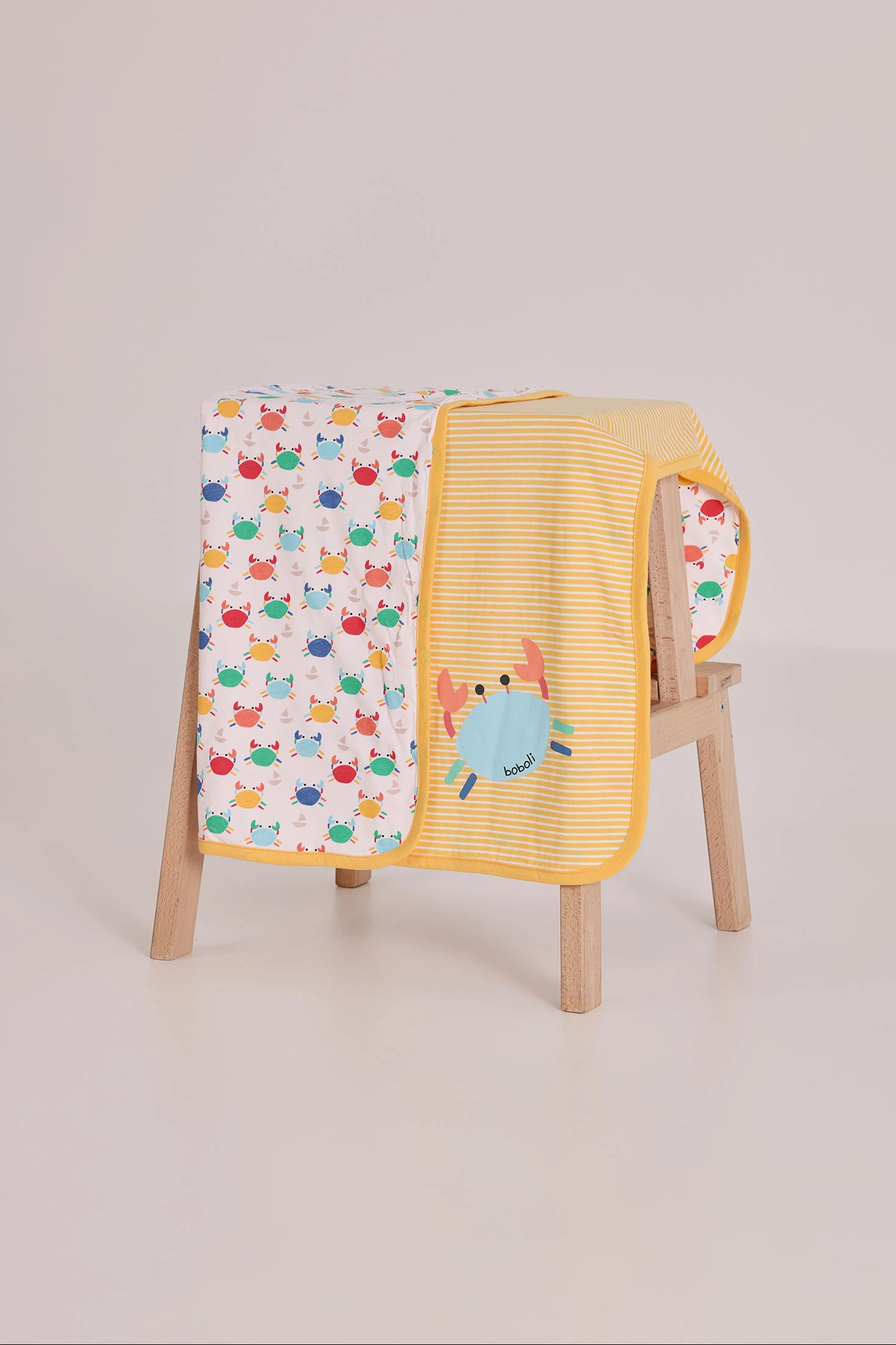 Coperta di cotone per bambino, ideale per neonati. Il suo design presenta una stampa divertente di righe gialle e piccoli granchi colorati sul retro. Il materiale è morbido e traspirante, perfetto per mantenere il tuo bambino comodo e al caldo. Leggera, facile da trasportare e può essere usata sia a casa che nel passeggino. Un accessorio pratico e con uno stile allegro per ogni occasione.
