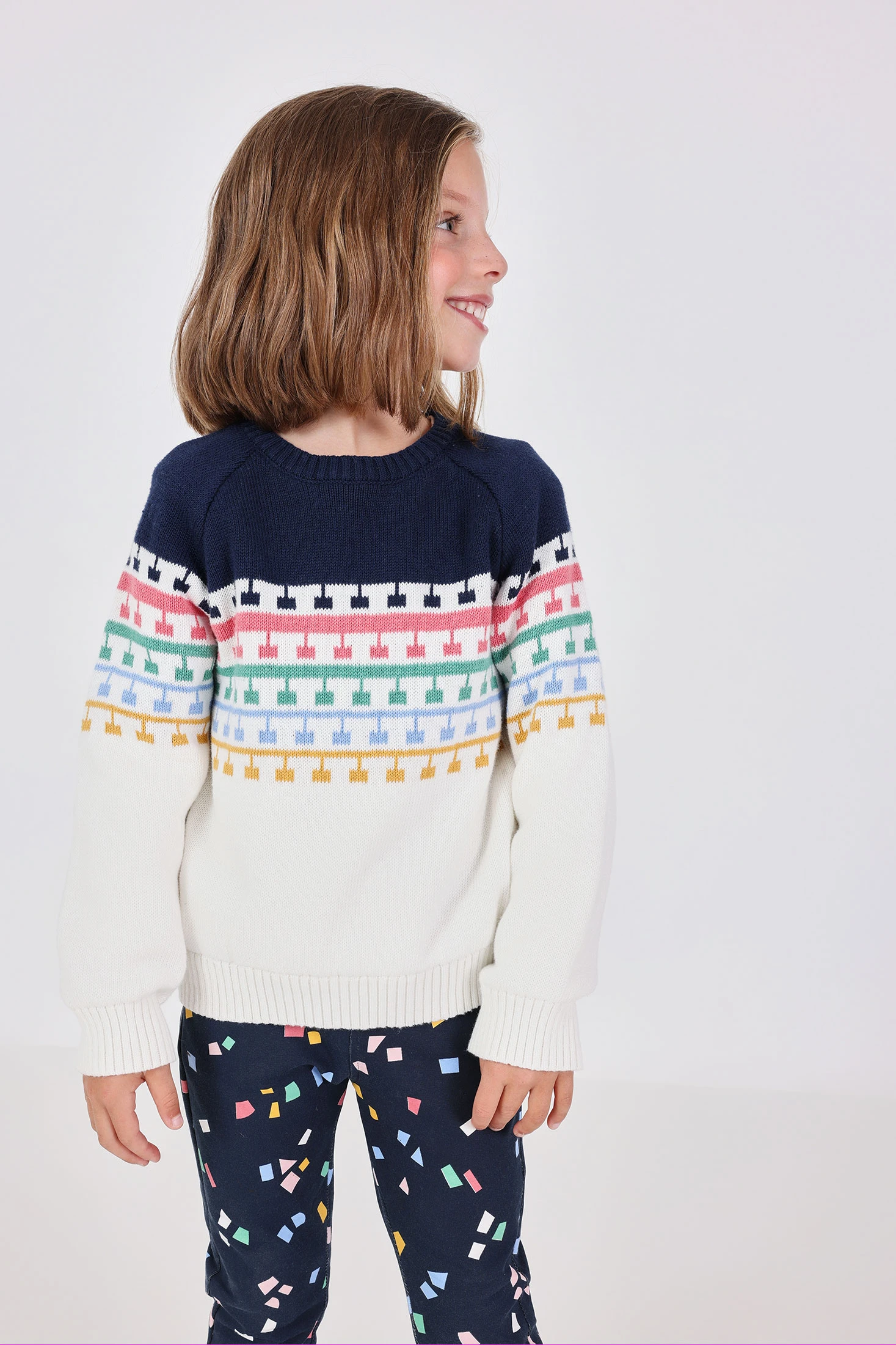 Maglione in maglia per bambina di colore bianco con design geometrico, perfetto per le stagioni autunnali e invernali, offrendo calore e comfort. Realizzato in un materiale morbido, garantisce che siano ben coperti. Il pratico scollo rotondo con bottoni ne facilita l'indossamento. Disponibile nelle taglie da 12 mesi a 10 anni, questo maglione è versatile e può essere abbinato a pantaloni o leggings per ottenere uno stile casual e confortevole. Il design senza tempo rende questo capo un essenziale nel guardaroba infantile.