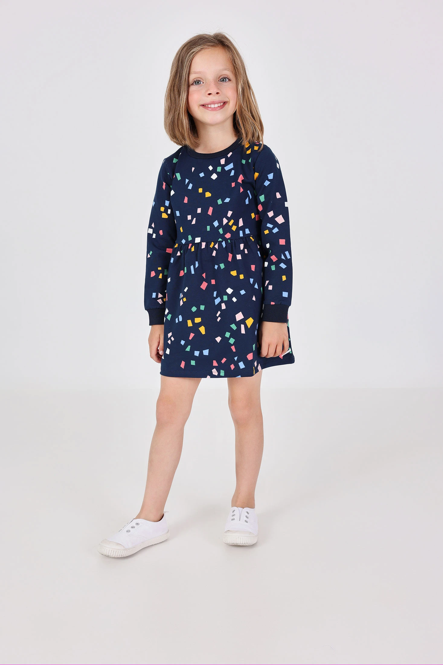 Abito in maglia per bambina, con una delicata stampa geometrica di vari colori che aggiunge un tocco di dolcezza e freschezza al guardaroba della tua piccola. Realizzato in morbido cotone, garantisce comfort per tutto il giorno. Disponibile in taglie da 12 mesi a 10 anni, è perfetto per l'autunno, offrendo un'opzione leggera e traspirante. Abbinalo con un collant per occasioni speciali o uscite informali. Il suo design versatile e affascinante lo rende un capo essenziale nel guardaroba di qualsiasi bambina.