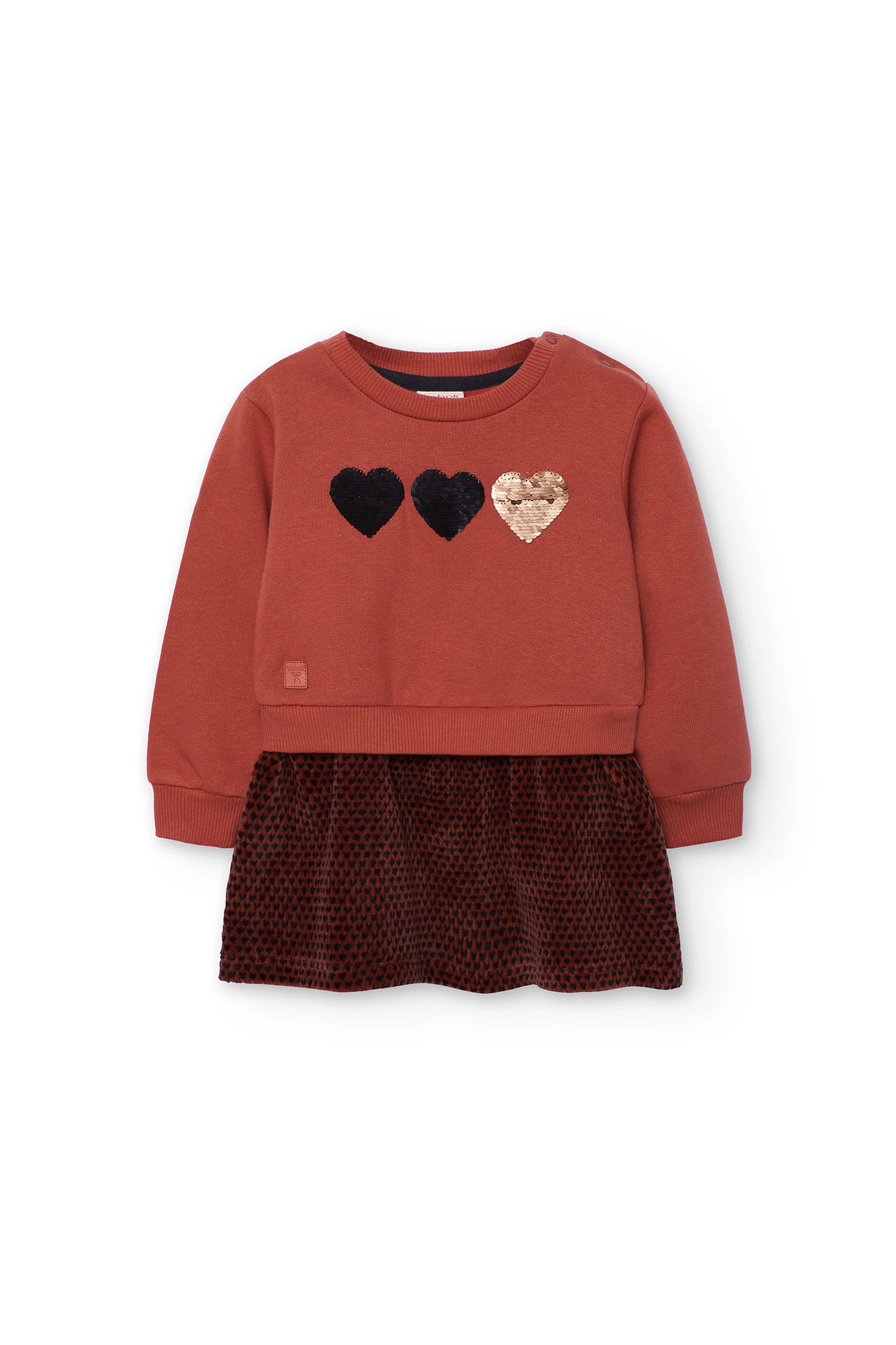 Vestito per bambina di colore arancione decorato con cuori, perfetto per la stagione autunnale e invernale. Realizzato in un materiale morbido e accogliente, offre calore e libertà di movimento. Design con scollo rotondo che consente di vestire la tua piccola con facilità. Disponibile in taglie da 12 mesi a 10 anni, si abbina idealmente con leggings o collant, assicurando un aspetto adorabile e confortevole per ogni occasione.