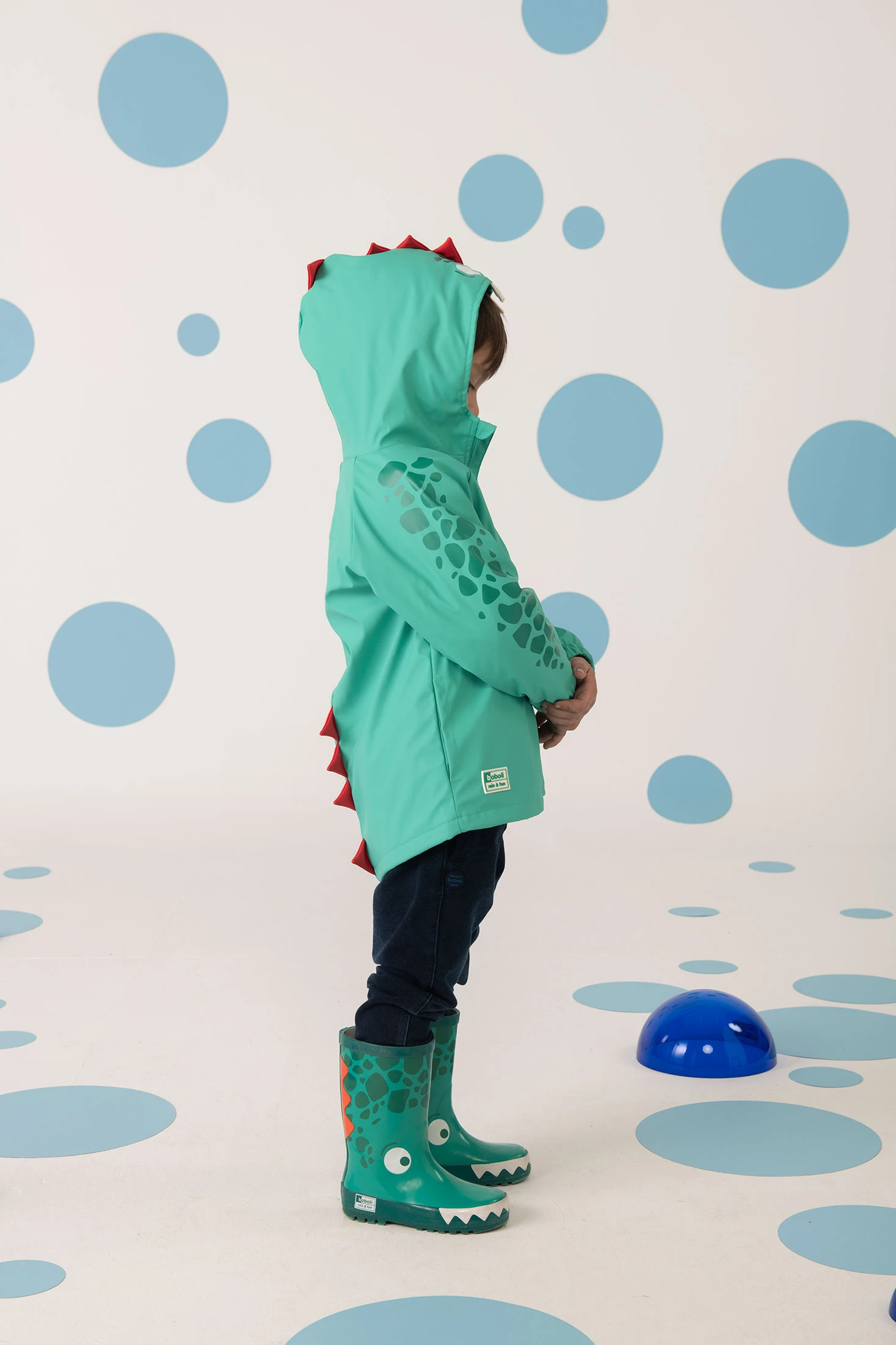 Impermeabile con cappuccio in azzurro turchese, progettato per mantenere i piccoli asciutti e comodi nei giorni di pioggia. Presenta una divertente stampa di sagome di animali e un cappuccio con applicazioni che imitano pinne, aggiungendo un tocco giocoso al completo. Realizzato in materiale tecnico, assicura un'eccellente protezione contro l'acqua. Disponibile nelle taglie da 2 a 12 anni, è dotato di una pratica cerniera frontale. Abbinatelo a capi colorati per ottenere un look allegro e funzionale durante le stagioni piovose.