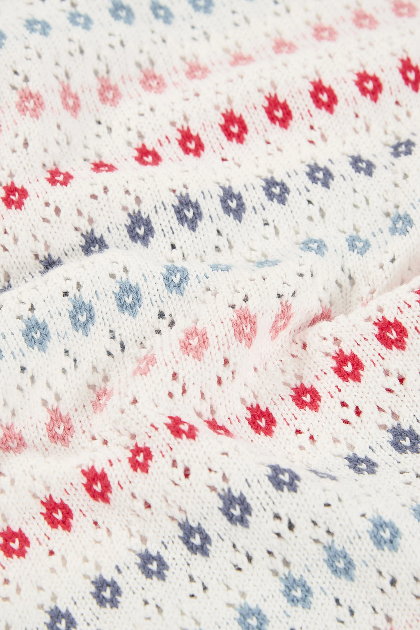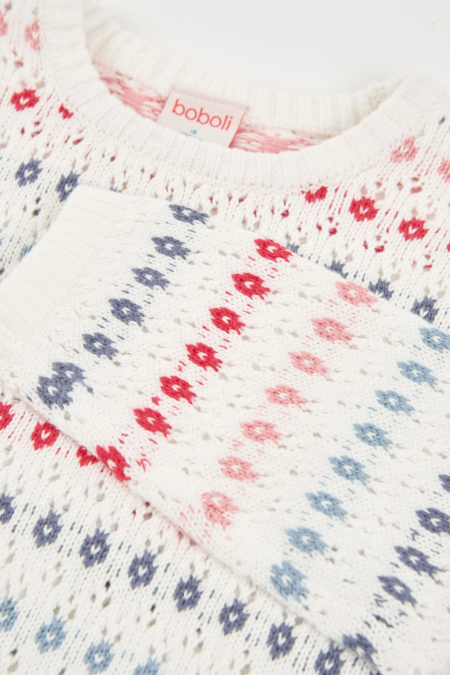 Maglione in cotone di colore bianco con trafori e combinato in tonalità azzurre e rosa. Il materiale in cotone garantisce morbidezza e calore, ideale per primavera-estate. Collo rotondo e manica lunga. Disponibile in taglie da 12 mesi a 10 anni, si adatta a diverse fasi di crescita. Può essere facilmente abbinato a pantaloni o gonne per un look casual e comodo.