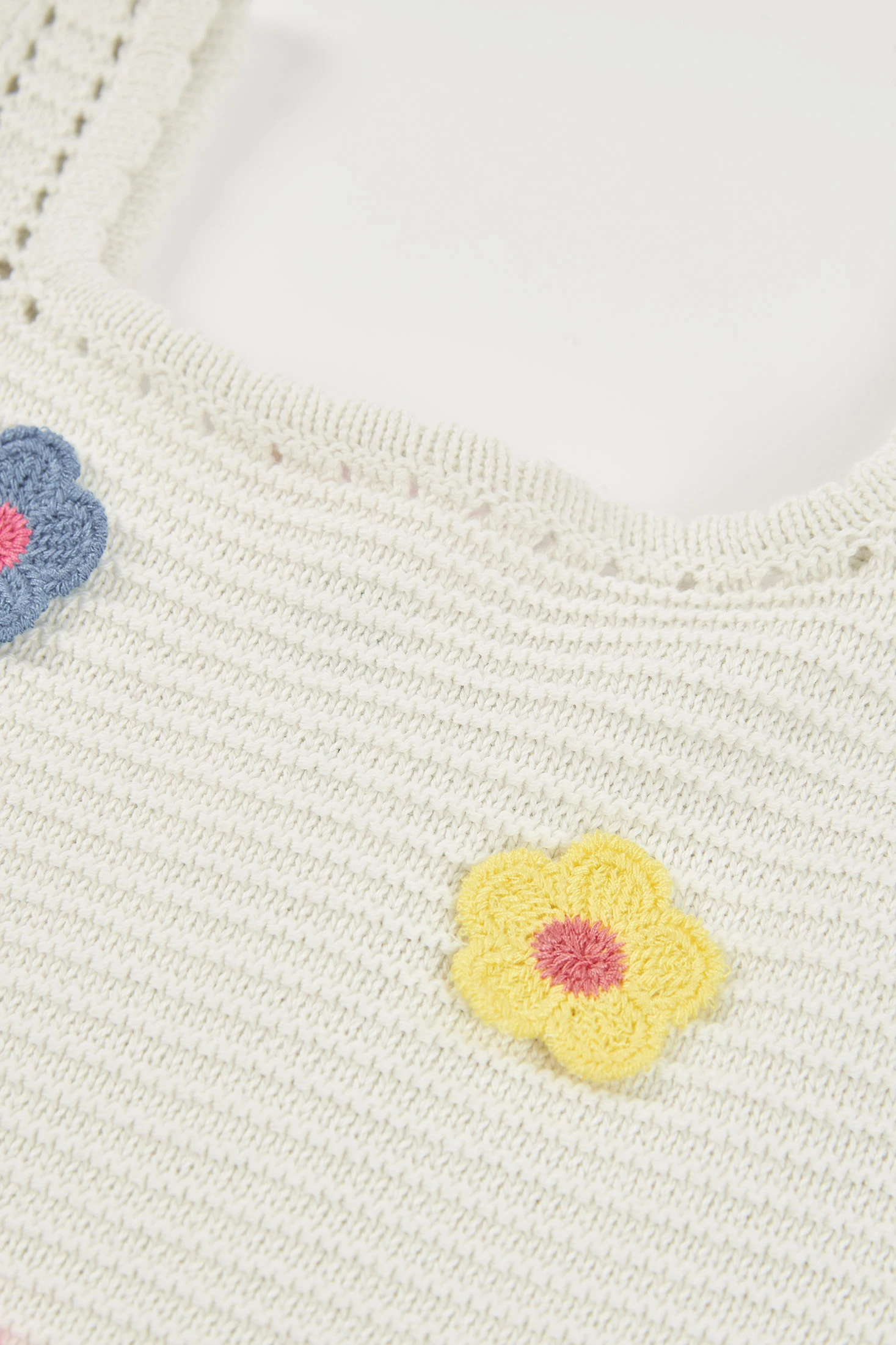 Top per bambina di colore perla. Realizzato in un tessuto di maglia di cotone, offre comfort e flessibilità. Presenta un design con fiori di crochet applicati in vari colori. Le taglie disponibili vanno dai 12 mesi ai 10 anni. Il suo colore neutro lo rende facile da abbinare con diversi capi, essendo un'opzione versatile per tutti i giorni. Perfetto da indossare sotto una giacca leggera o con una gonna casual, mantenendo sempre un look fresco e attuale.