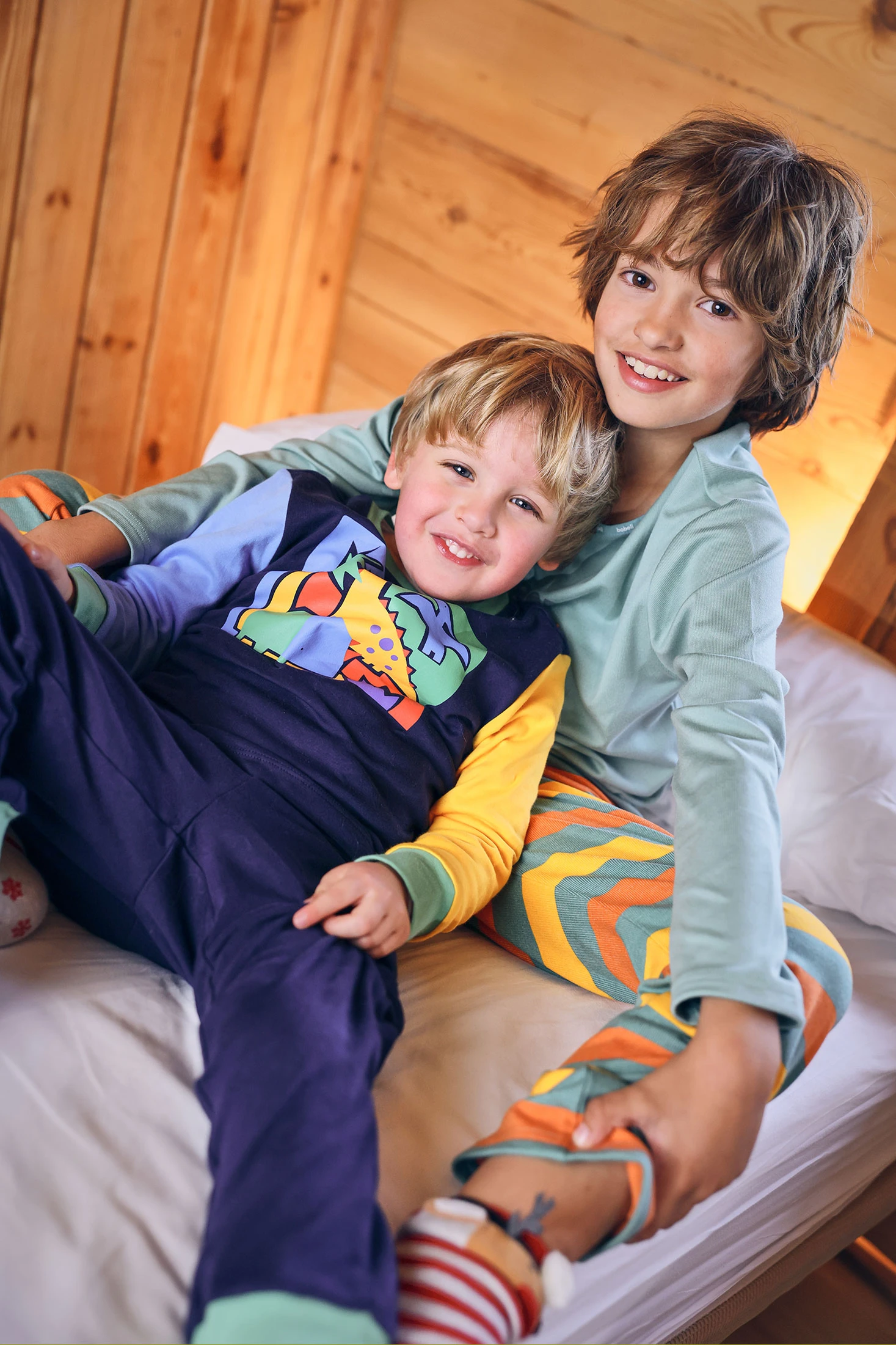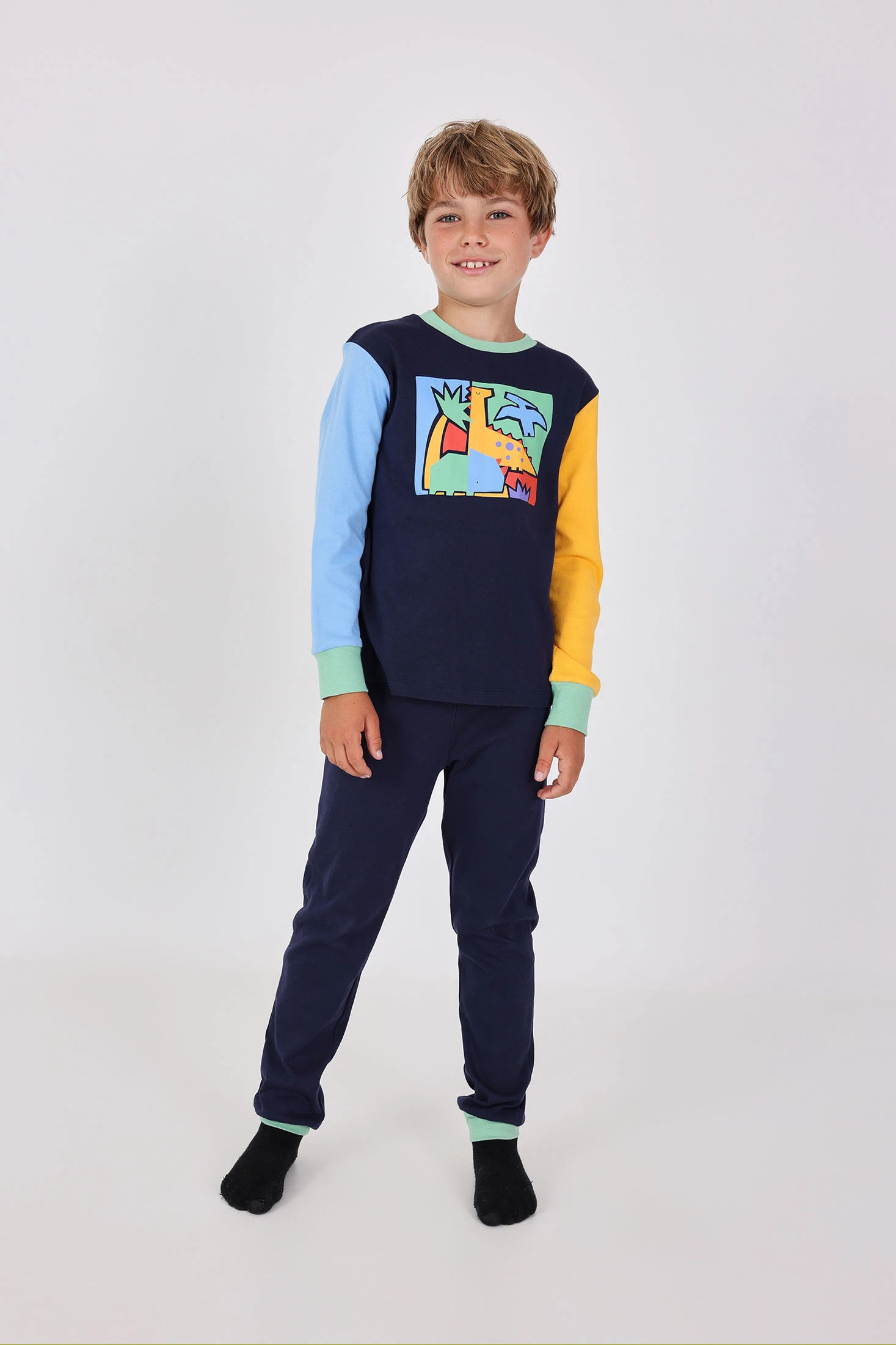 Pigiama in interlock con forme astratte di dinosauro per bambino, progettato per offrire comfort durante il riposo notturno. Realizzato con un tessuto morbido e traspirante, offre calore durante tutto l'anno ed è ideale per le notti più fredde. Il design colorato e con stampa astratta stimola l'immaginazione, garantendo allo stesso tempo una vestibilità comoda per notti tranquille. Disponibile in taglie da 2 a 14 anni, è un'opzione moderna e attraente per rinnovare il guardaroba notturno dei piccoli.